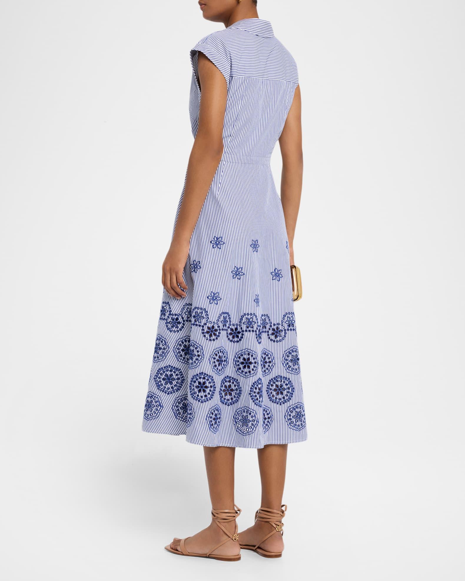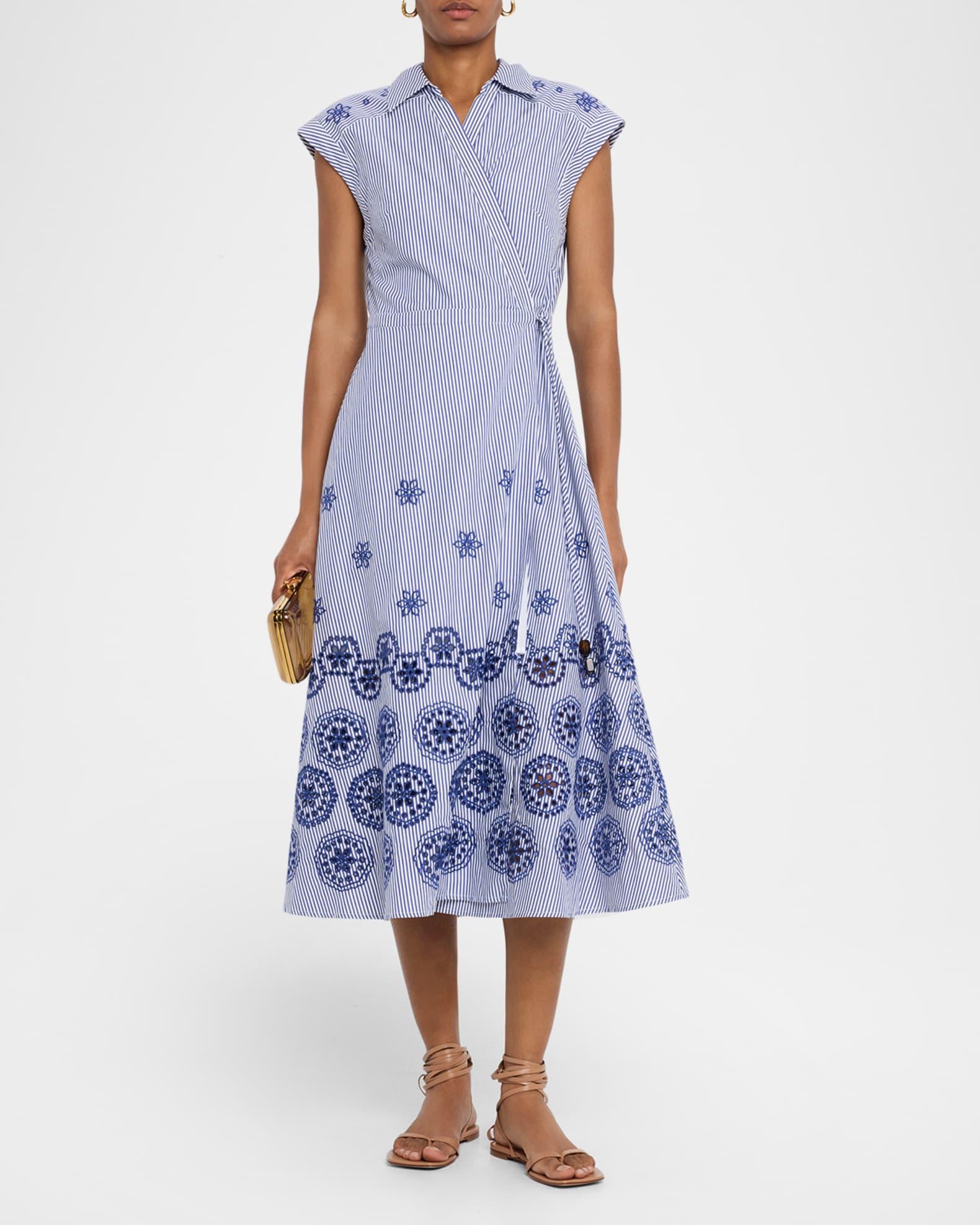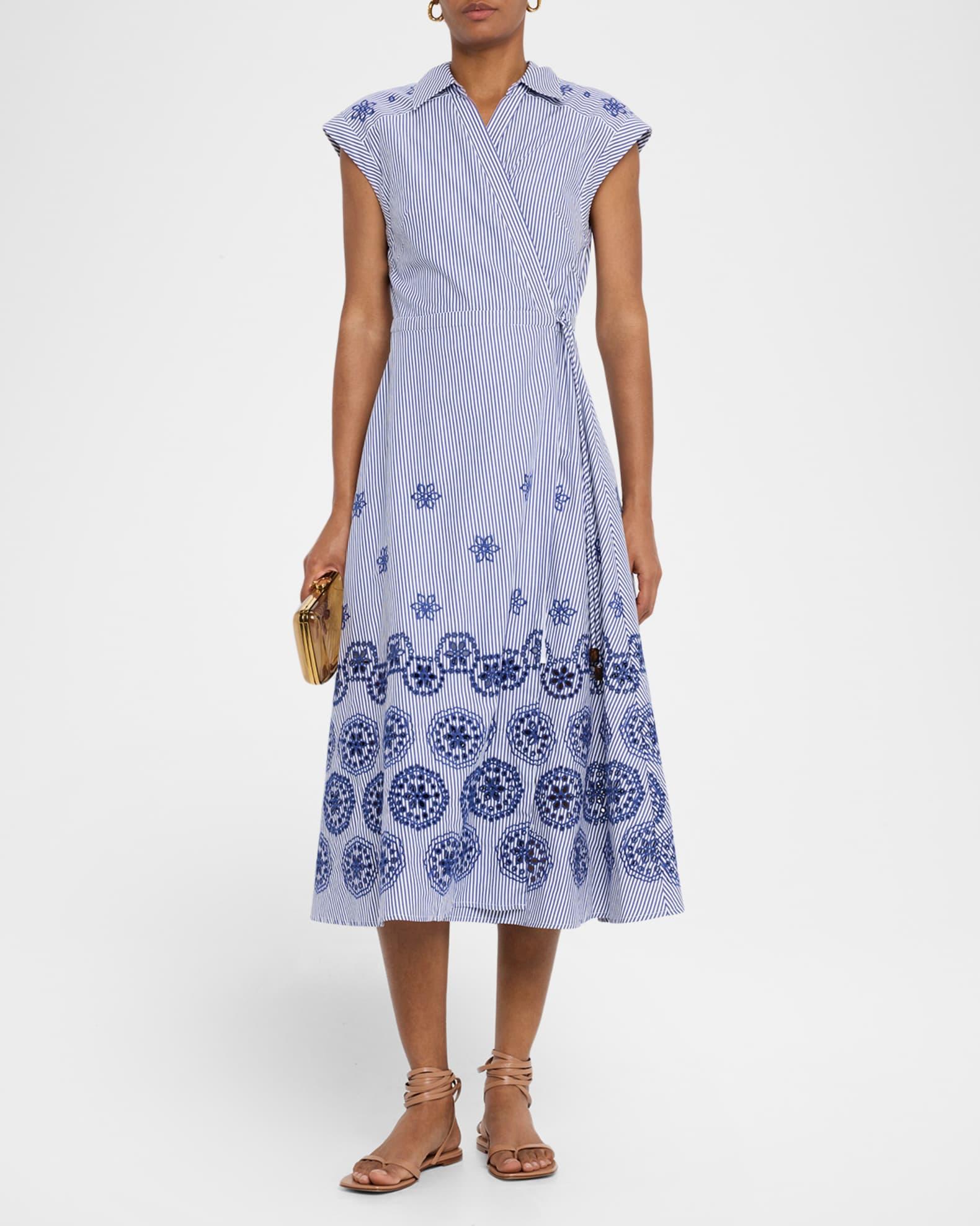 Tanya Taylor "Shivon" pinstripe wrap dress decorated with eyelet embroidery Point collar Cap sleeves A-line silhouette Hem falls below the knee Side tie closure Cotton Dry clean Imported