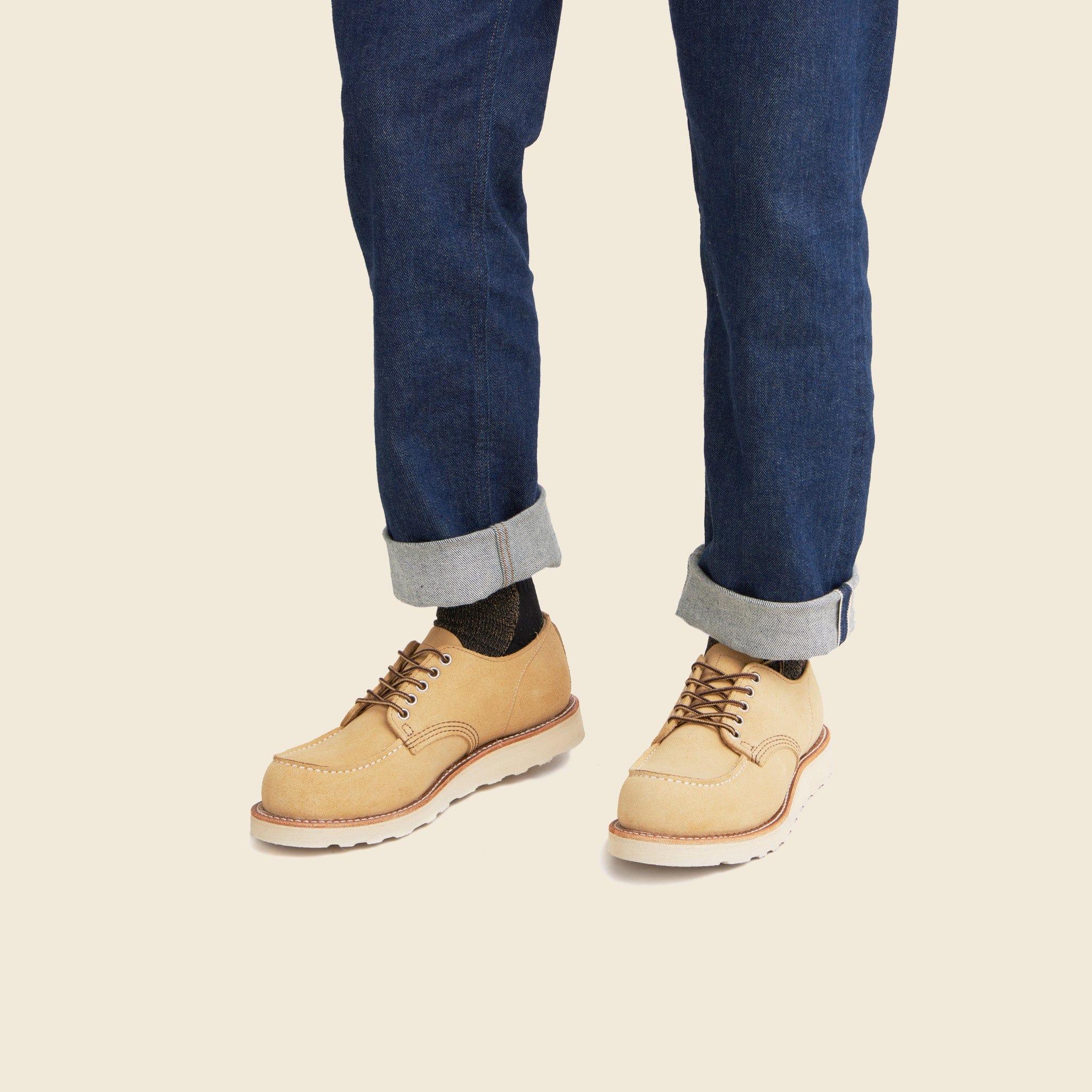 The 8079 is a Moc Toe Oxford, originally built in the 1950s to meet the demands of factory managers who needed sturdy work shoes that could function behind a desk, as well as on a factory floor. Classically crafted with Hawthorne Abilene suede leather, a durable Traction Tred rubber outsole, traditional Goodyear welt construction, and triple-stitched quality for shoes that are built for a lifetime. Hardwearing full-grain leather suede Traction Tred rubber outsole Goodyear welt construction Triple stitched Nickel eyelets Taslan laces Many customers buy Red Wing Heritage footwear a full size smaller than their normal size Made in USA Materials: Upper: Full-grain Leather | Sole: Traction Tred