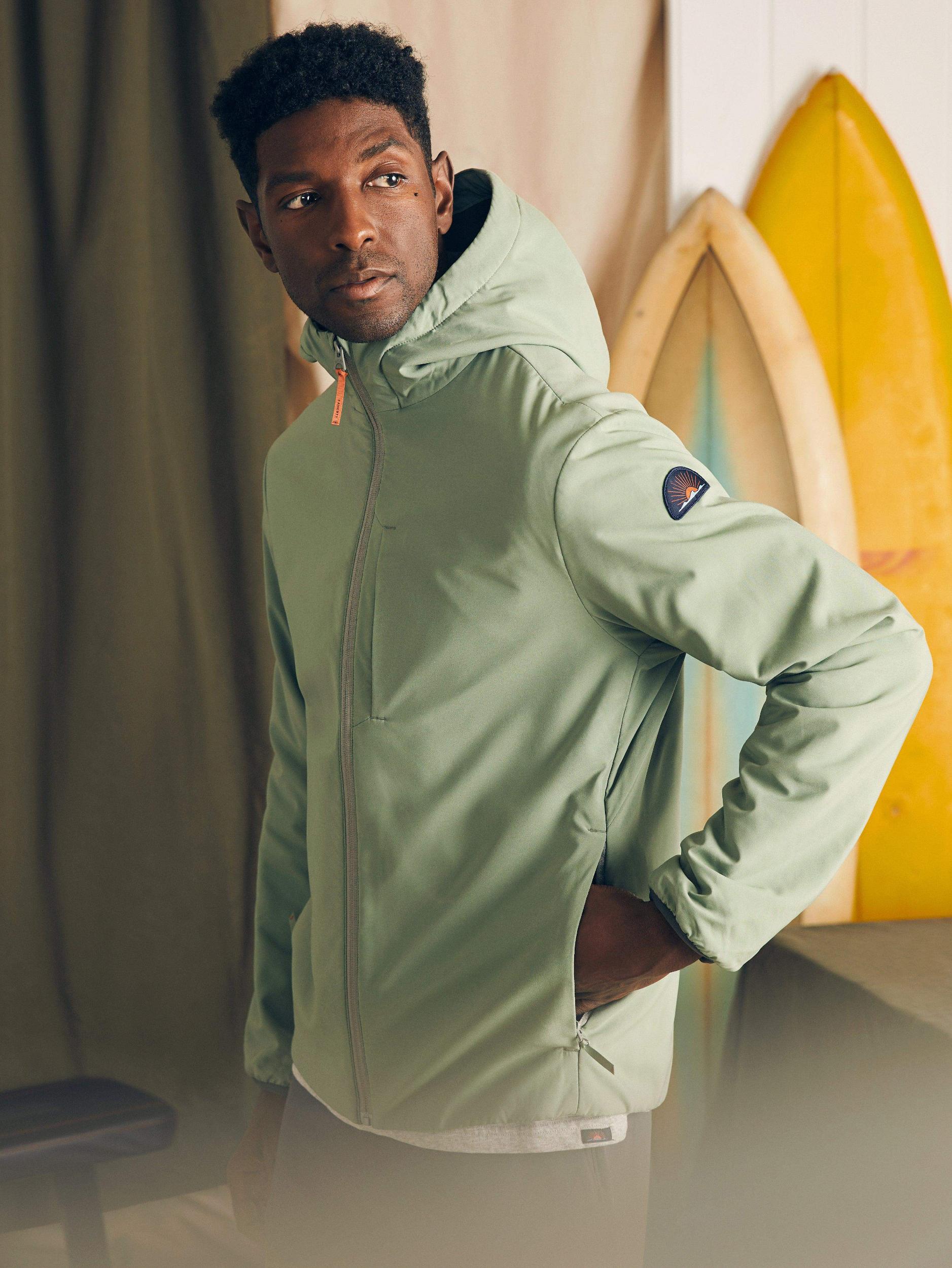 Introducing our most technical and activewear fabric yet designed for those gym-to beach days (and maybe even some lounging in between). Packed with utility and lightly insulated, its quick-drying and water-repellant fabric has the perfect amount of stretch and offers UPF50+ so you can stay out and get after it. If you're looking for a jacket that keeps up with you, this is it. Fit: Relaxed fit with room to layer a light sweater/sweatshirt underneath. Detail: One way reverse coil zipper at center front. Elastic binding at cuffs. Three exterior zip pockets and one interior zip pocket. Faherty Sun & Waves logo patch at wearer's left bicep. Adjustable hood opening. Insulated with Primaloft recycled polyester fill, but not quilted. Material: Shell: 100% Recycled Polyester; Insulation: 58% Recycled Polyester, 42% Polyester; Logo Patch; Metal Zipper; Hood Bungee Cord; Hood Leash Tape; Hood Drawcord Exit; Stretch Cuff Binding Tape Model: Jamal is 6'2 wearing size Medium Care: Close all zippers before wash. Turn inside out. Machine wash cold with like colors. Delicate cycle. Do not bleach. Tumble dry low. Remove promptly. Warm iron when needed. MOS2425-TOL