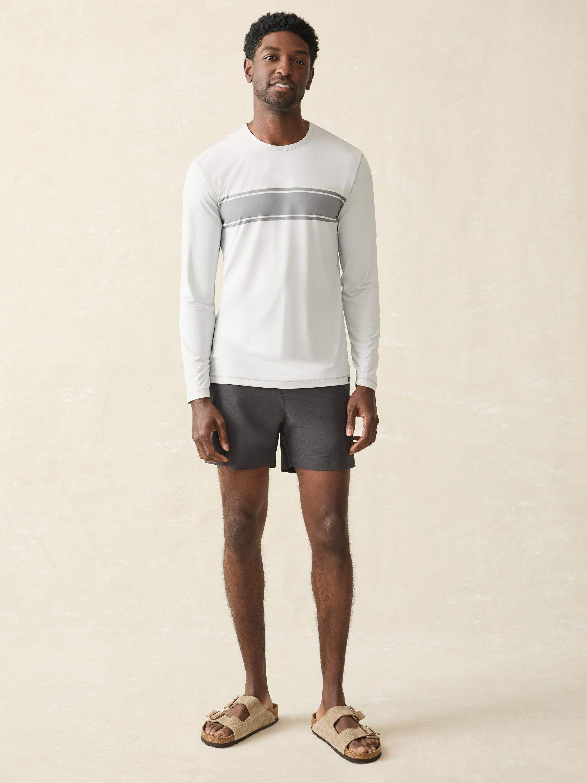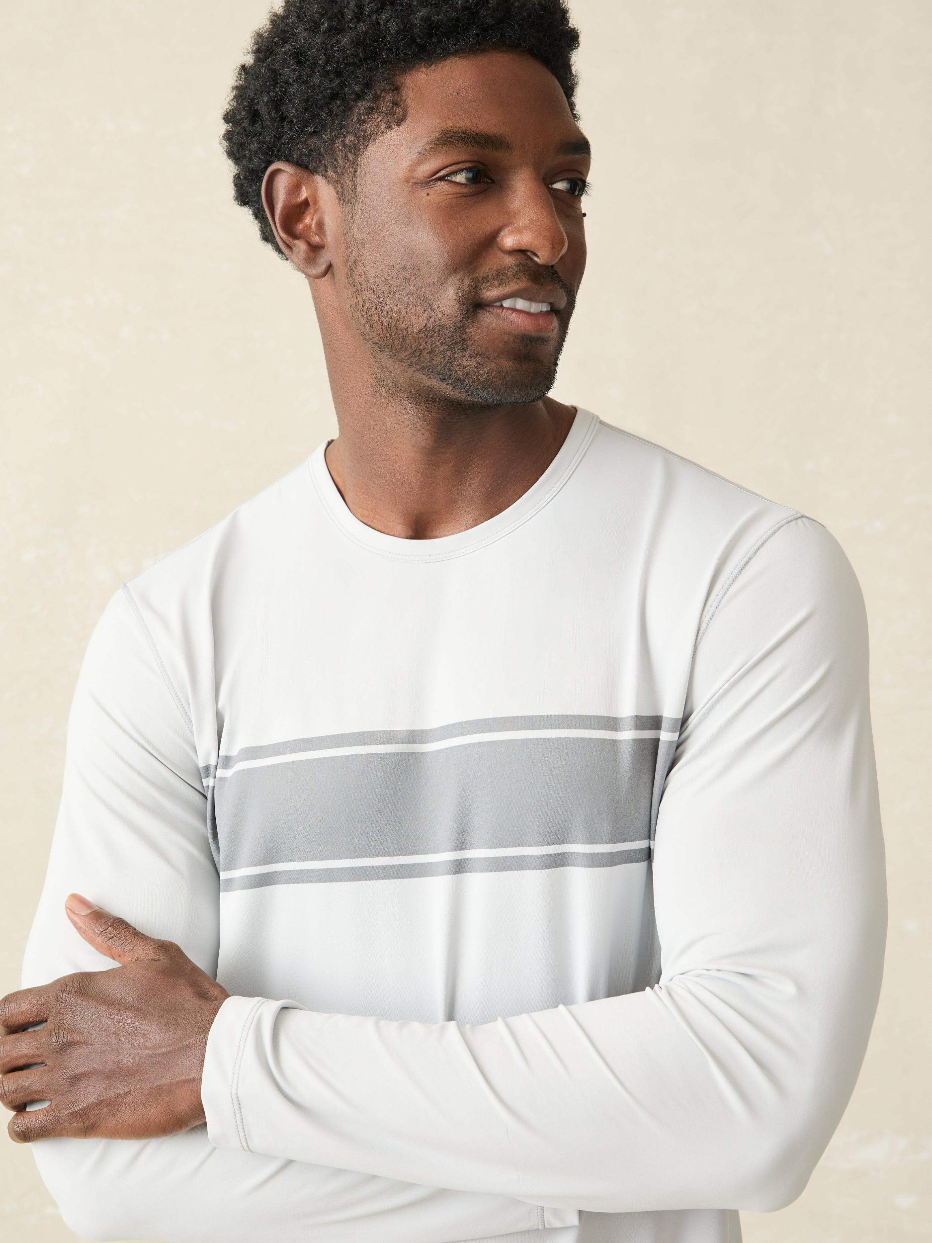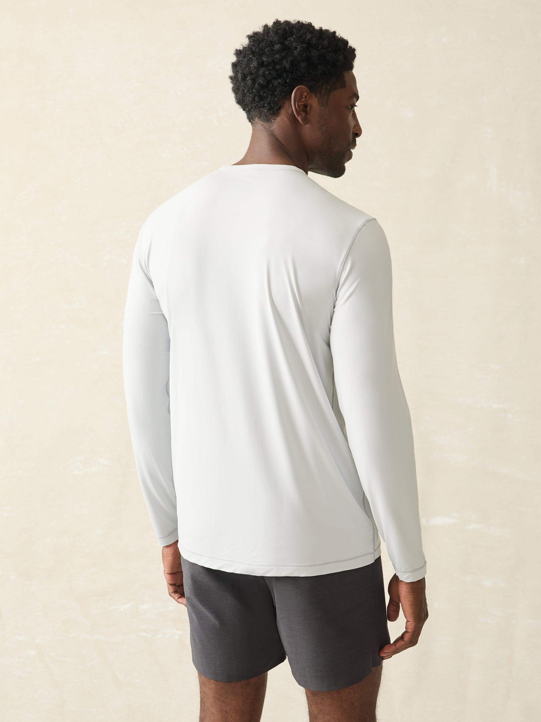 Built like a classic tee but packed with UPF 50+ sun protection, this performance layer ensures that you can stay out doing all the things you love. With a smooth and stretchy tech-knit feel, it's lightweight and quick-drying for the most active days. Fit: A fitted body, with a straight fit from the chest to the hem and tapered sleeves. Detail: UPF 50+ fabric. Printed main label at interior back neck. Silicone Sun & Waves label at hem. Material: 86% Sensil® Breeze Nylon, 14% Lycra Model: Jamal is 6’2 wearing size Medium Care: Turn inside out. Machine wash cold with like colors. Gentle cycle. Do not bleach. Tumble dry low. Remove promptly. Cool iron when needed. MKU2421-GSF