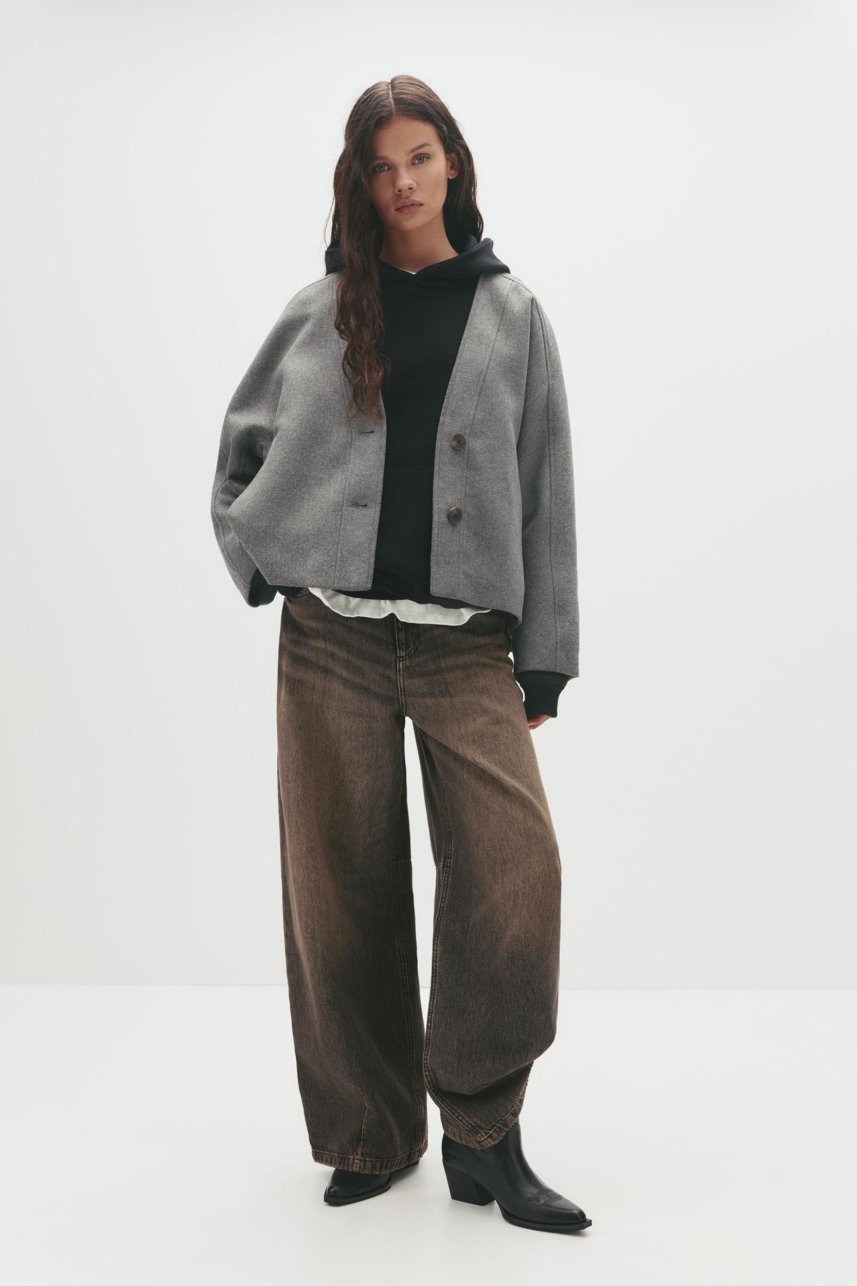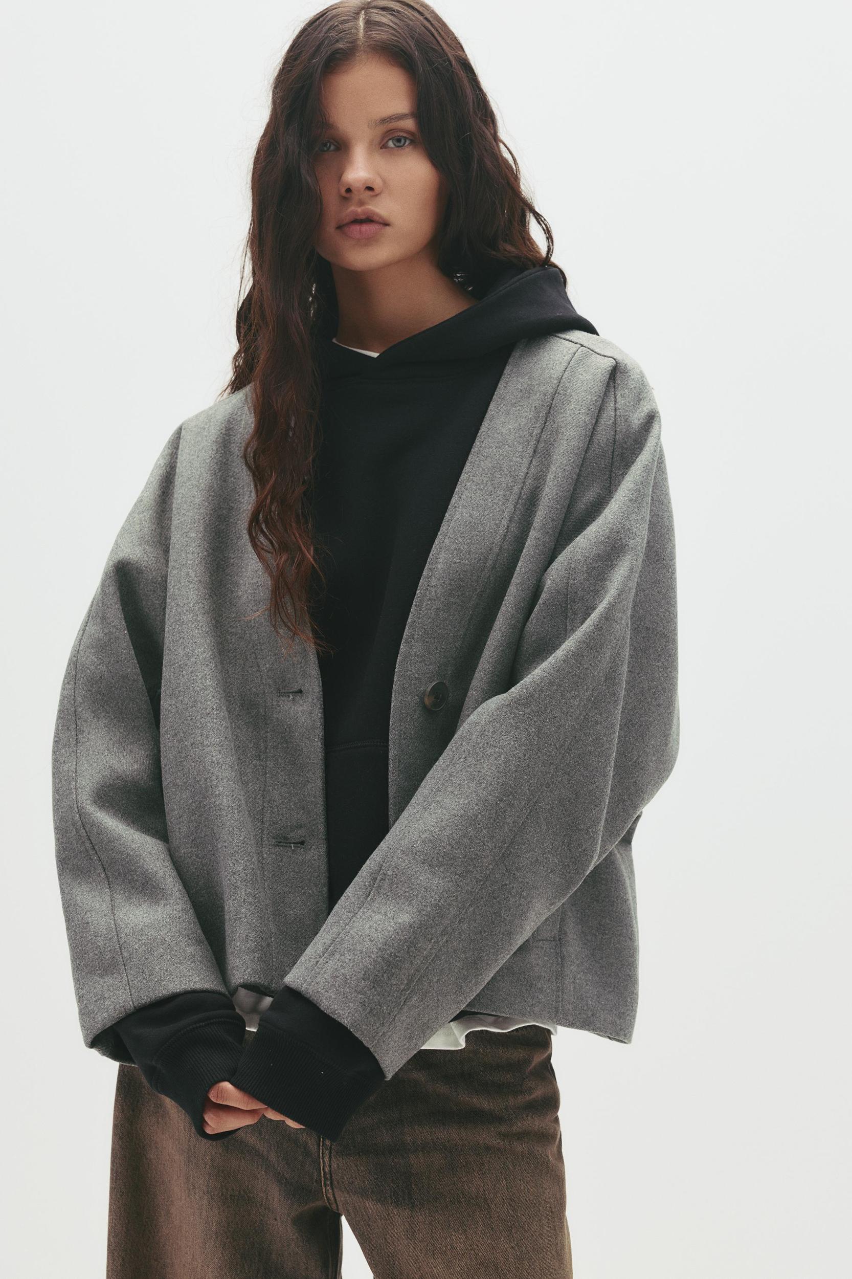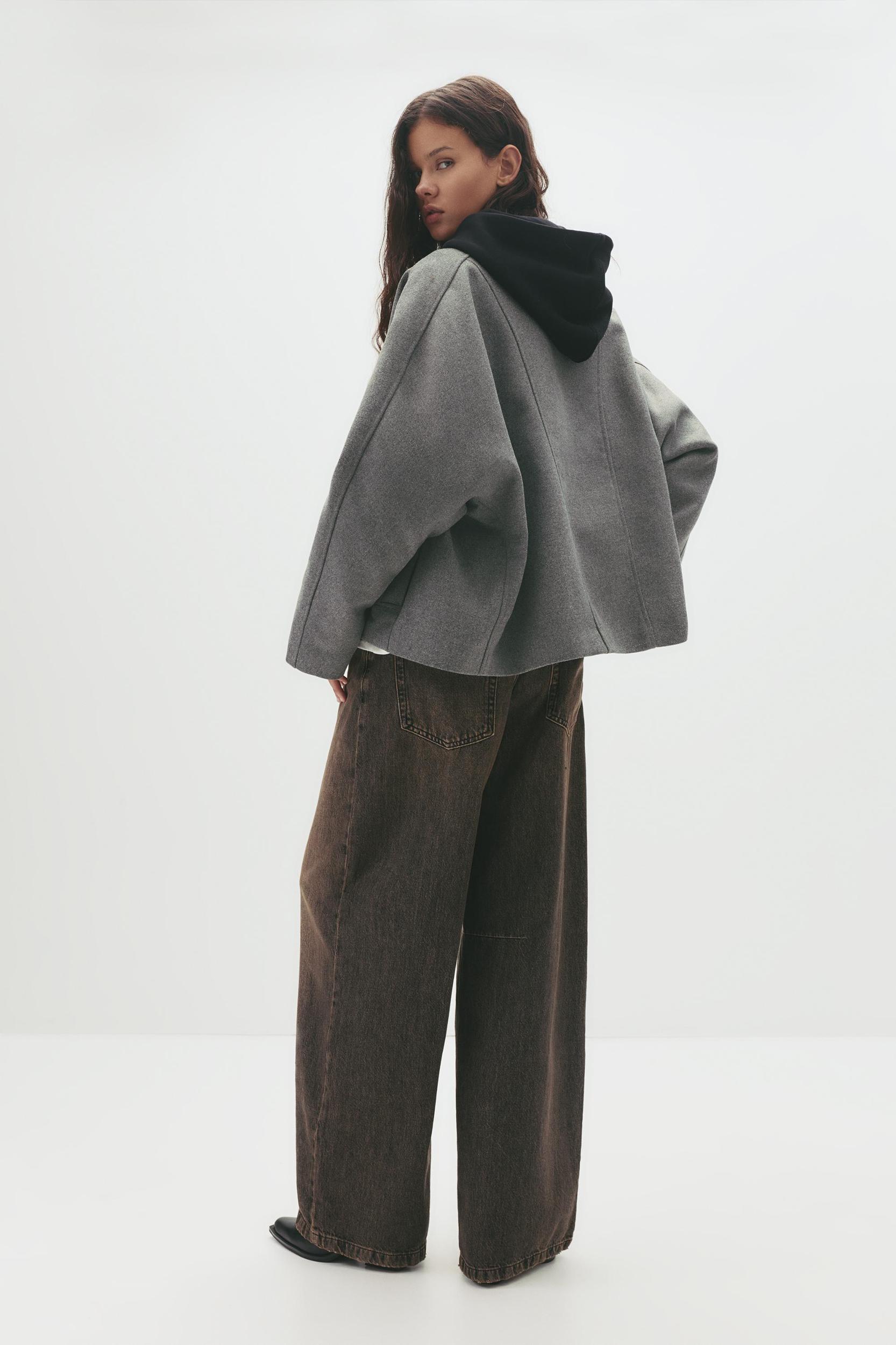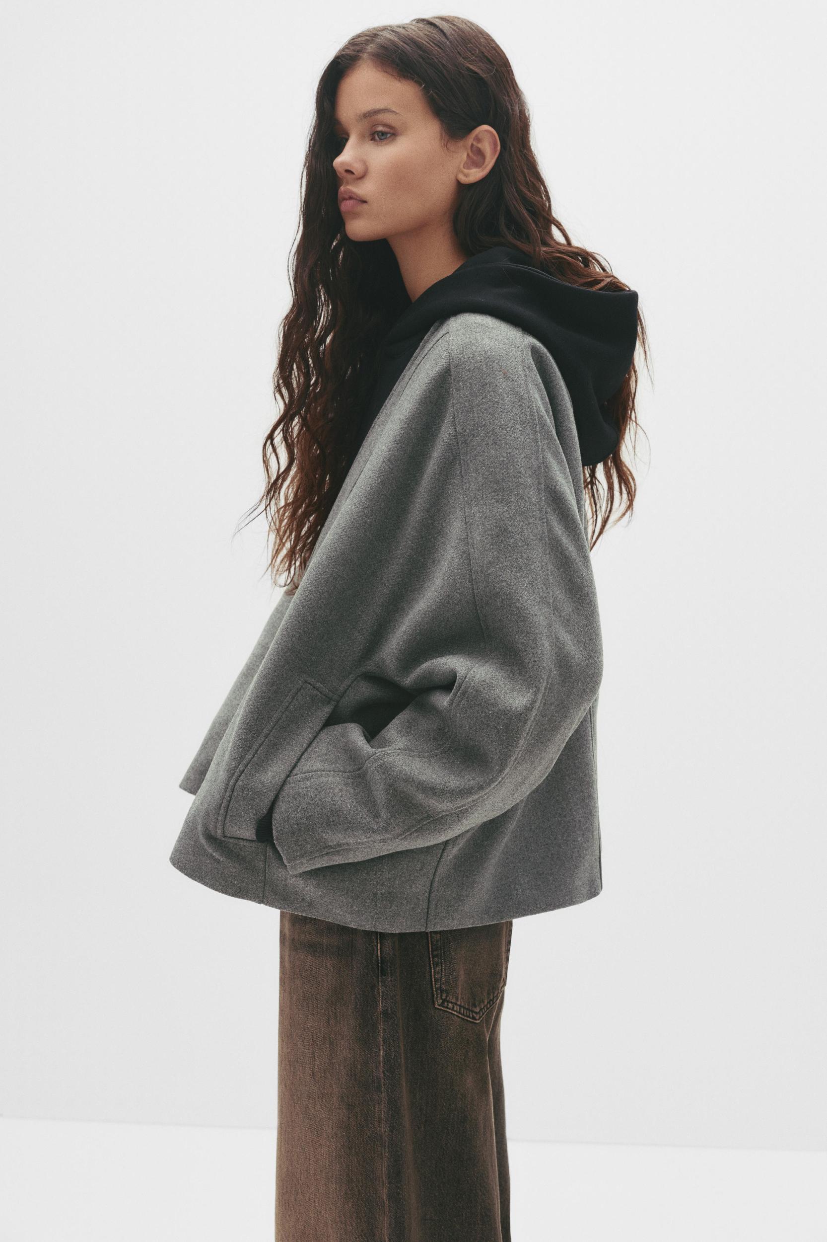 Short kimono-style coat in felt fabric, with voluminous long sleeves, side pockets, and made of a wool blend.