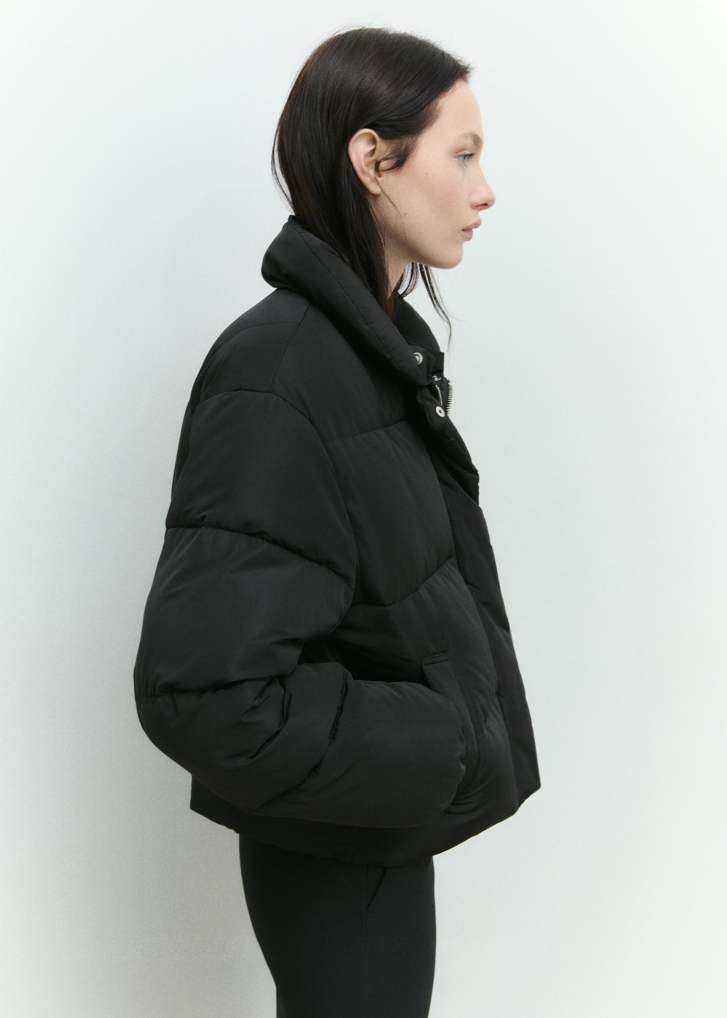 Nylon fabric. Oversize design. Quilted design. Straight design. Cropped design. Shirt-style collar. Detachable fur-effect collar. Long sleeve with elastic cuffs. Two side welt pockets. Front zip and snap button closure. Inner lining. Side length 13.07 in. Back length 25.55 in