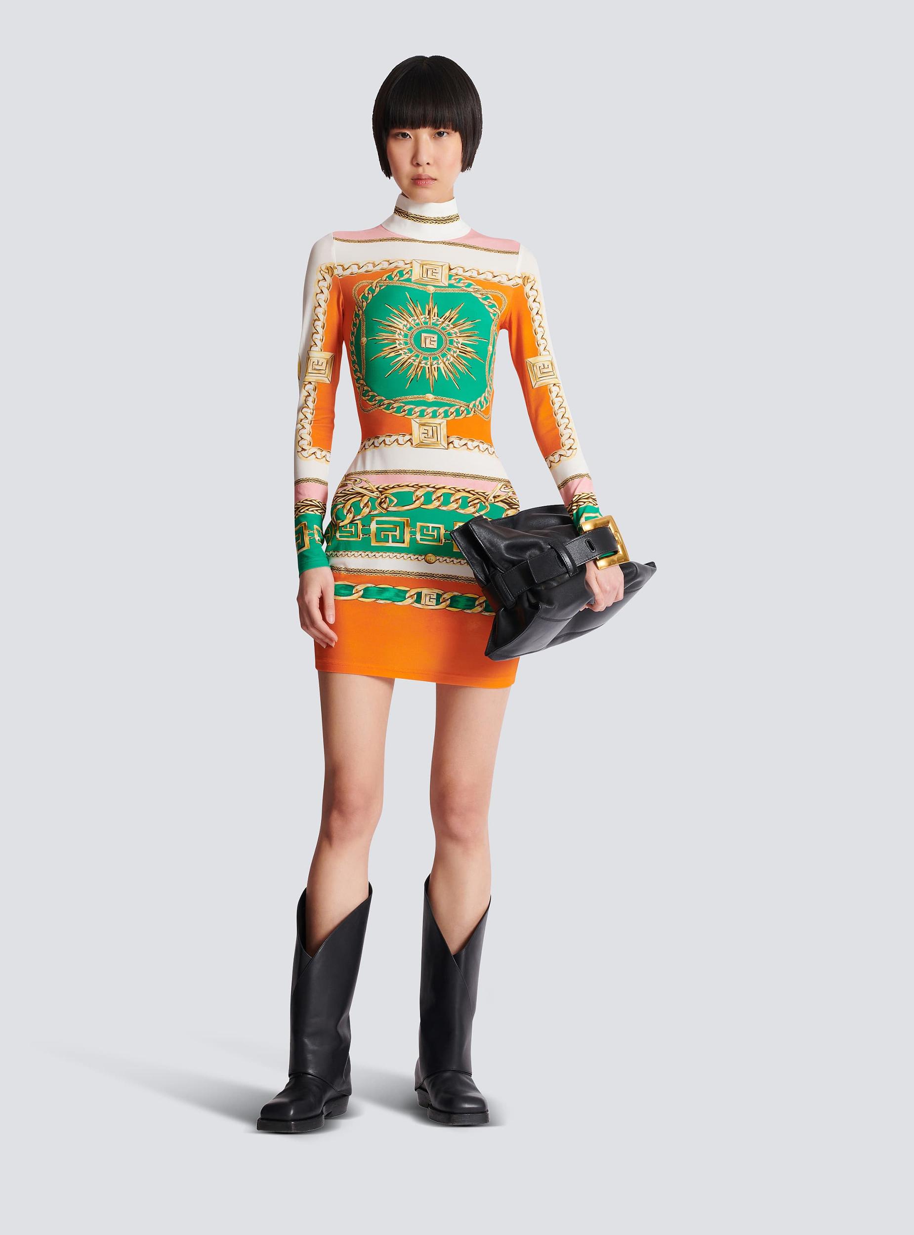 Short printed jersey bodycon dress with Balmain Foulard patternHigh neckLong sleevesInvisible back zip fasteningPB logos worked into the patternCropped slim fitModel measures 179cm and wears a size 36Main material: 92% cupro 8% elastaneMade in BulgariaItem: FF1R8840JK71