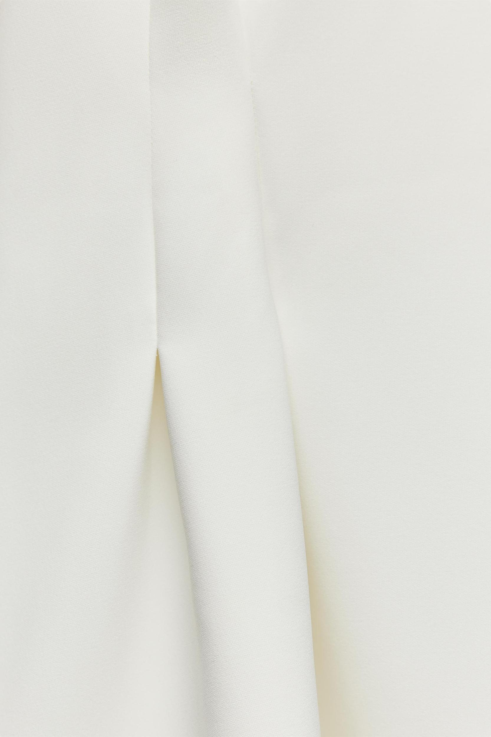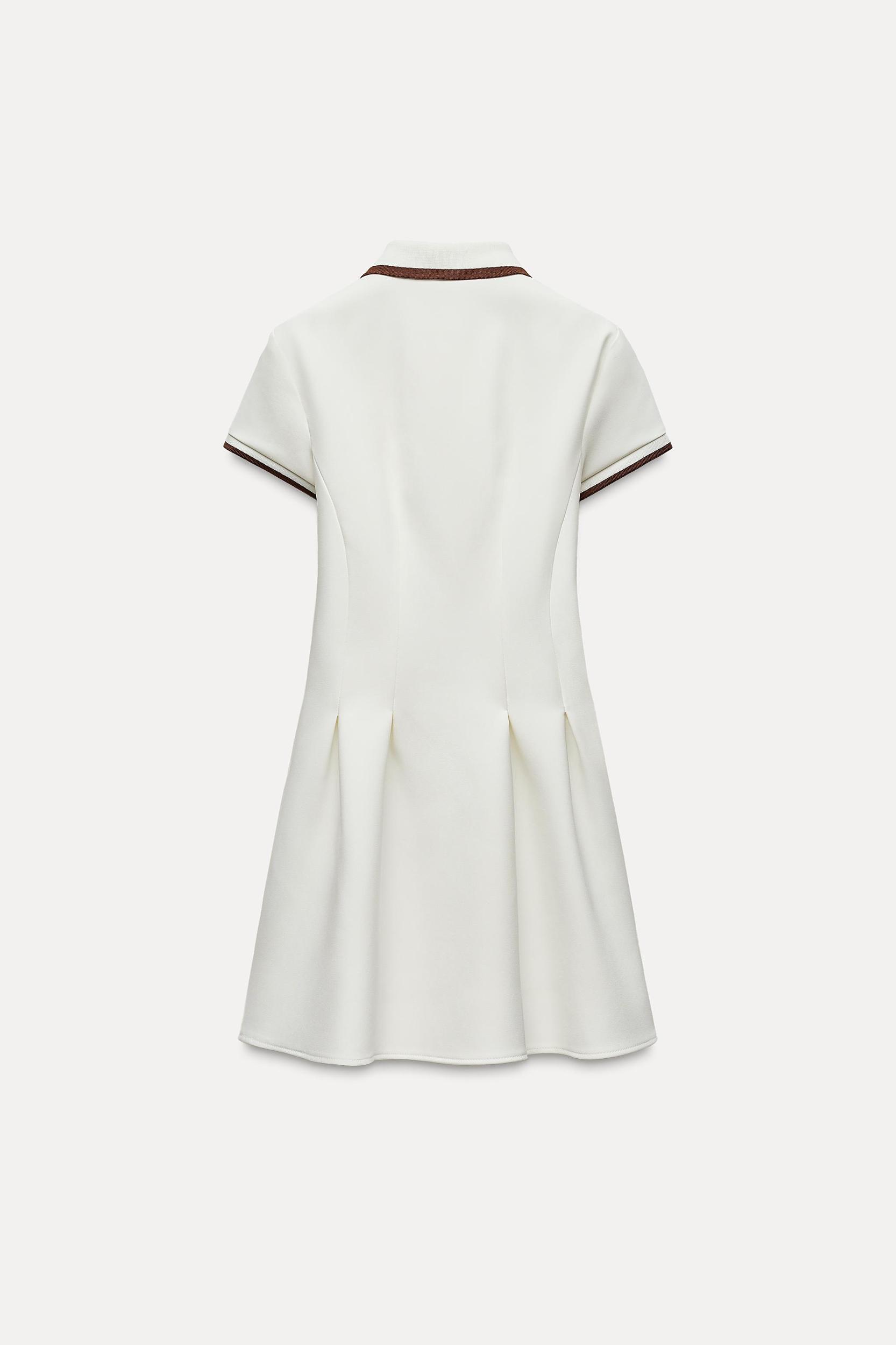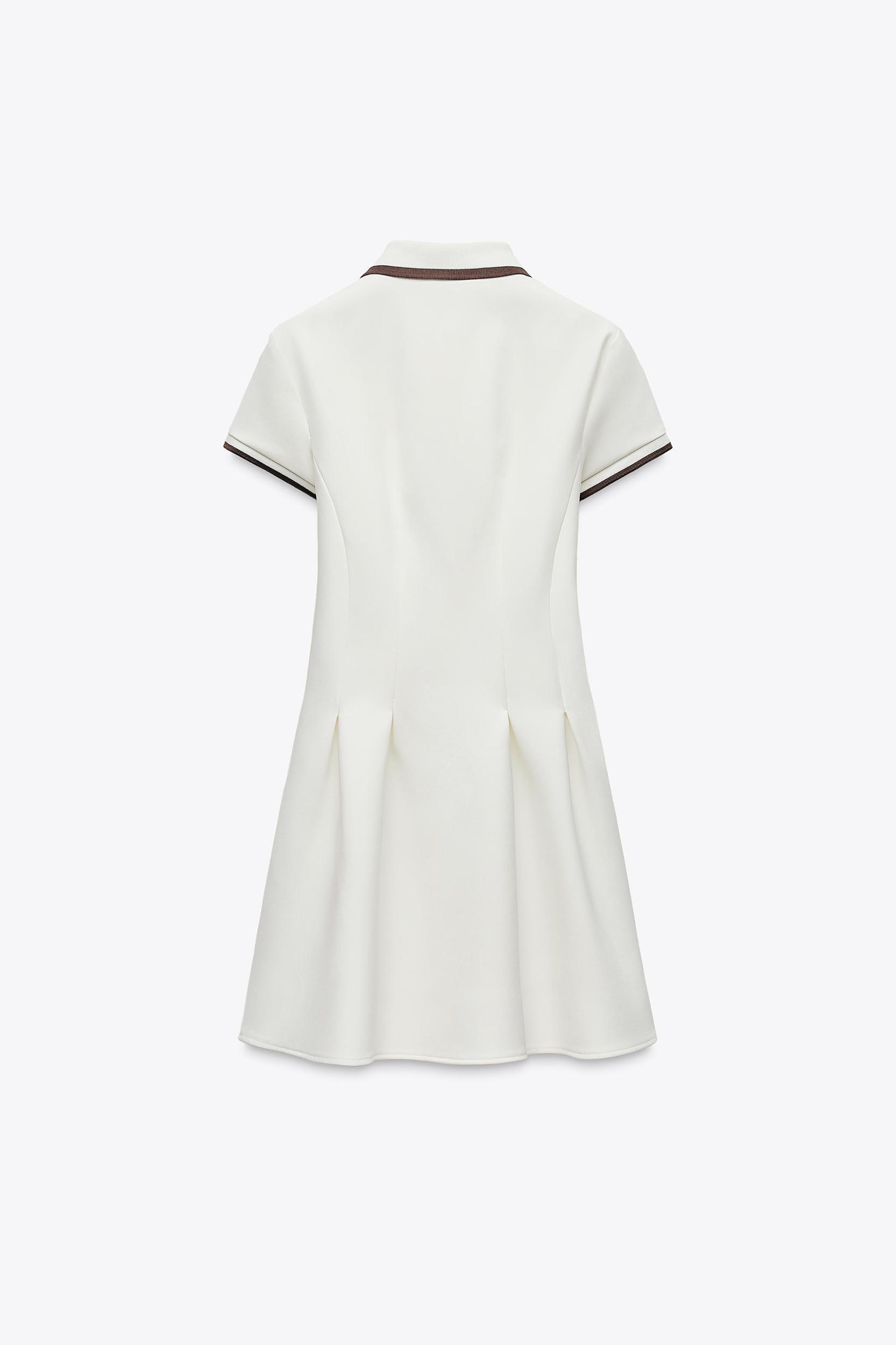 Short fitted dress. Lapel collar and short sleeves with rib trim. Elastic godet hem. Half placket front button closure.