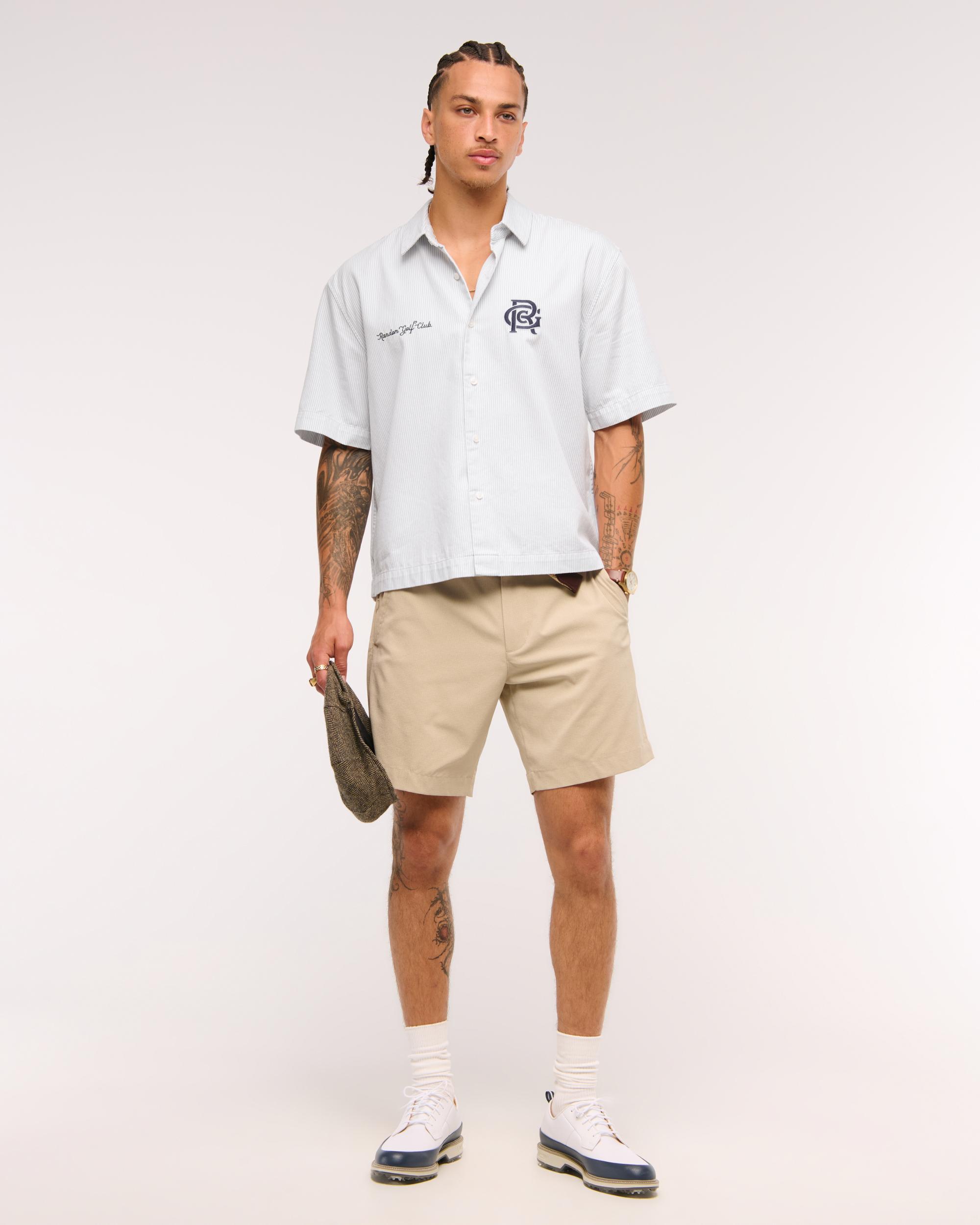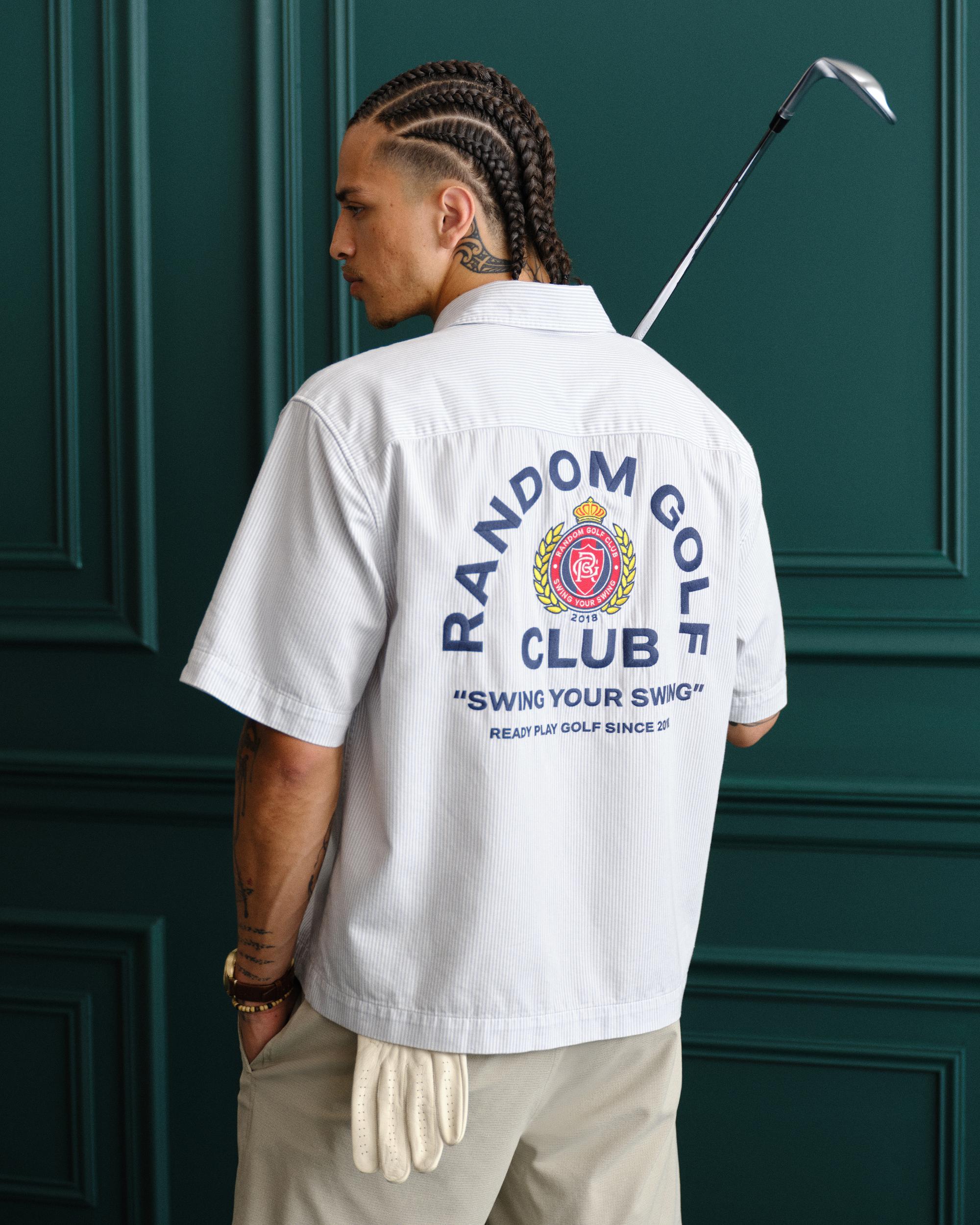 Comfortable short-sleeve button-up shirt in our twill fabric and new cropped length. Features a relaxed-fit silhouette, classic collar, left chest pocket, embroidered Random Golf Club-inspired graphic details at chest and back and straight hem. Part of a new collection of on-trend new arrivals we co-created with Random Golf Club.