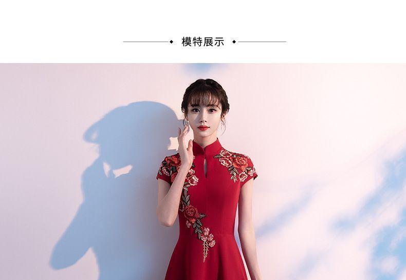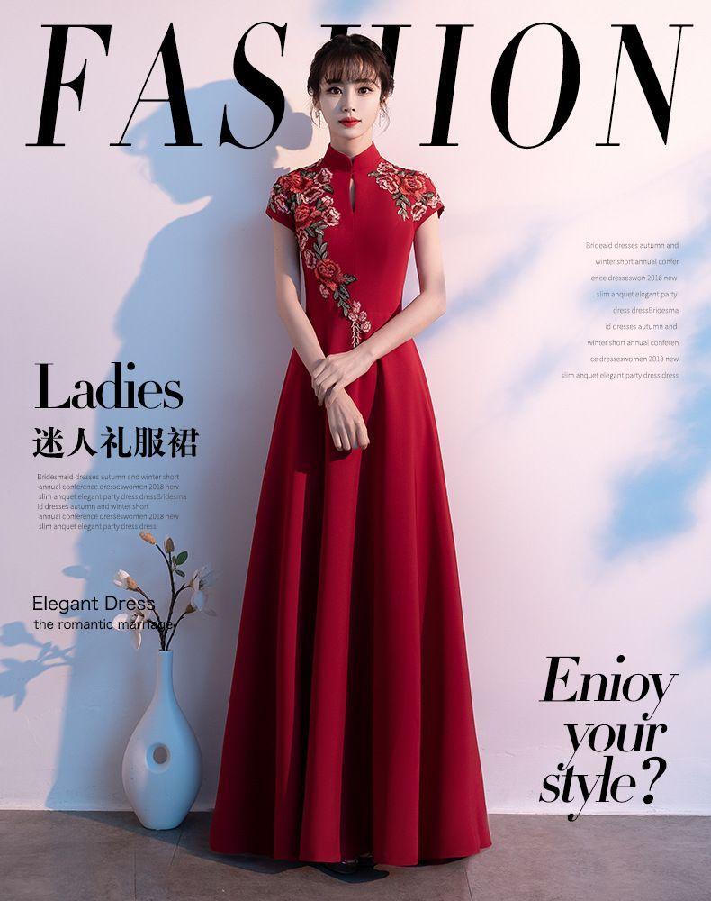 Short-Sleeve Floral Embroidered Qipao Evening Gown