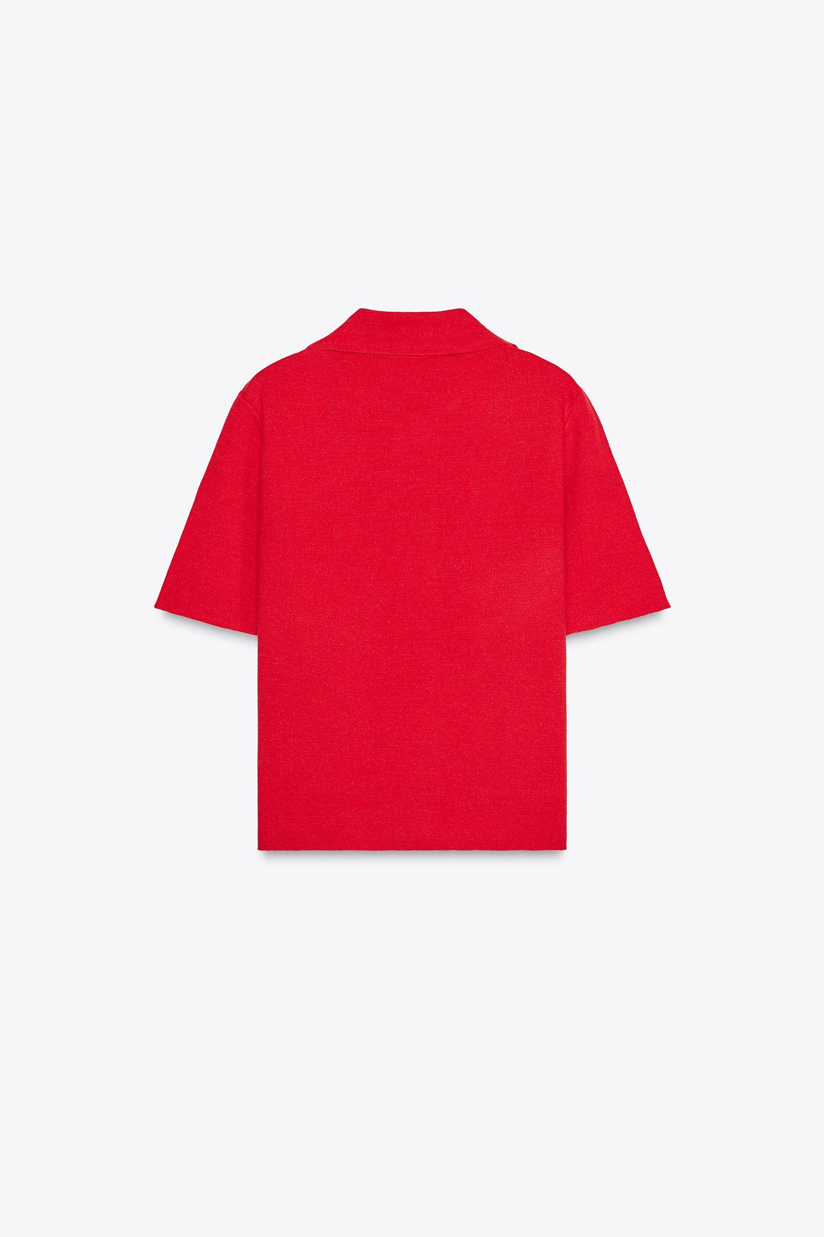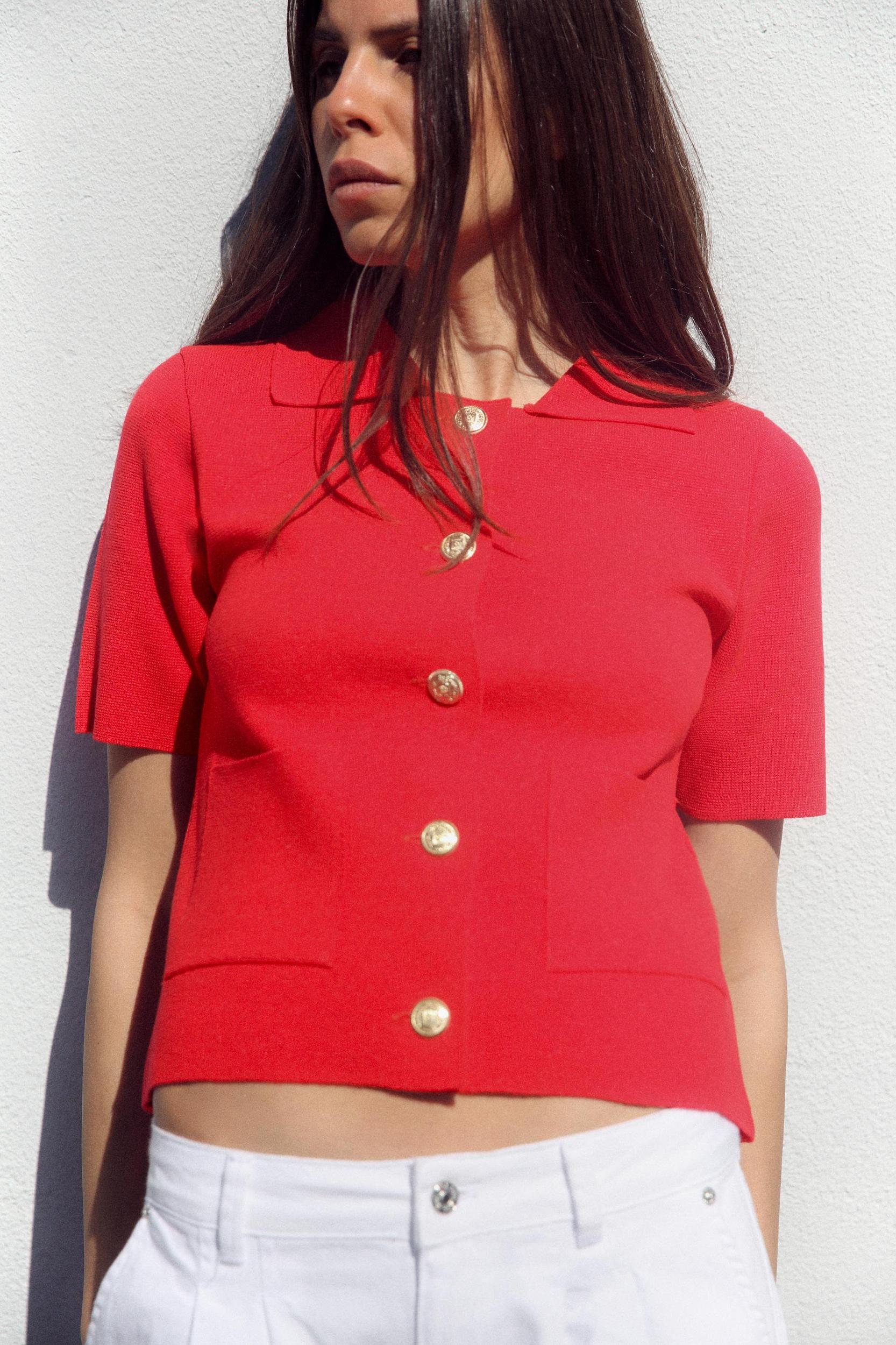 Polo neck jacket with short sleeves. Front patch pockets. Front button closure.