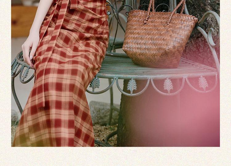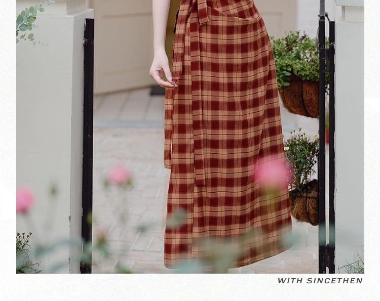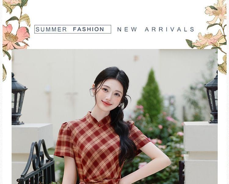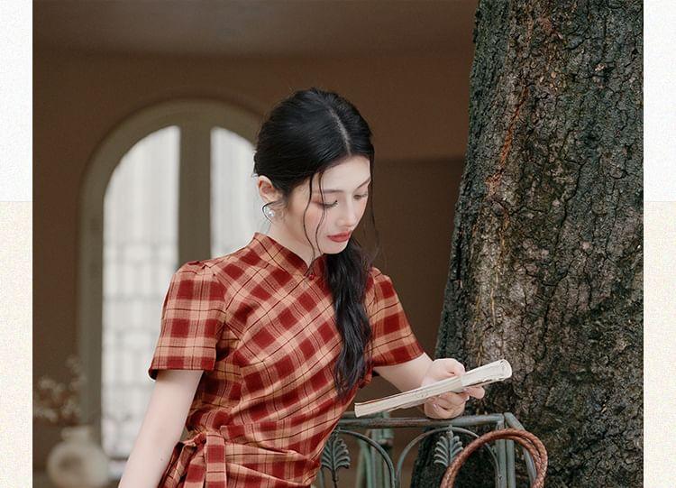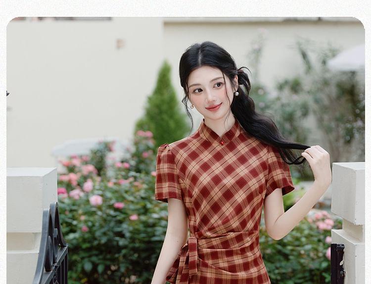Short Sleeve Mandarin Collar Plaid Midi Bodycon Dress