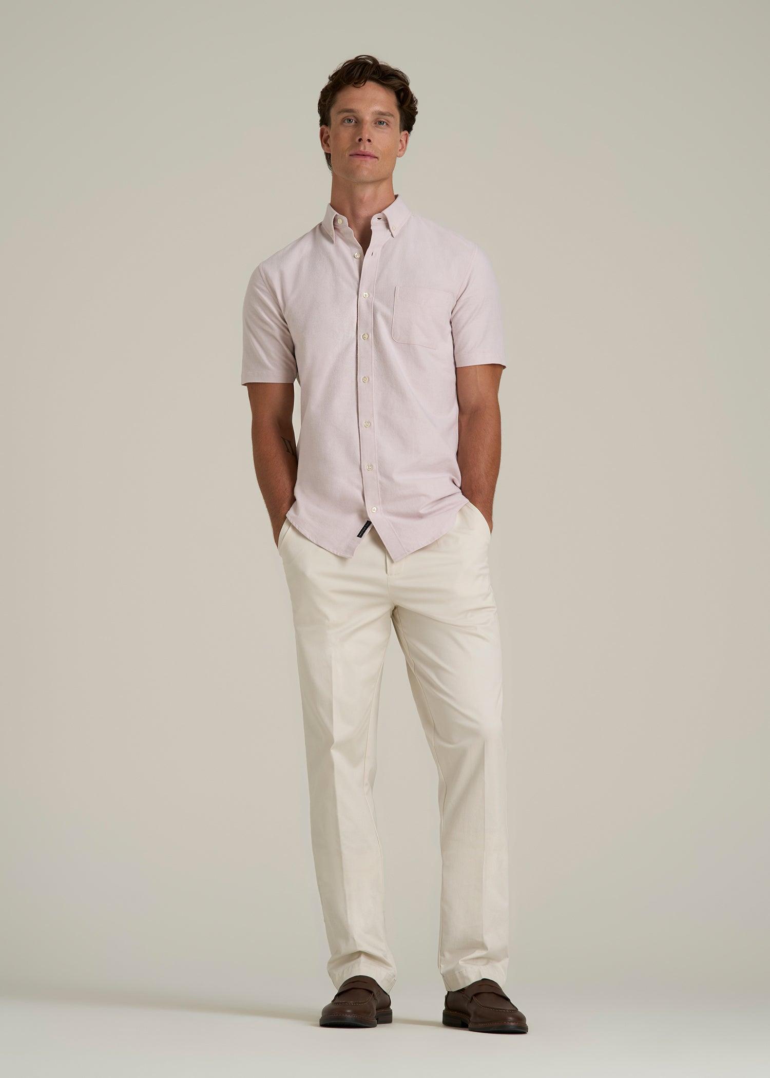 About Our Short Sleeve Oxford Button Shirt For Tall Men The Oxford is a classic shirting piece in menswear. It gets its name from Oxford material, a durable, structured weave that was invented in Scotland. Simultaneously easy to wear and polished, we’ve created this Oxford shirt for tall men from 6’ to 7’1". It’s tailored specifically for your frame with added length, wider shoulders and longer sleeves better suited for your arms. We’ve designed this men’s tall shirt in all-cotton for everyday comfort and breathability. What makes the Oxford stand out from the classic men’s button up are the details like the button-down collar, left chest pocket and rear pleat detail. With a shirttail hemline and modern fit, you can style this with slacks, chinos, jeans and shorts when the sun shines. This tall men’s shirt has been pre-washed and shrinkage controlled, so you don’t have to worry about losing essential length when you wash it. From your desk to date night, you’ll love the versatility of our Short Sleeve Oxford Button-Up. SIZE & FIT: Modern fit Hip length Short sleeve Button front Shirttail hemline Button-down collar Back pleat Left chest patch pocket Model is 6'4" wearing size M Tall Size M Tall: Body length: 33", Sleeve length: 19.5" FABRIC & CARE: 100% cotton Pre-washed and shrinkage controlled Machine wash cold with like colors Do not bleach Tumble dry low Low heat iron