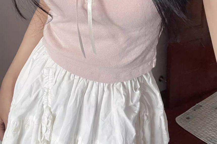 Short Sleeve Ruffled-Trim Ribbon Bow Accent Slim-Fit Crop Top