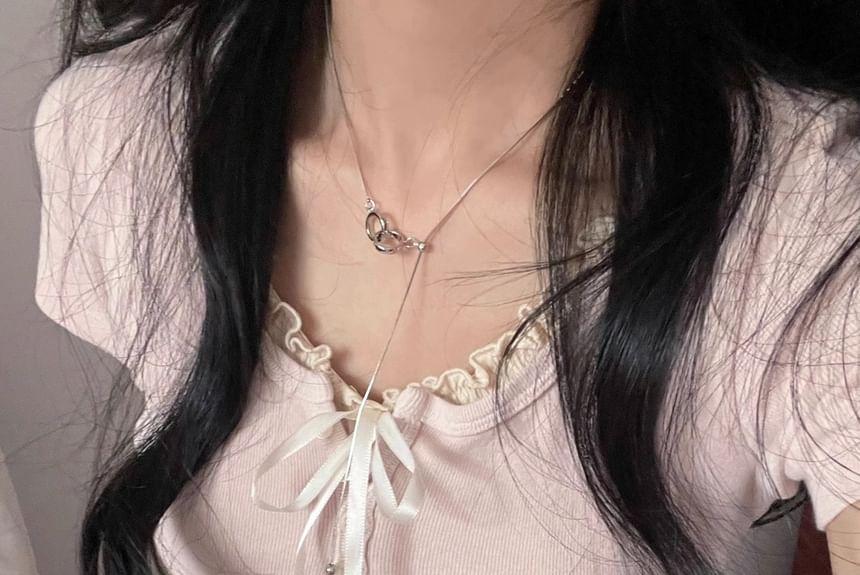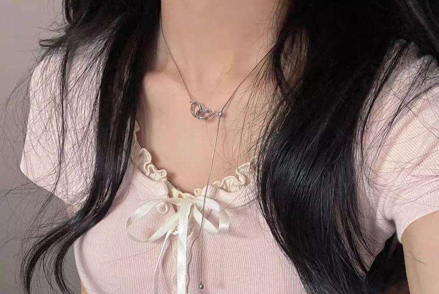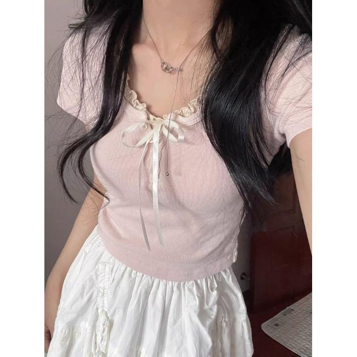 Buy Striinkie Short Sleeve Ruffled-Trim Ribbon Bow Accent Slim-Fit Crop Top at YesStyle.com! Quality products at remarkable prices. FREE Worldwide Shipping available!