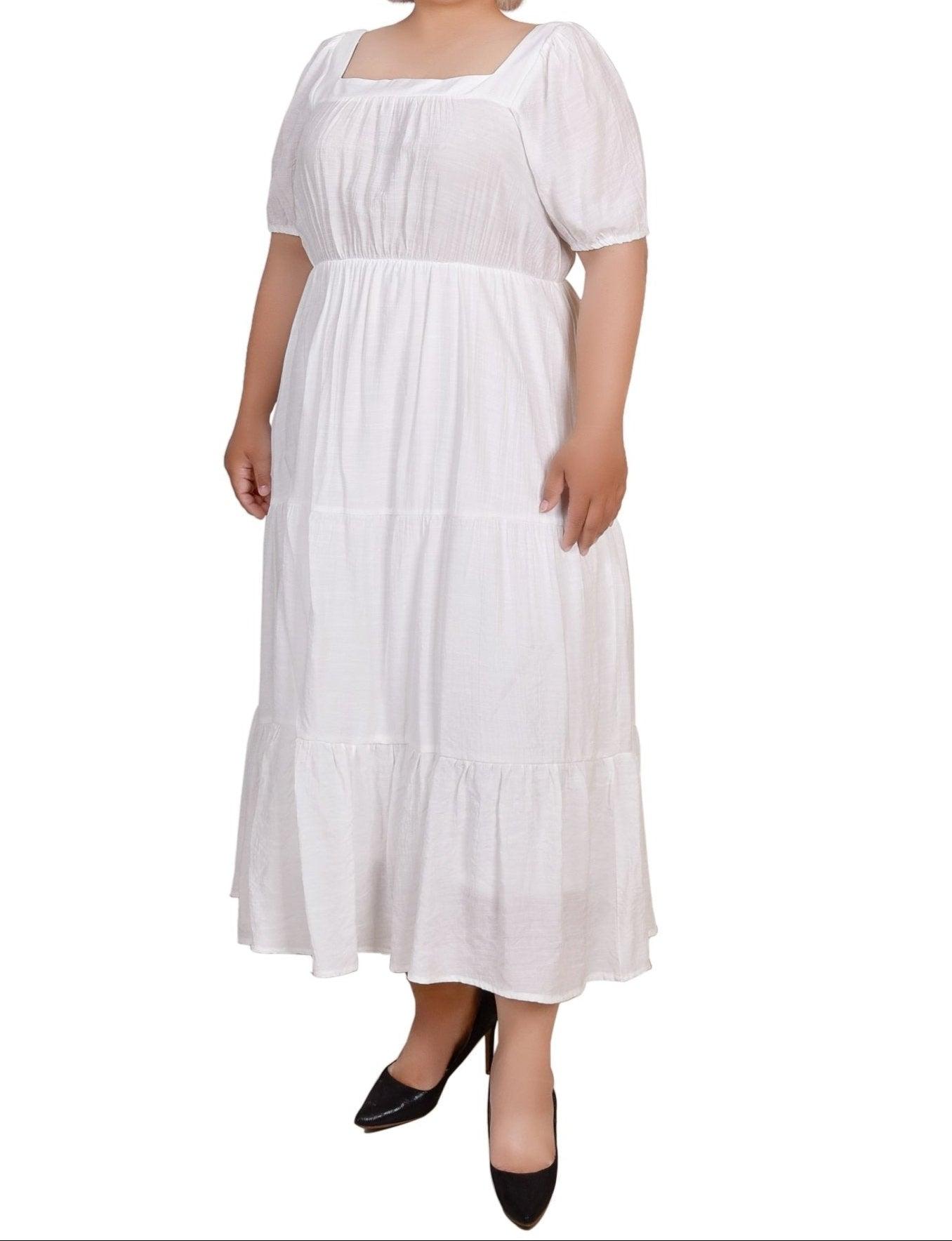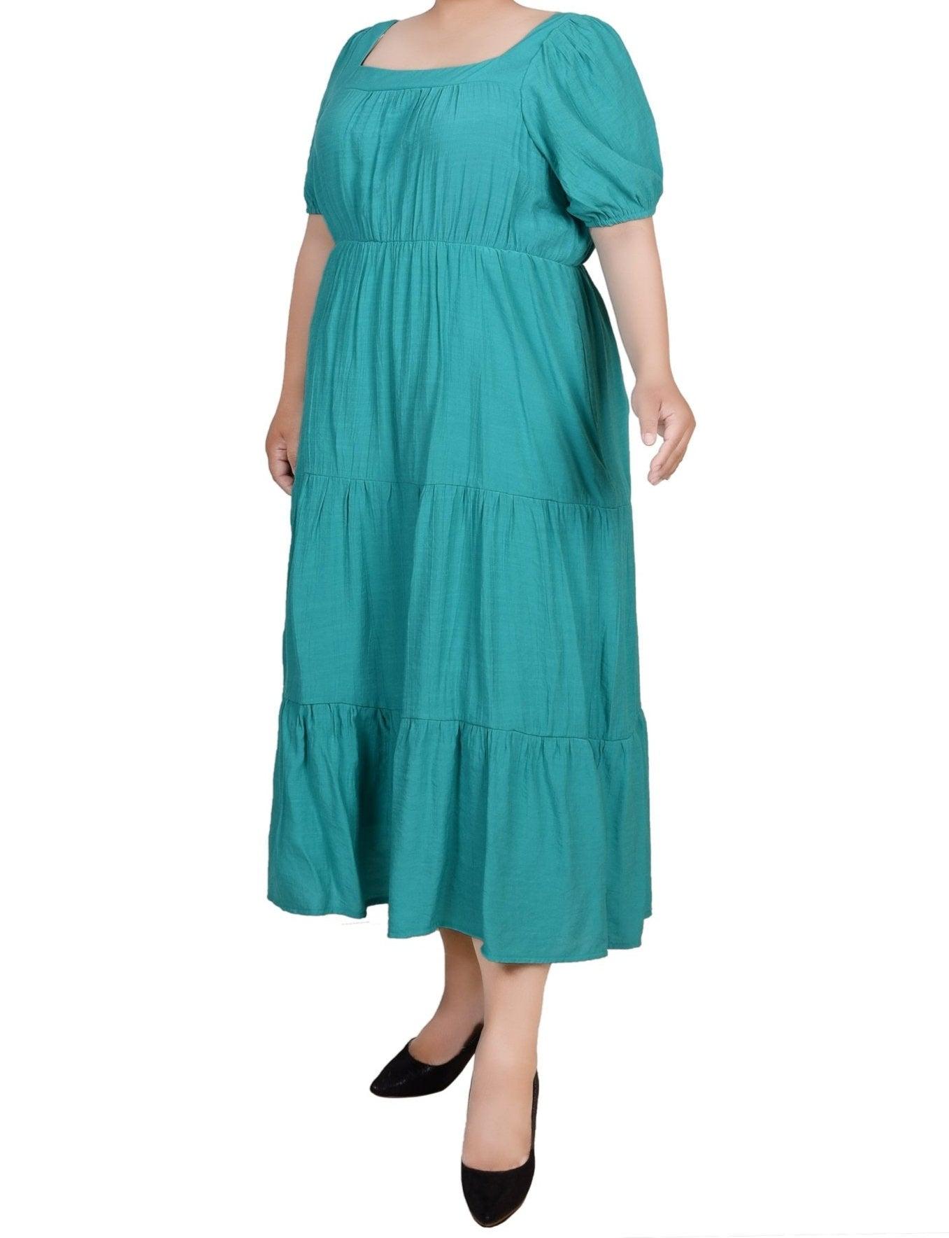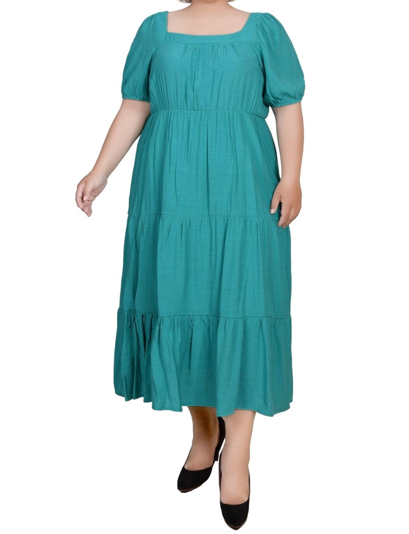 Be cool and comfortable this season in this midi length tiered dress from NY Collection. - Product Fit: Relaxed Fit - Care Instructions: Machine Washable - Material: Body: 62% Rayon, 38% Polyester; Lining: 100% Polyester Product Specifications: - Short Sleeves - Square Neckline - Puff Sleeve With Elastic - Elastic Waist - Lightly Slubbed Rayon Blend Fabric