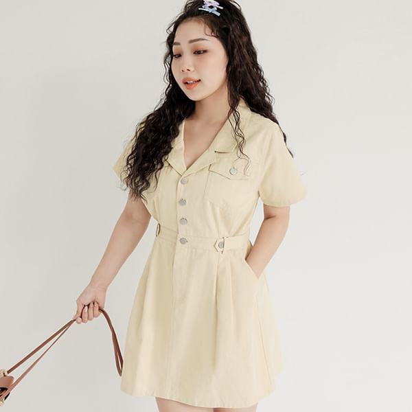 Short Sleeve V-Neck Plain Slim-Fit Cargo Mini A-Line Dress