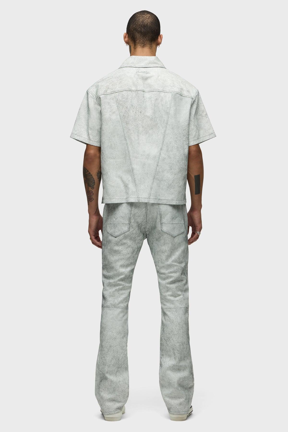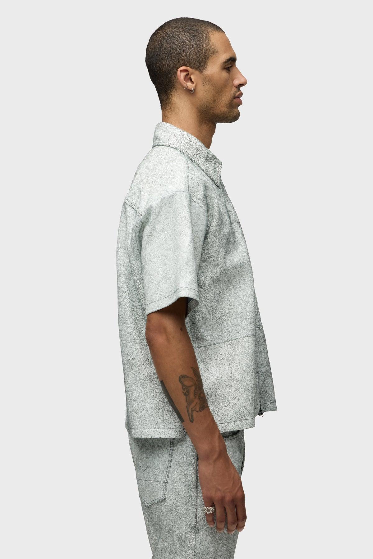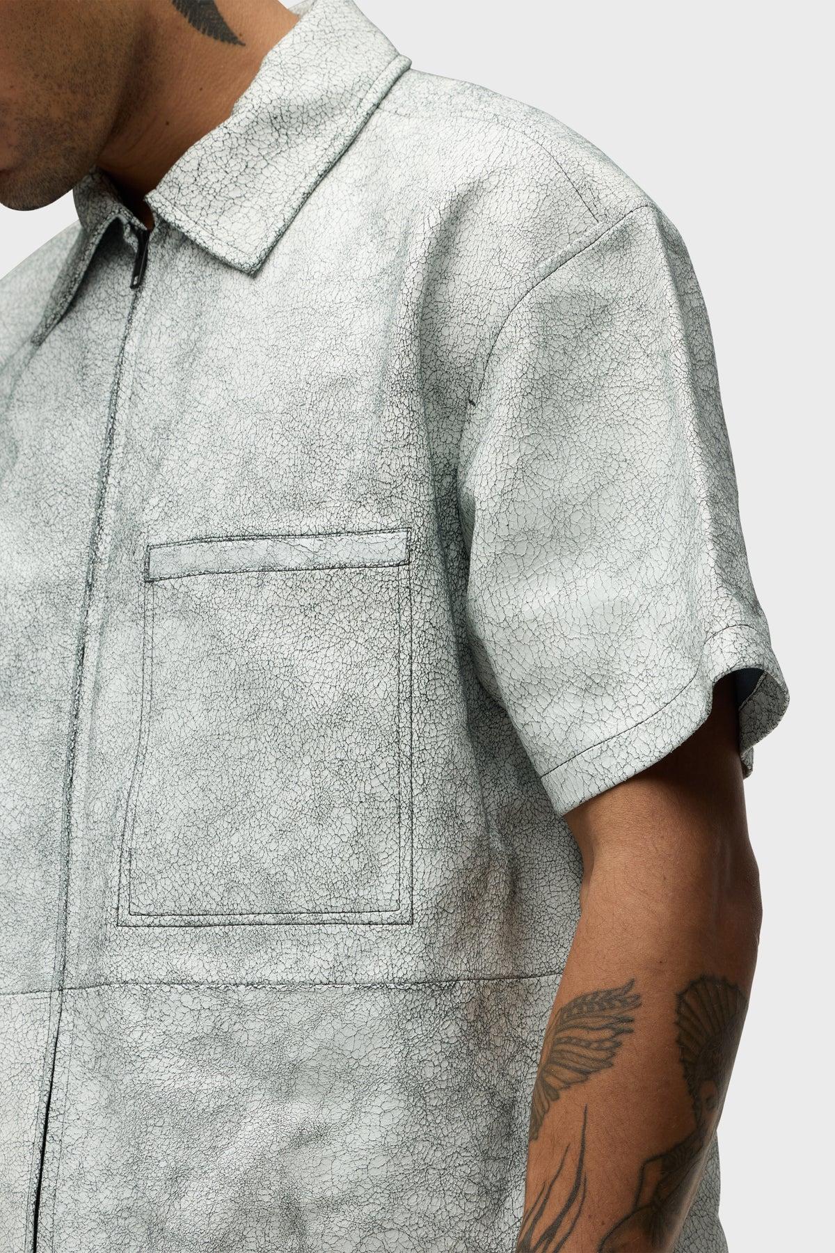 Description Crafted from a cracked white leather lambskin, our Short Sleeve Zip Shirt in Cracked White has a relaxed, slightly cropped fit. It's finished with a matte black double-ended front zipper, welt chest pocket and our signature back V-seam. Product Details Body Length: 26.5", Chest: 48.25", Sleeve Length: 9.25"Model Height 5'10"Model wearing size MMeasurements based on size M Fit & Care Content: 100% Goat Suede LeatherCare of Leather Specialist Only