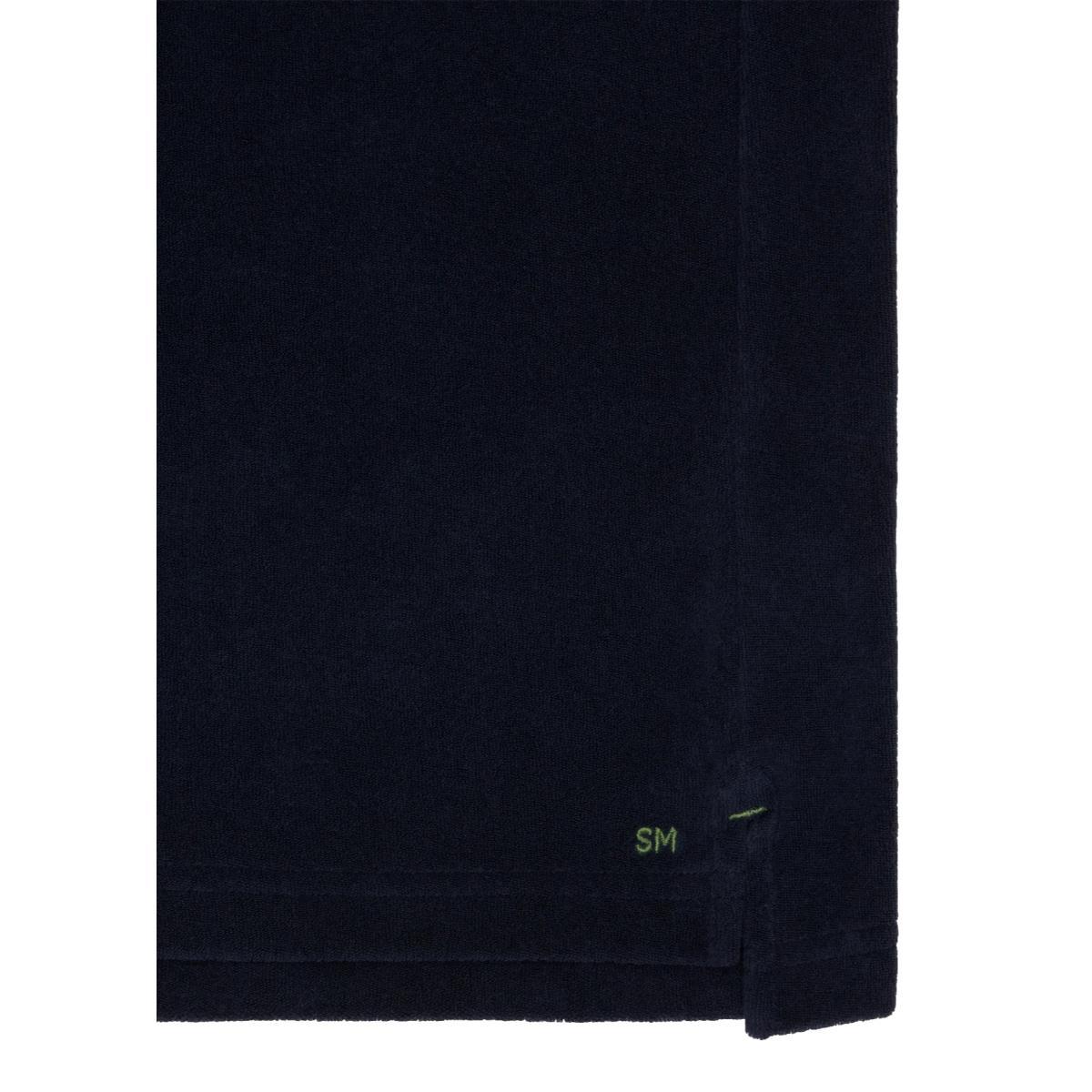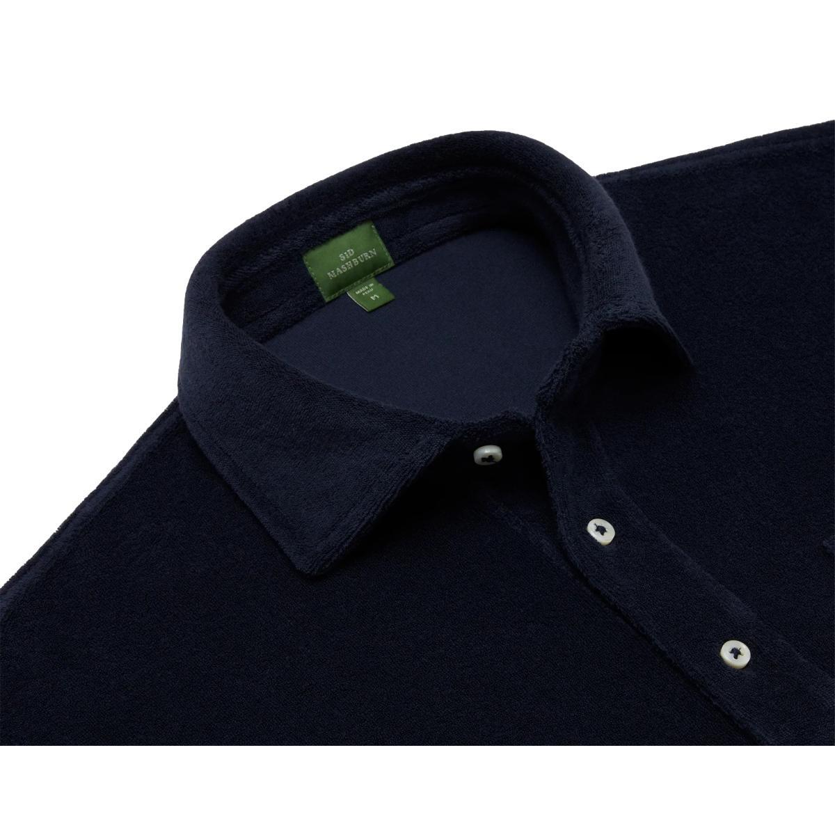 A terry-cloth polo shirt for channeling Sean Connery in Goldfinger or fulfilling all your vintage sports star dreams. (The fabric is made from Peruvian pima cotton in a beefier weight than versions they've run in past seasons.) It's got a cut-and-sew collar supported by a collar band and a tennis tail that can go tucked-in or not. Peruvian pima terry cloth 100% pima cotton 3.5mm Trocas shell buttons cut-and-sew collar 3-button polo placket front pocket straight sleeves tennis tail green embroidered SM at left hem made in Peru machine wash cold, hang dry, medium iron. do not bleach.
