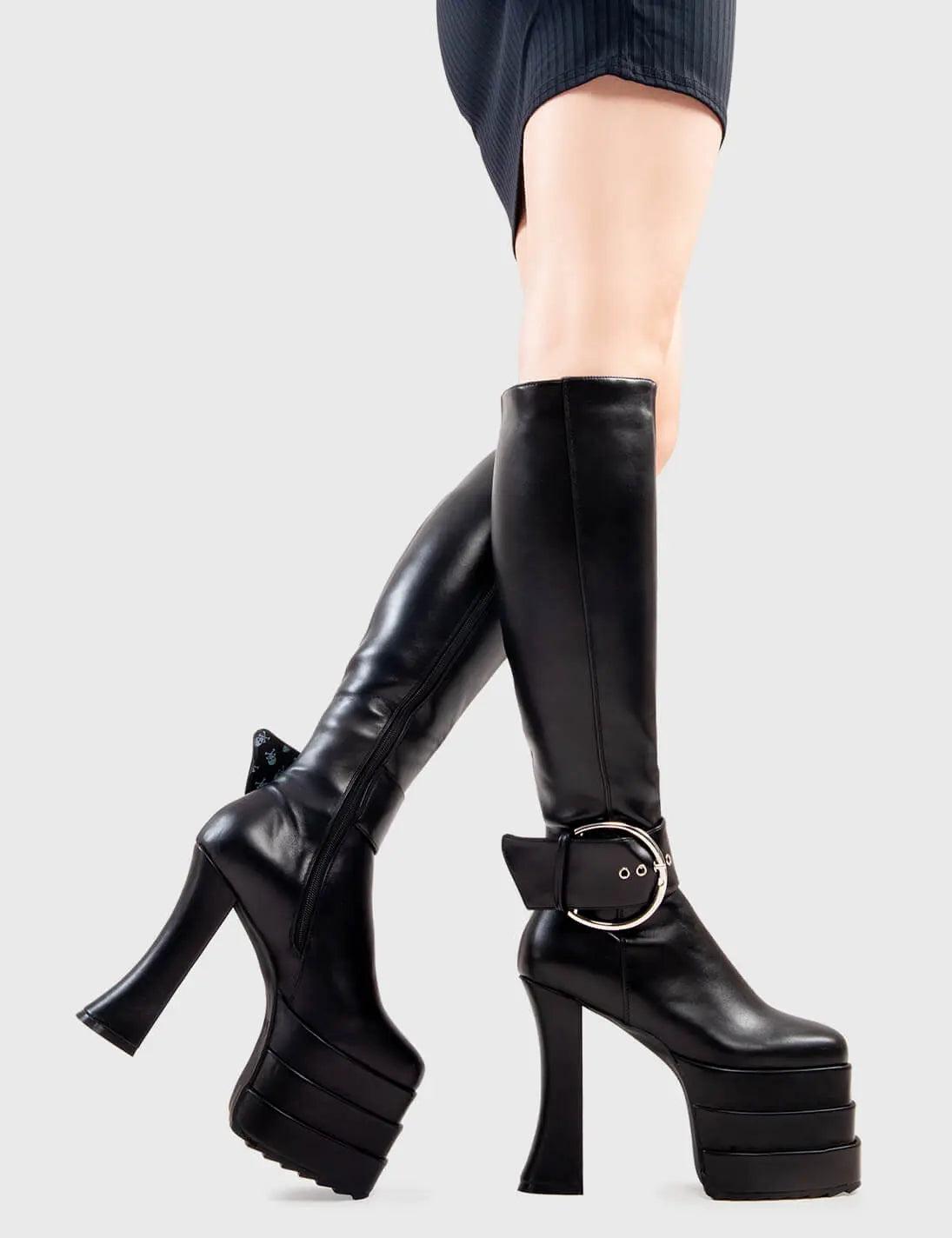 Trend SetterShort Term Loss Platform Knee High Boots in Black faux leather. These platform boots feature a large strap around the ankle with silver eyelets and a large buckle, on our triple-stack sole. They are the perfect way to elevate any look. Made with eco-friendly materials and 100% cruelty-free- Platform Height- Heel Height- Large Strap and Silver buckle- Black Zip- Triple-stack Sole- Shark's teeth grip- Chunky Platform sole- 100% vegan SKU: LMF 2898 - BlackPU