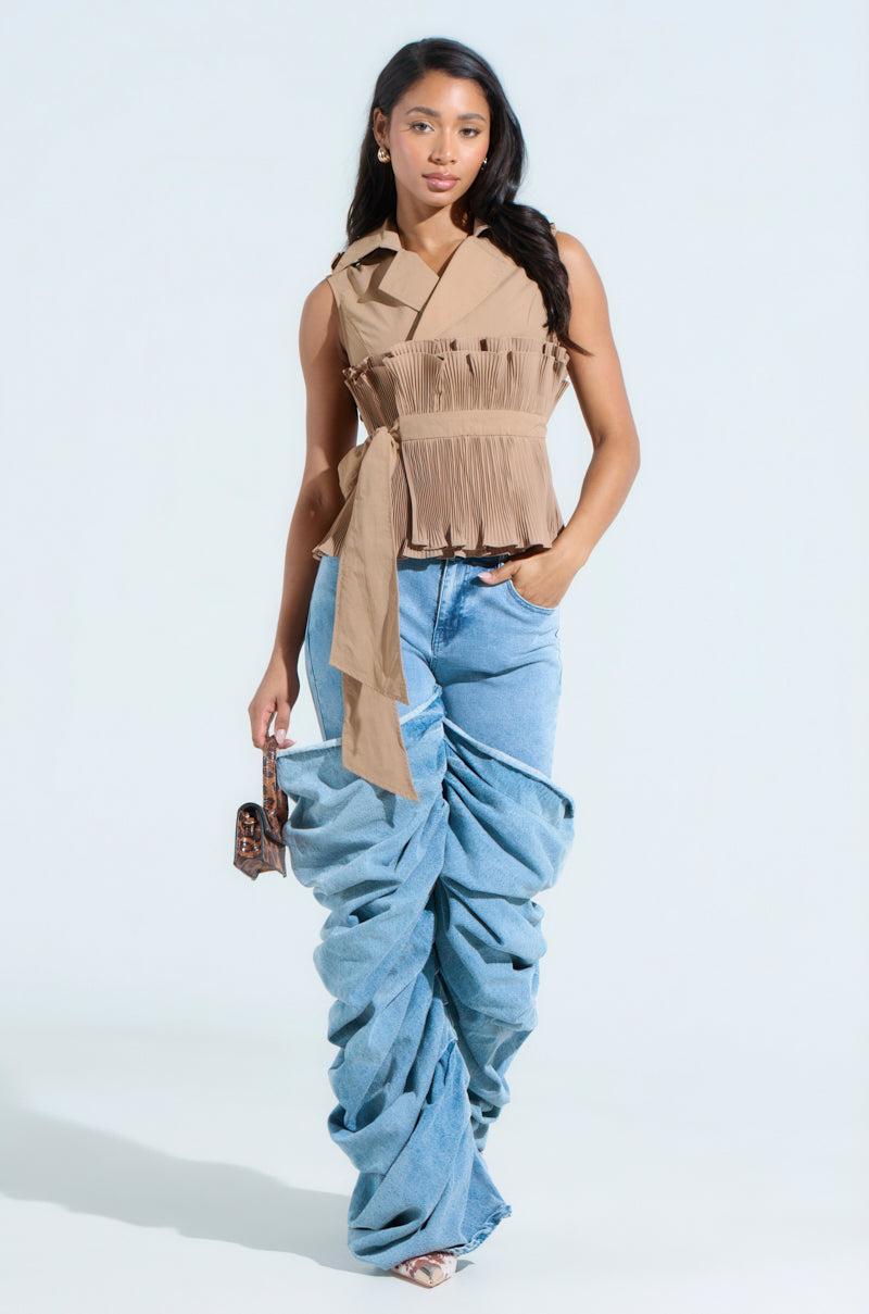 Pretty ‘n posh. The AKIRA Label Show Me Love Blouse is a crafted from a swishy, non-stretch fabrication and features a sleeveless, vest-like silhouette, a notch lapel collar, shoulder epauletes, and chic, ruffled layers of accordion pleating. Complete with a wrap-front closure and a tonal, self-tie waist belt. - 100% Nylon- No Stretch- Imported (all measurements approximate from size small)- 21” Shoulder to Hem- 13.5” Shoulder to Shoulder- Model is 5’8” and wearing a size smallProduct ID: 470690