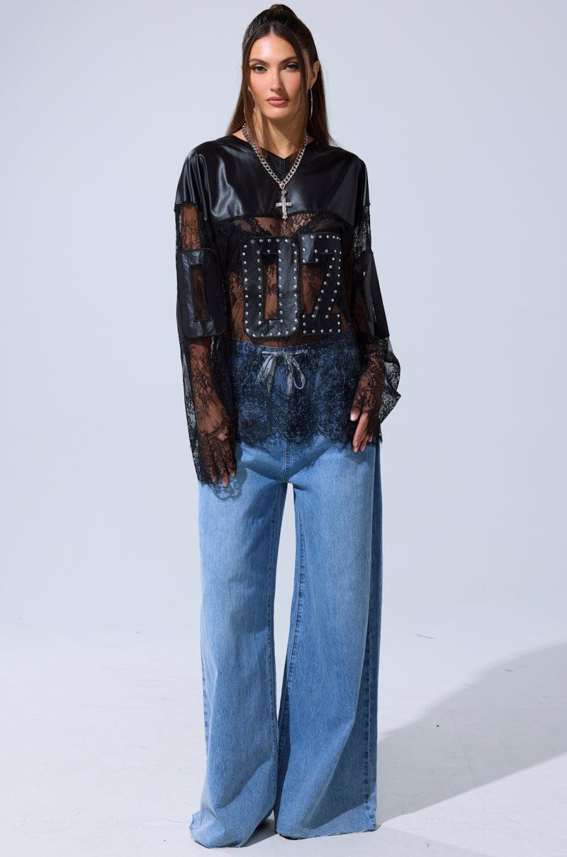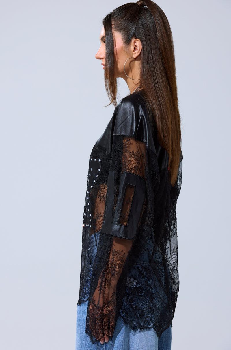 The AKIRA Label Show Off Lace Jersey Top mixes sporty and sultry elements for a bold streetwear-inspired look. Crafted with sheer black lace, it’s layered with sleek, satin-like paneling across the chest and shoulders. The oversized jersey number “07” is studded with rhinestones for extra edge, creating a striking contrast against the delicate lace. With long lace sleeves and a relaxed fit, this top blends athletic attitude with daring feminine detail. - Main: 89% Polyester, 11% Spandex, Contrast: 100% Polyamide- Some Stretch- Imported (all measurements approximate from size small)- 30” Shoulder to Hem- 25” Shoulder to Shoulder- 24” SleevesProduct ID: 1069900