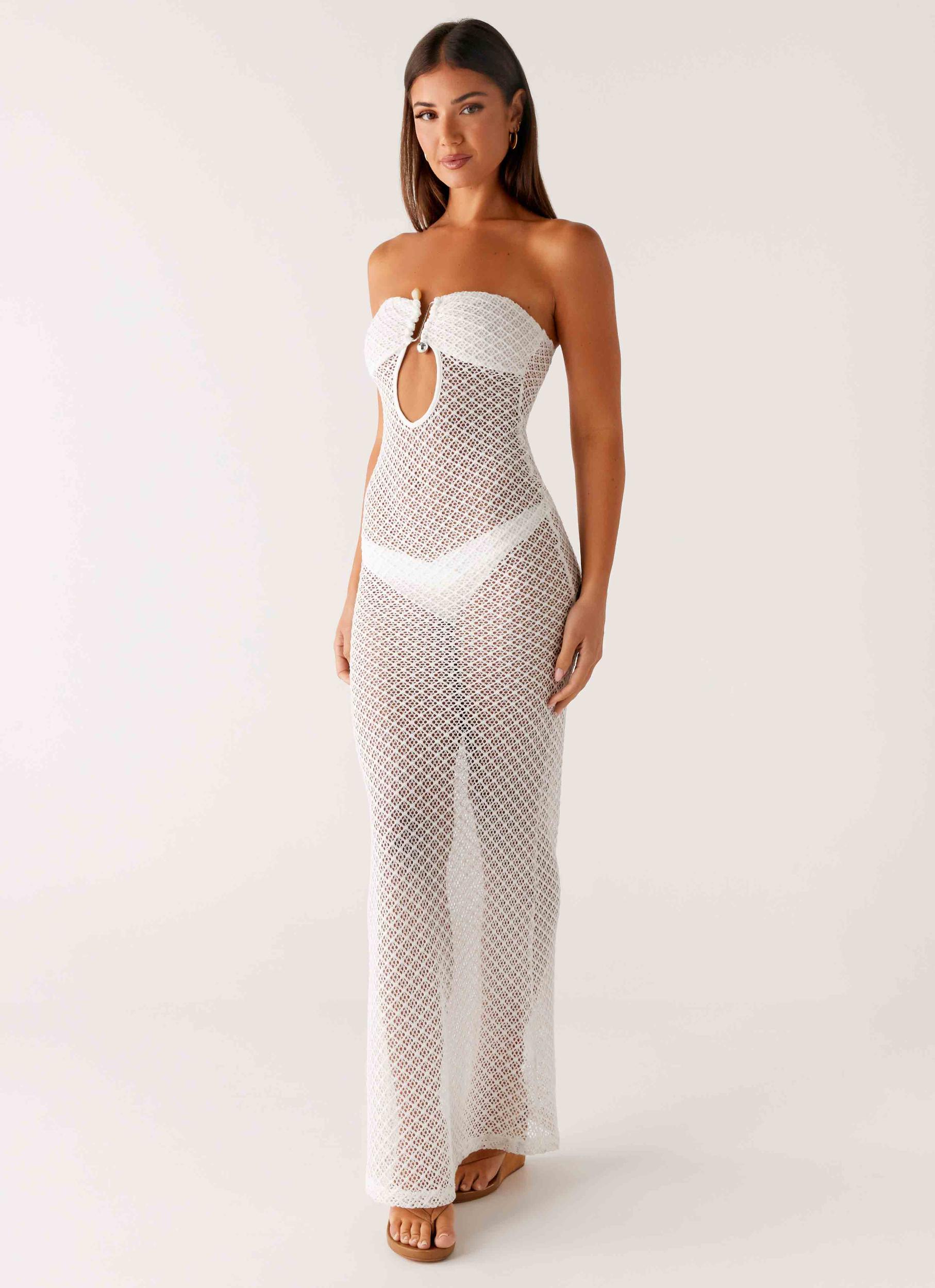 Peppermayo Exclusive Turn heads from golden hour to after dark in the Showcase Crochet Maxi Dress. This strapless silhouette features a lined bustier with silicone taping for a secure fit, a statement front metal embellishment, and a cut-out detail. Crafted from stretch crochet, it flows into a semi-sheer bodice and skirt for a bold, balmy-night finish. - Maxi length- Strapless neckline- Silicone neckline taping- Front metal embellishment- Lined bustier- Semi-sheer bodice to skirt- Stretch crochet fabric- Front cut-out- Fabric: 100% Polyester, L: 95% Polyester, 5% Spandex Size AU 8 / US 4 garment measurements: Bust: 68 cm / 26.77 inWaist: 58 cm / 22.83 inHip: 75 cm / 29.53 inLength: 132 cm / 51.97 in Dekota is 172cm and wearing a size AU 6 / and US 2