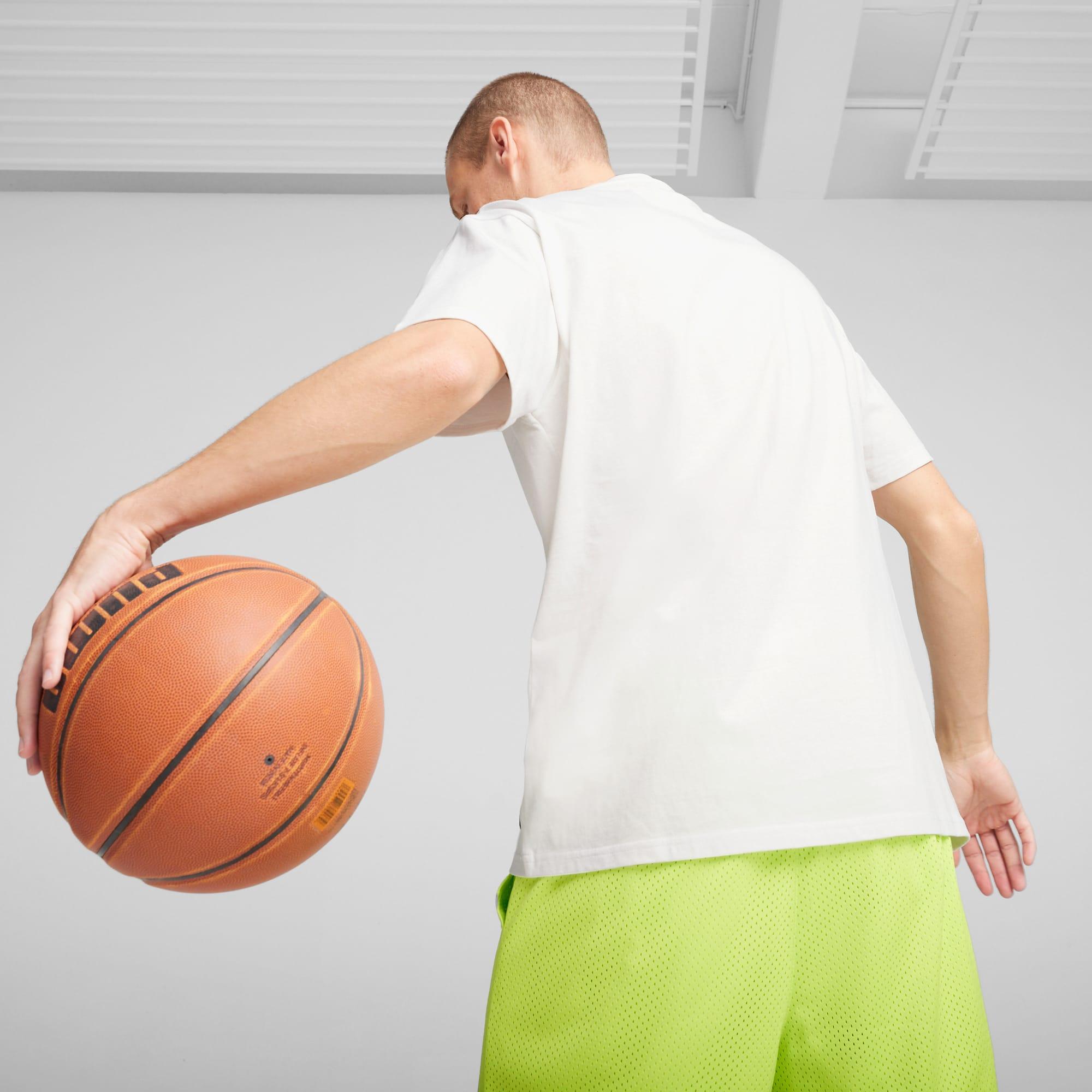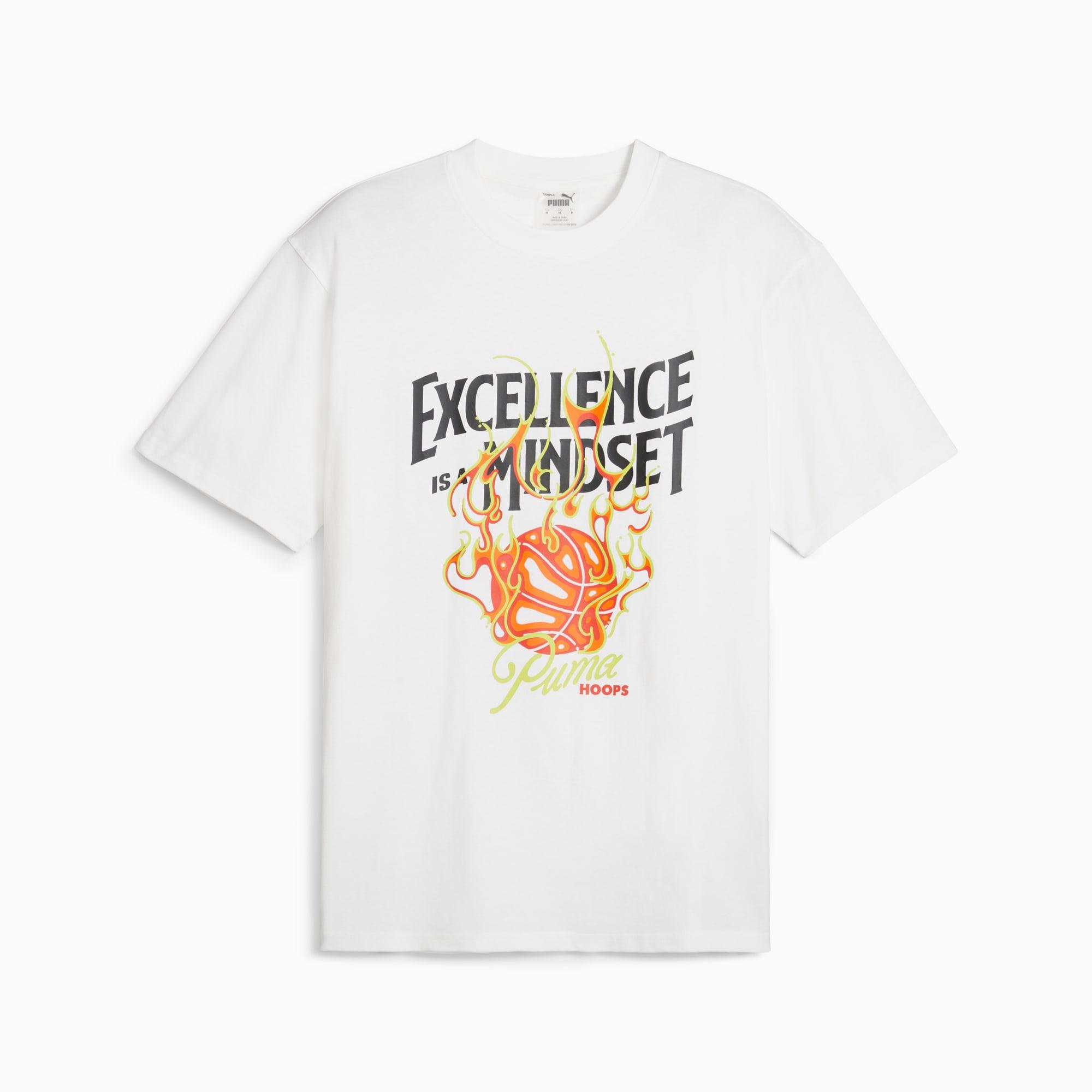 Take your training to championship levels in this recycled cotton tee. Built for the grind, its breathable yet durable design helps you find an extra gear on the court and push past your limits. Now, bring the heat. FEATURES & BENEFITS Made with at least 20% recycled cotton. Regular fit185 gsm, JerseyCrew NeckShort sleevesEXCELLENCE IS A MINDSET motif on the front | PUMA SHOWTIME Hoops Excellence Men's Basketball T-Shirt in White, Size M