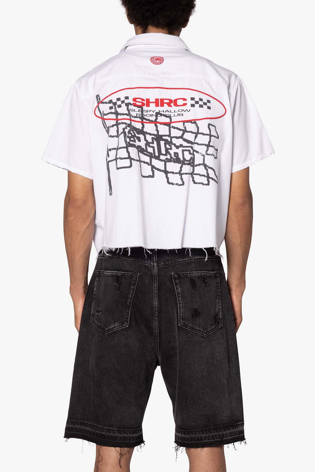 the SHRC Checkered Flag Cropped Shirt is made from a lightweight cotton fabric. The relaxed-fit shirt features a button placket, screen prints, embroidery, and patch details throughout, and is finished with a pocket on the chest. details relaxed, cropped fit 100% cotton model is 6’0, 140 lbs and wears a size medium