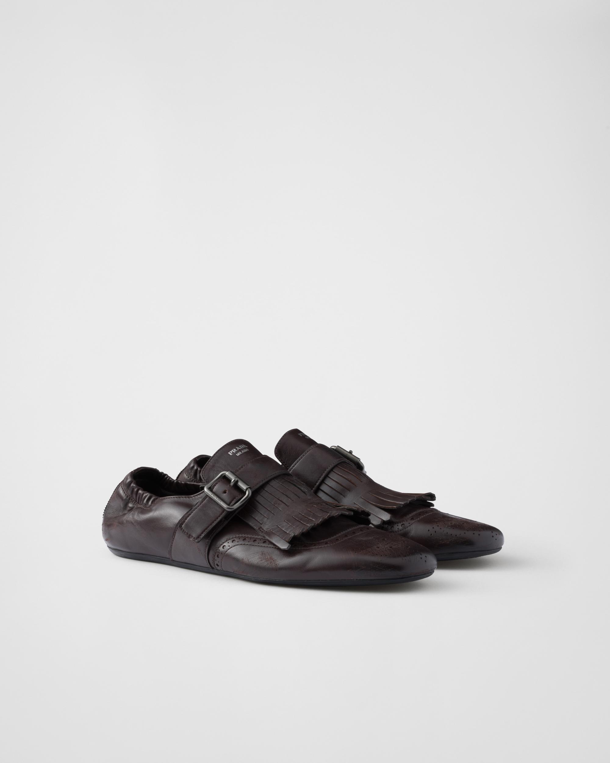Men's formal footwear is reinterpreted with soft and flexible deconstructed silhouettes. These monk strap leather shoes with a vintage finish are enriched by fringe and a classic brogue motif, while the thin soles enhance the innovative and contemporary aesthetic of the design.