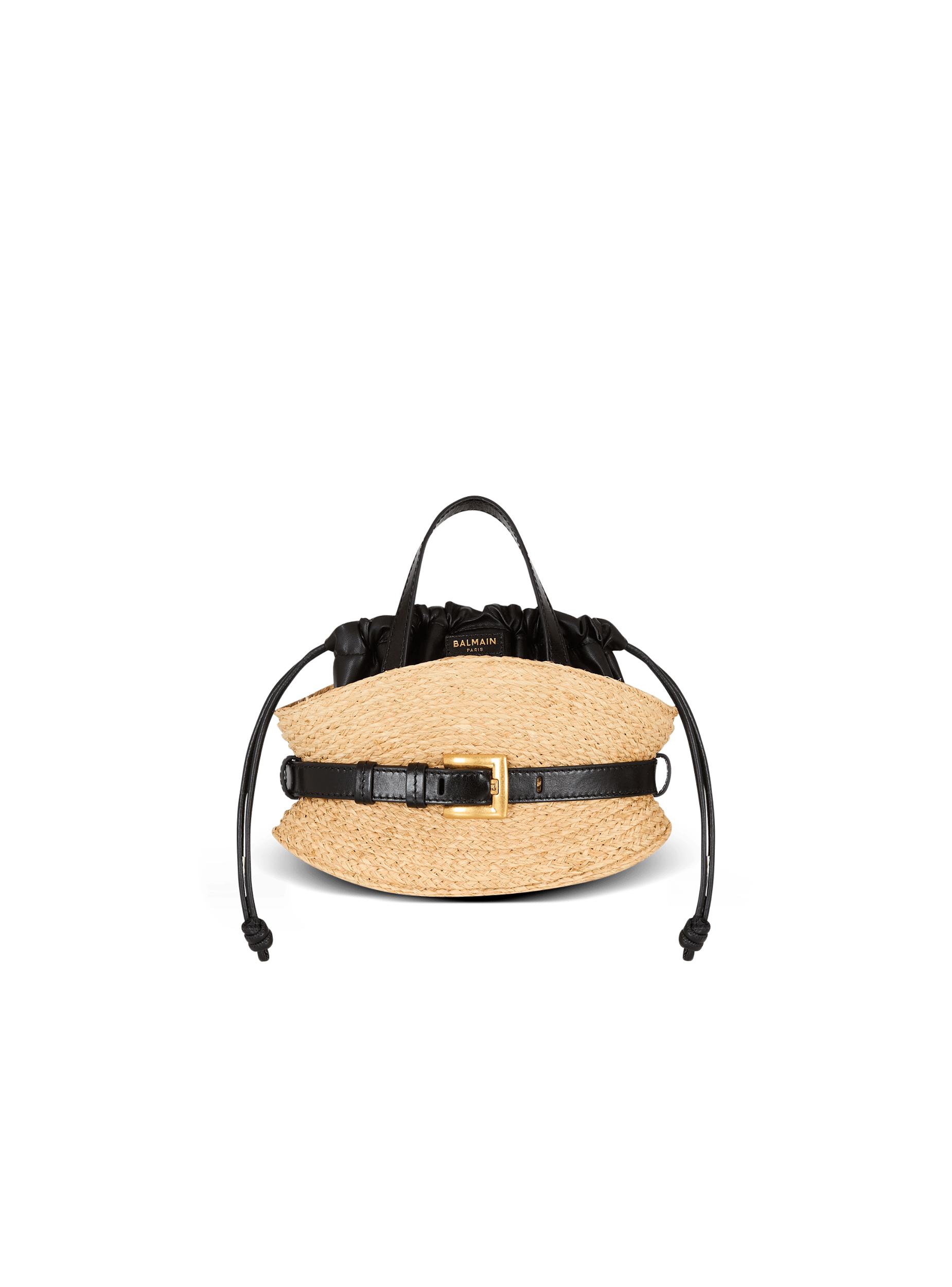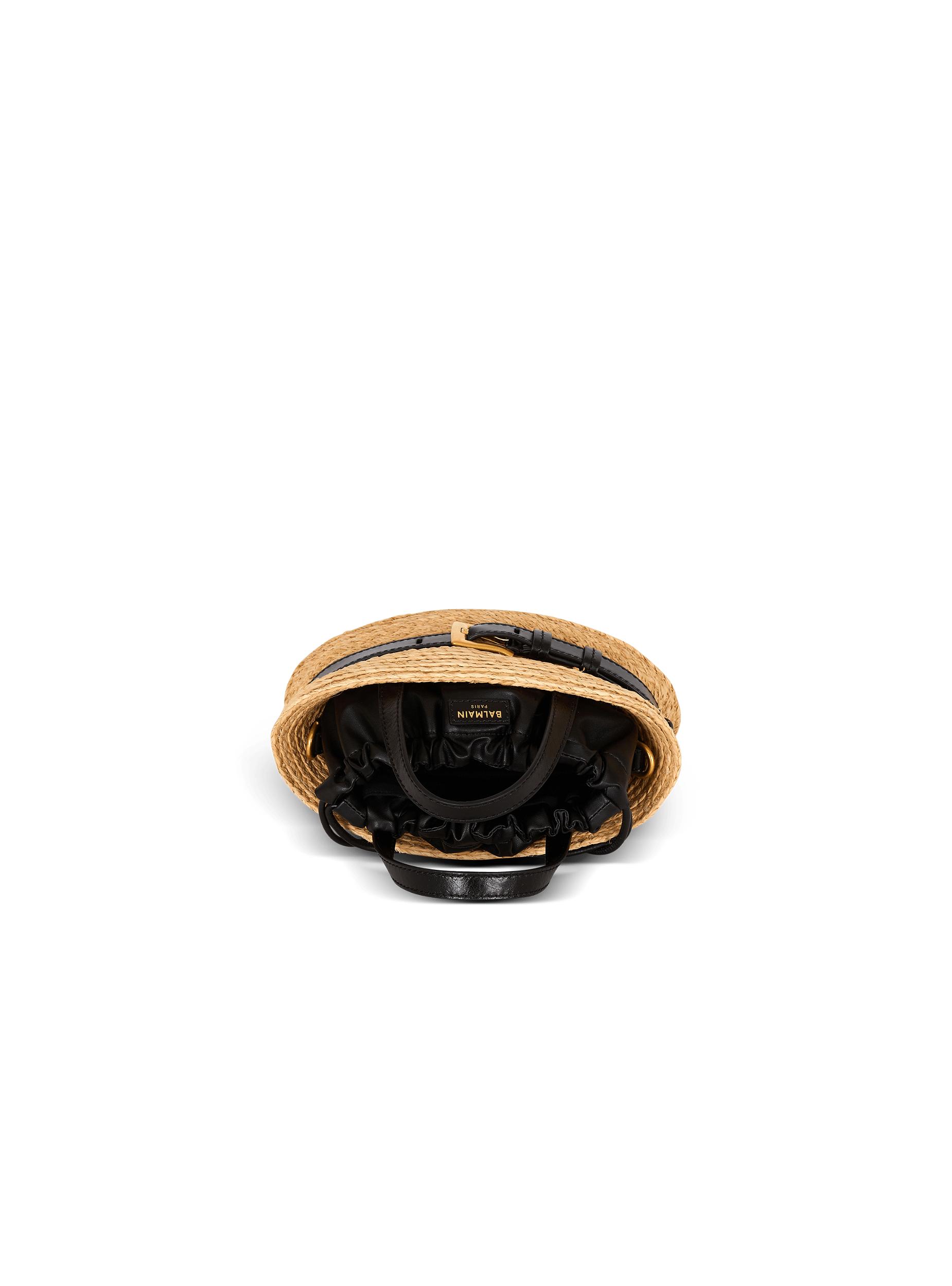 Belted styleCarry in the hand, on the shoulder or across the bodyAdjustable and detachable leather shoulder strap with stud buttonLeather handlesBelt with metal PB-engraved buckleBalmain Paris-embossed faux leather inside bag with drawstring tiesFastening with adjustable tiesGold hardwareDimensions: 10 x 23 x 13 cmMain material: 100% raffiaMade in ItalyItem: FN1DP017TRBO
