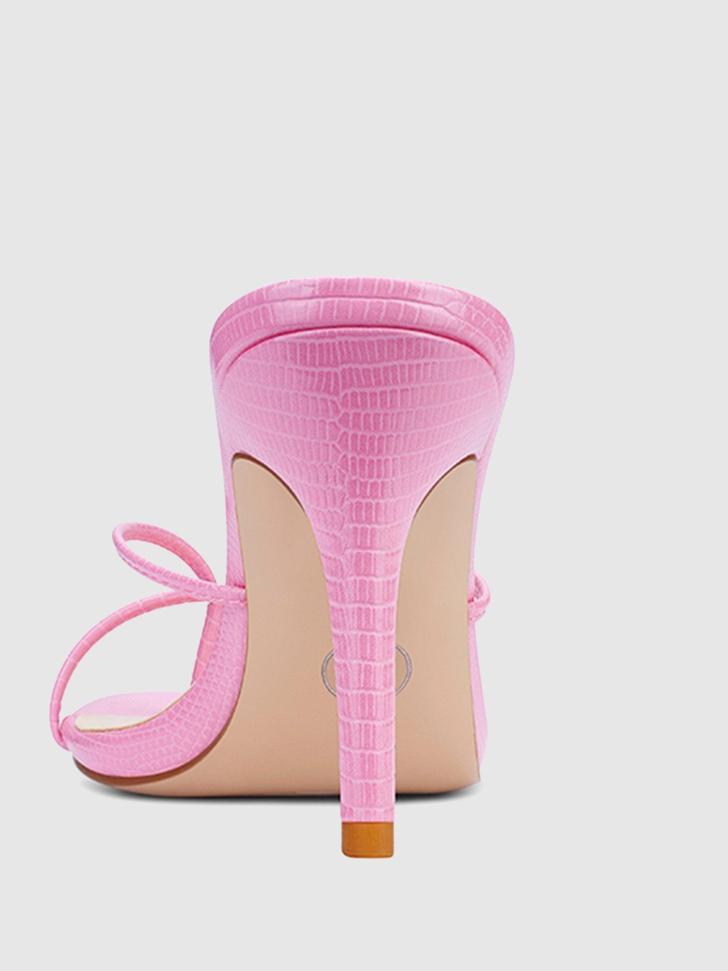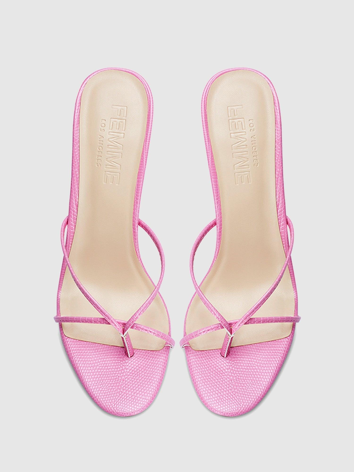 Imbued with a subtle lizard print and signature strap design, the Sicilian Slipper is a sleek and sophisticated addition to your wardrobe. Featuring a versatile kitten heel, these slippers are the perfect companion to all of your adventures. Vegan upper Vegan insole Vegan outsole Open pointed toe Slip-on Handmade Designed in LA Self-covered stiletto heel, 3.34" (85mm)