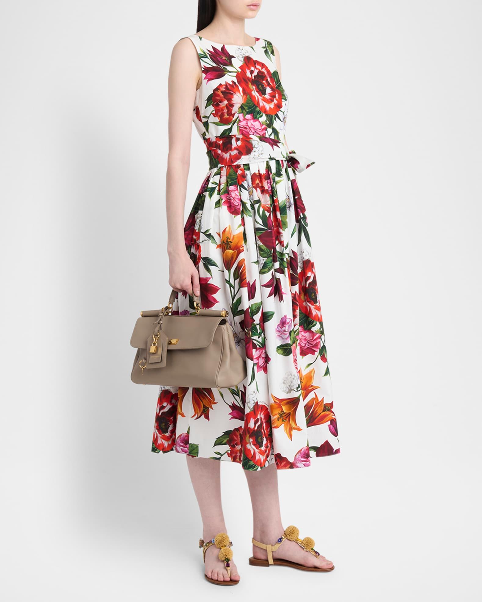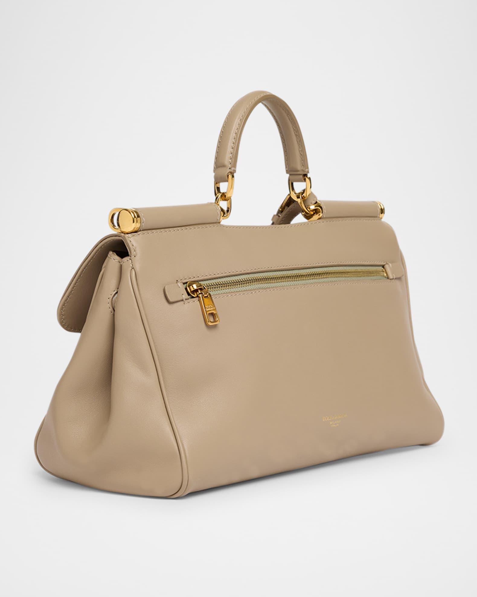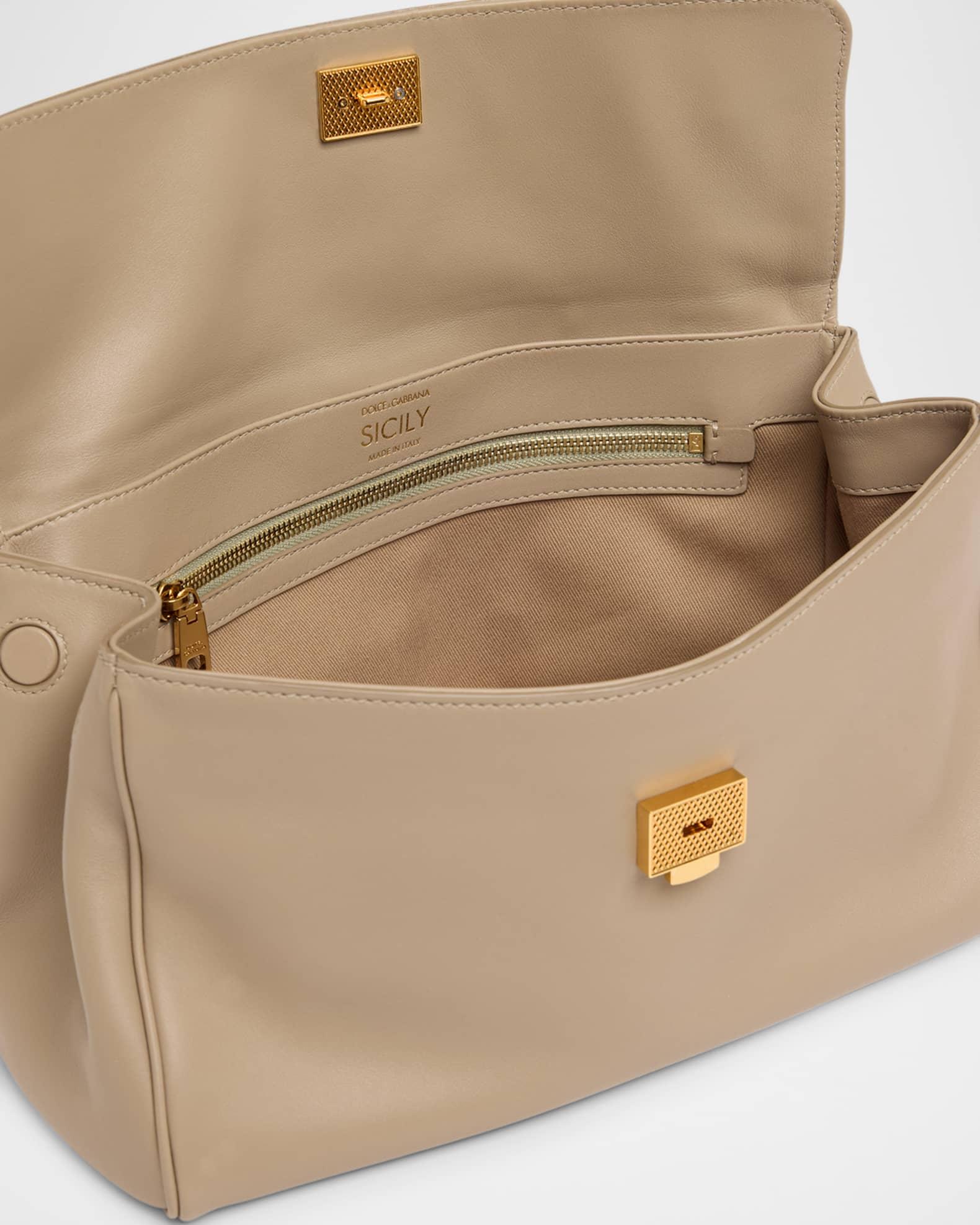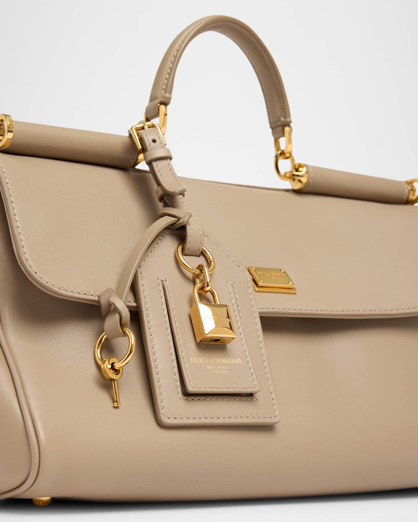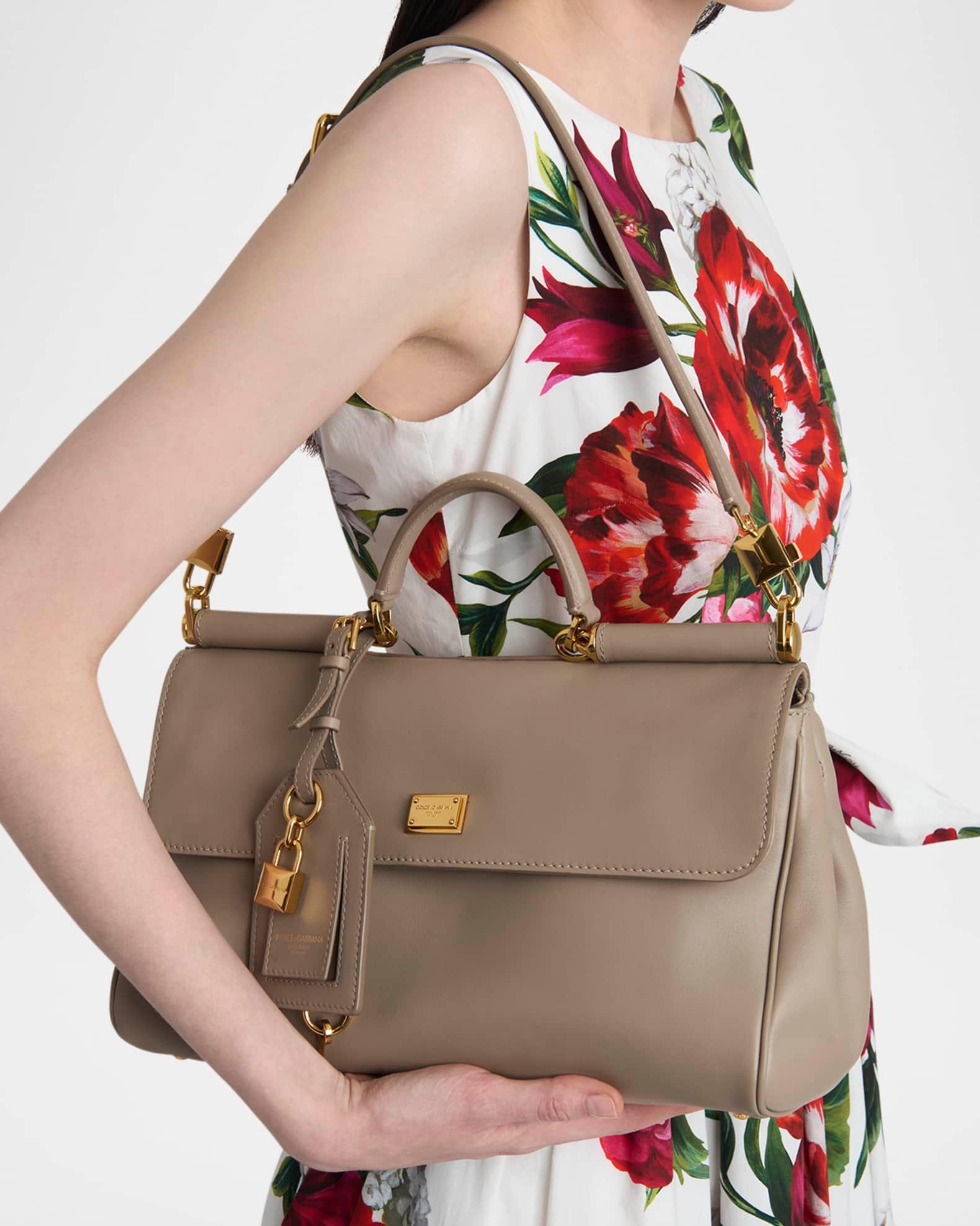 Dolce&Gabbana "Sicily" top handle bag in leather and fabric Top handle with padlock charm and logo tag Detachable, adjustable shoulder strap Can be worn as a top handle or shoulder bag Flap top with push-lock and side magnetic closures Exterior, back zip pocket Interior, one zip pocket Feet protect bottom of bag Approx. 8"H x 12"W x 5"D PVC Made in Italy