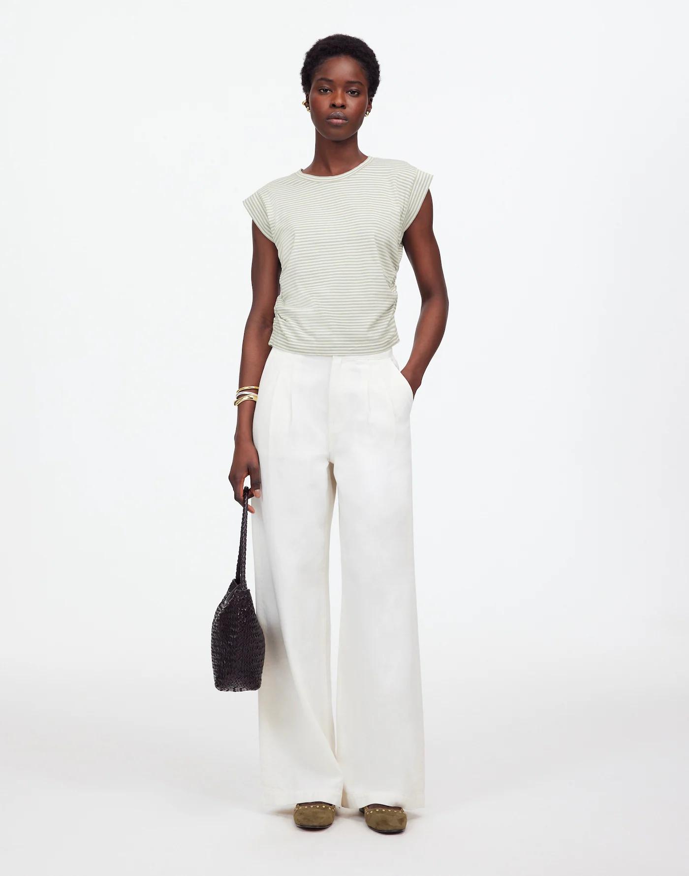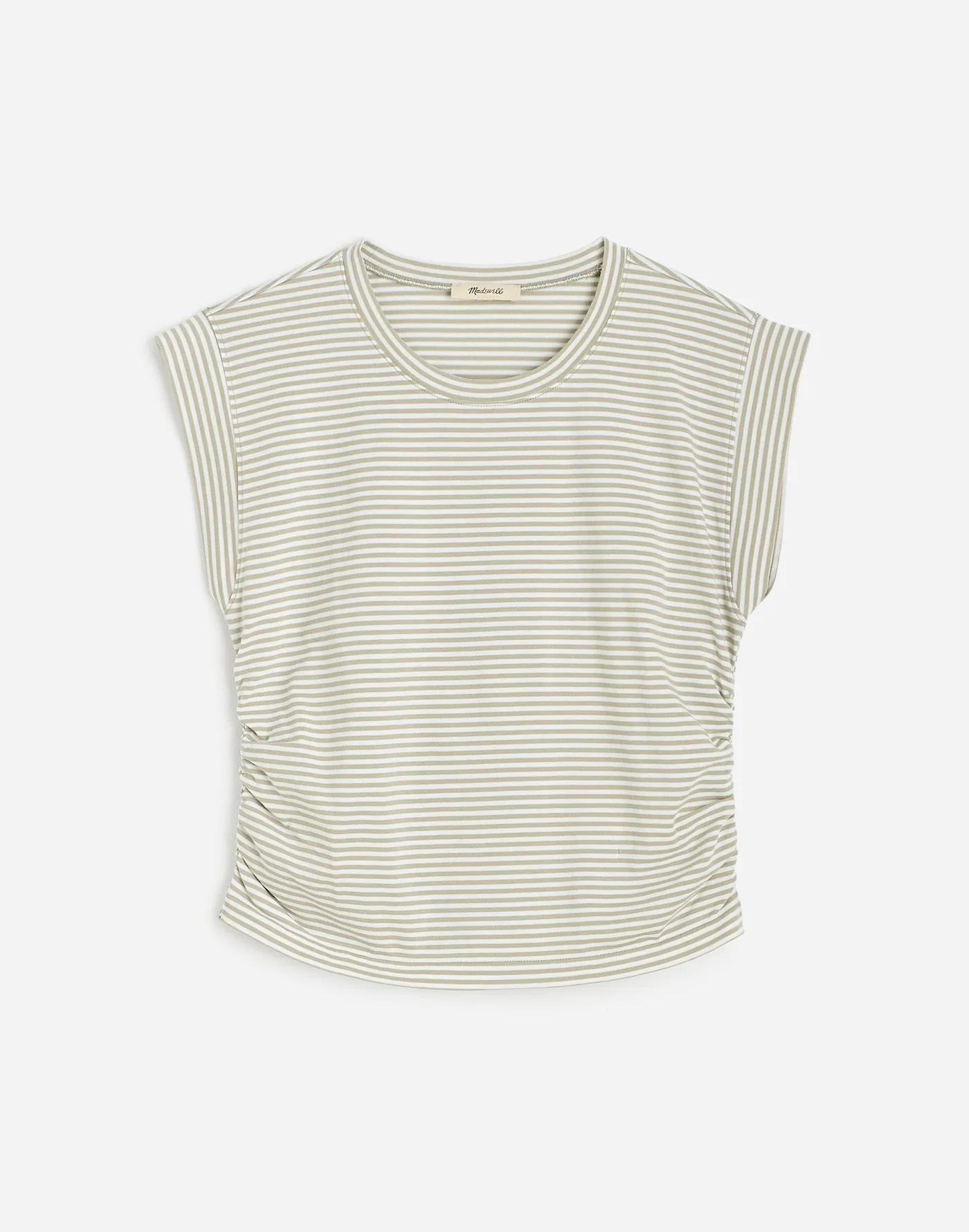 Made of drapey cotton-TENCEL™ Lyocell blend jersey, this striped muscle tee features a crewneck and barely-there cap sleeves. The real star is the side cinching, giving it a flattering fit our head stylist is obsessing over.