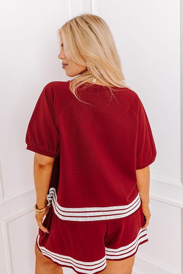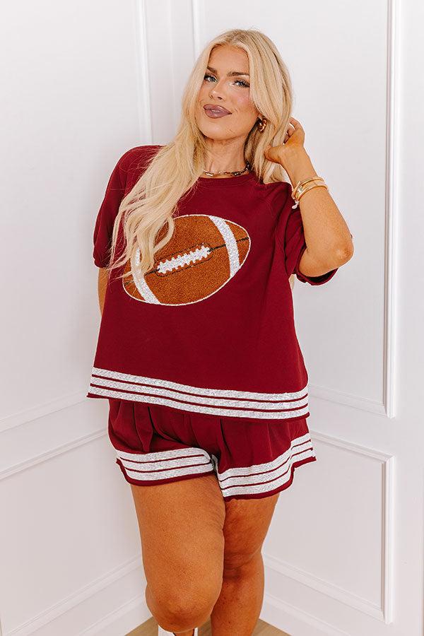- Be ready for touchdowns and tailgates with this sparkling top! Its super cute sequined football design and jersey-style accent stripes are perfect for bringing a bit of glam to game day. Put a trendy twist on sporty style with this adorable piece! Show your team spirit with our vibrant clothing collection inspired by the bold colors of popular college football teams like the Alabama Crimson Tide. - Unlined cotton-blend material - A crew cut neckline - Short sleeves with ribbed cuffs - A brown, black, and white terrycloth football design featuring shimmering sequined accents - Sequined jersey-style accent stripes just above the hemline - A relaxed silhouette that ends in an unfinished hemline - This piece is a perfect game day option for fans of Arkansas, Georgia, Texas Tech, Alabama, Oklahoma, Ole Miss, Kansas, SMU, and more!