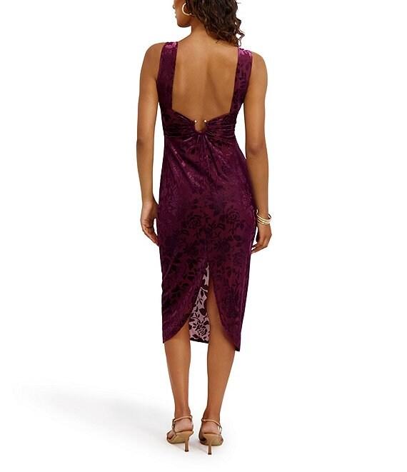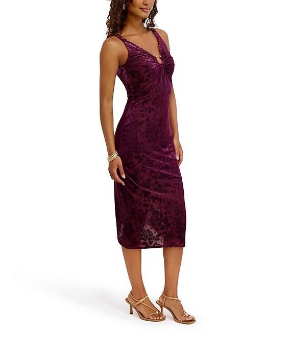 From SIENA, this dress features: Burnout velvet fabrication Sheath silhouette V-neckline with hardware Sleeveless Floral velvet pattern Front and back hardware detail Midi Zip back closure Approx. 45" length Polyester/nylon/spandex Hand wash in cold water Imported.
