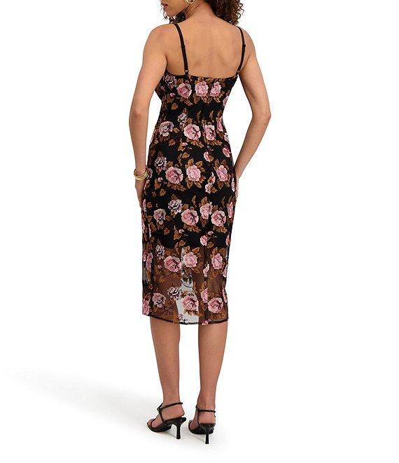 From SIENA, this dress features: Embroidered mesh fabrication Faux wrap silhouette Sleeveless Spaghetti straps Split slit in middle of skirt Illusion mesh skirt Zip back closure Approx. 36" length Polyester/nylon Machine wash cold Imported.