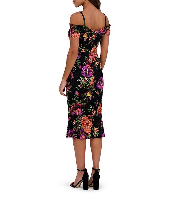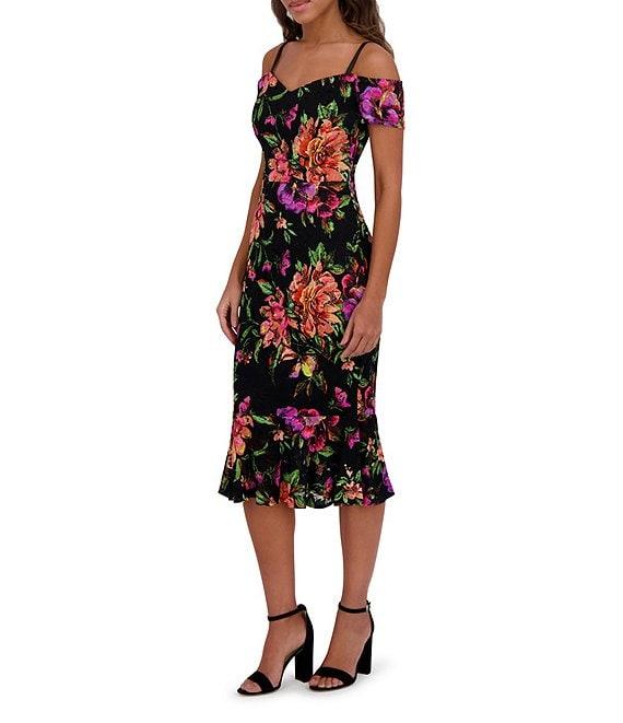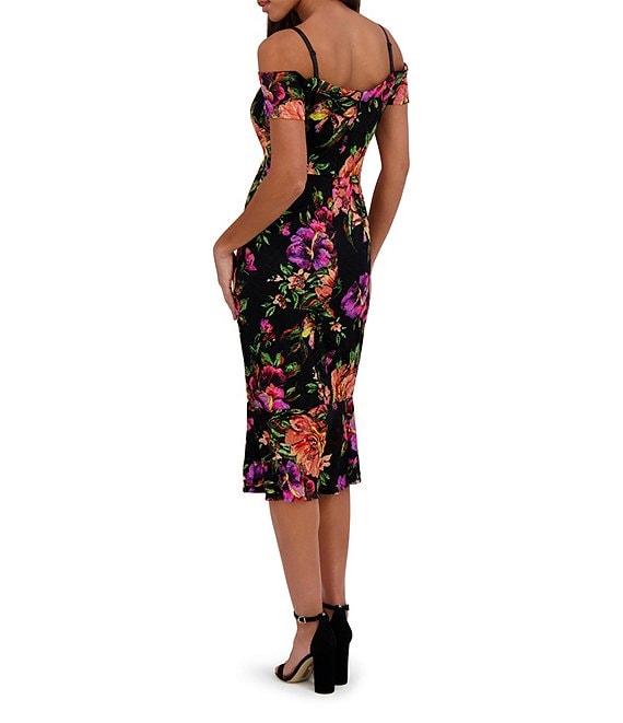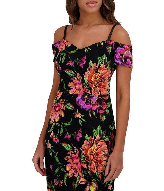 From SIENA, this dress features: Stretch lace fabrication Floral print Sheath silhouette Off-the-shoulder neckline Short sleeves Lined Back zipper closure Polyester Hand wash Imported.