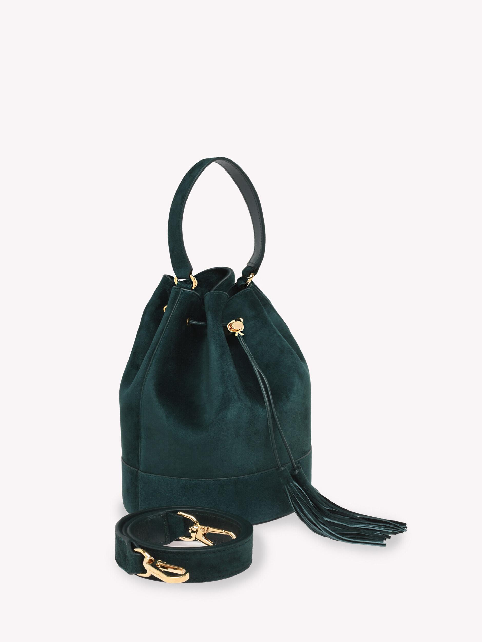 Crafted from supple suede, Sienna 22 is a bucket bag with the signature Ribbon toggle, a top handle and an adjustable and removable shoulder strap. The inside of the bag, lined in satin, presents a pocket and a metallic zip. Handmade in Italy. Size: H 25cm; W 22cm; D 18cm.