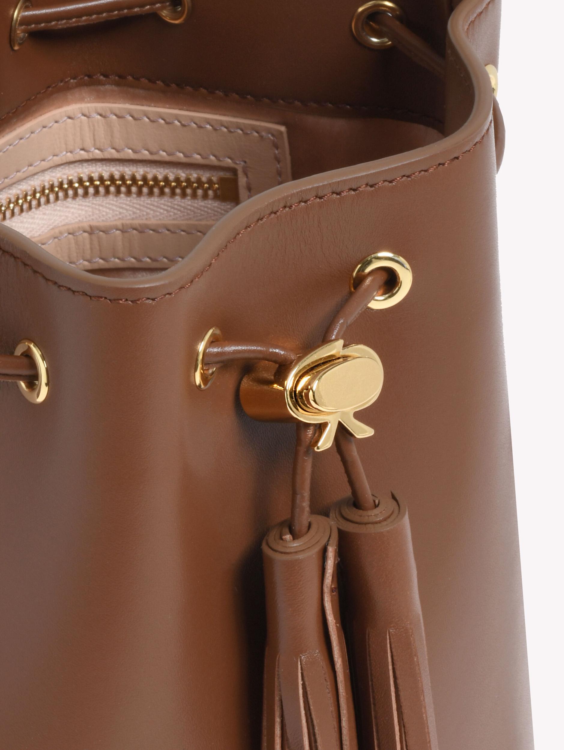 Crafted from leather, Sienna is a bucket bag with a drawstring top, a top handle and an adjustable and removable shoulder strap. The metallic toggle presents the signature Ribbon detail. The inside of the bag, lined in satin, presents a pocket and a metallic zip. Handmade in Italy.