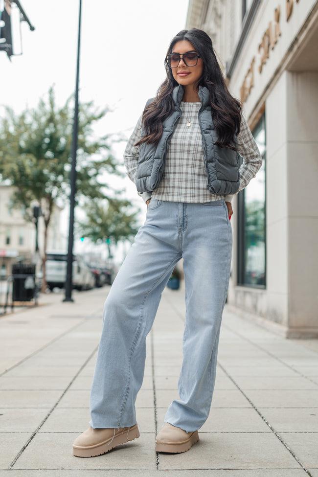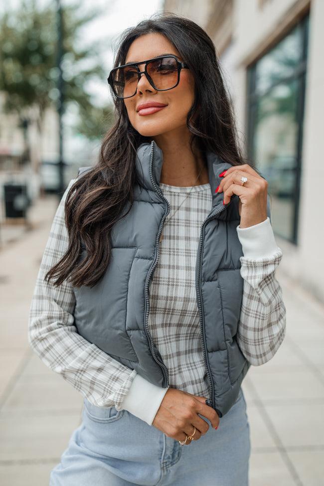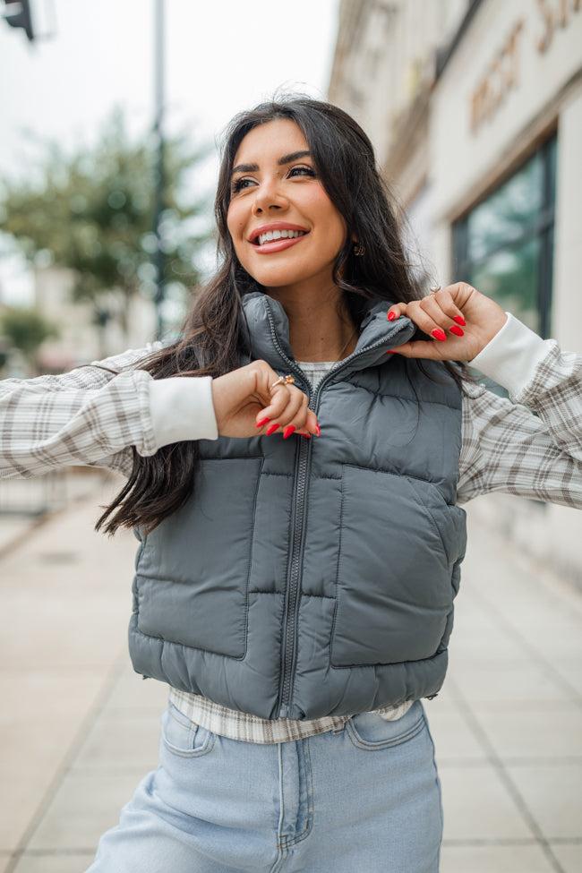 Details Slate Cropped Puffer Vest Fabric has no stretch Puffer style with functional zipper and a collar Pair this with a long sleeve shirt and high-waisted jeans! Lined Size small from shoulder to hem: 17" Material and Care 100% polyester Hand wash cold, do not tumble dry Patterns may vary Materials may have natural variations Colors may vary from different viewing devices.