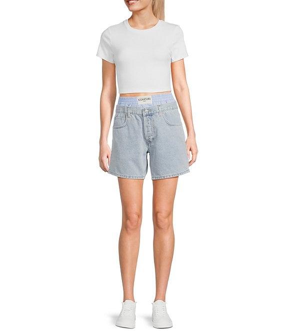 From Signature 8, these shorts feature:DenimHigh riseBoxer peek a boo waist5-pocket/jeansPull-on stylingAcrylicMachine wash/tumble dryImported.