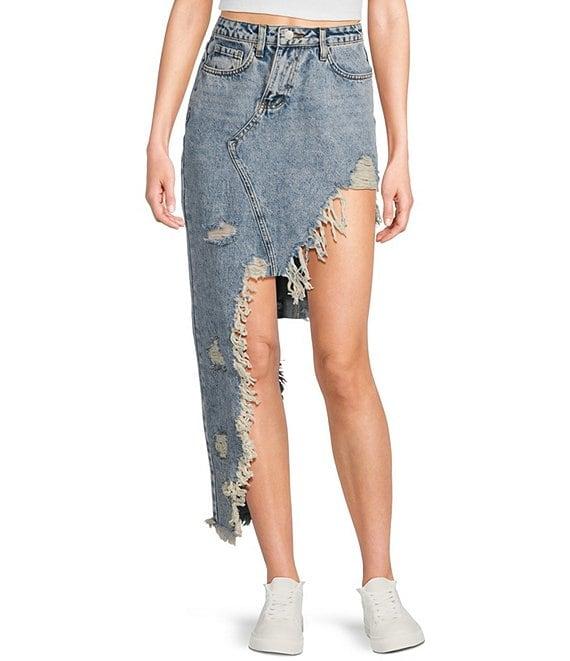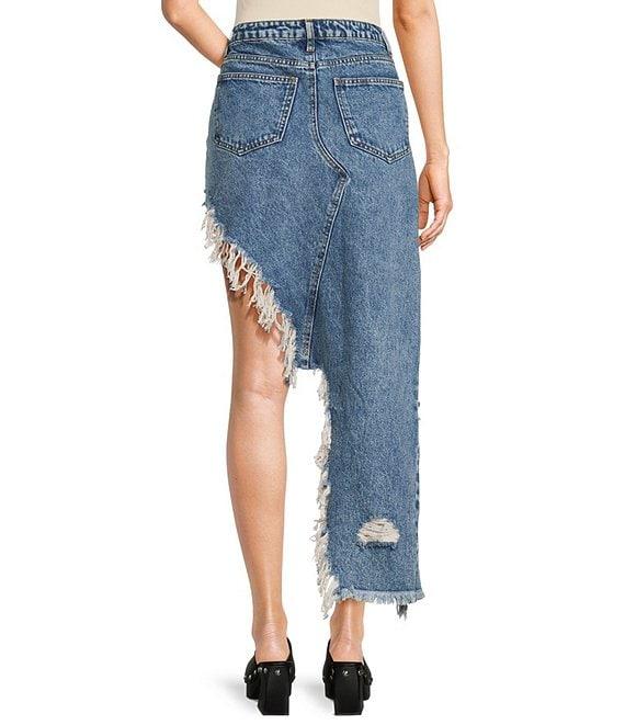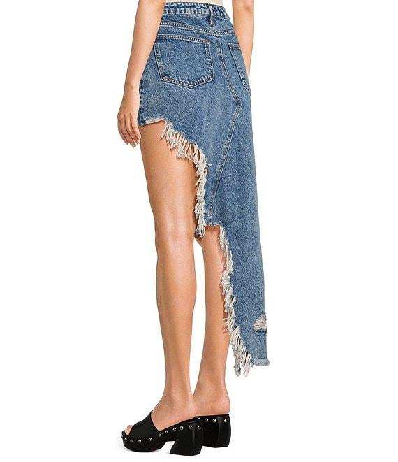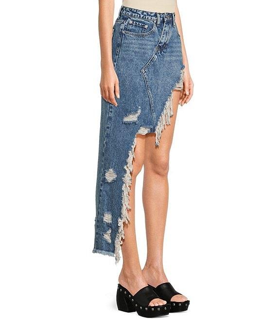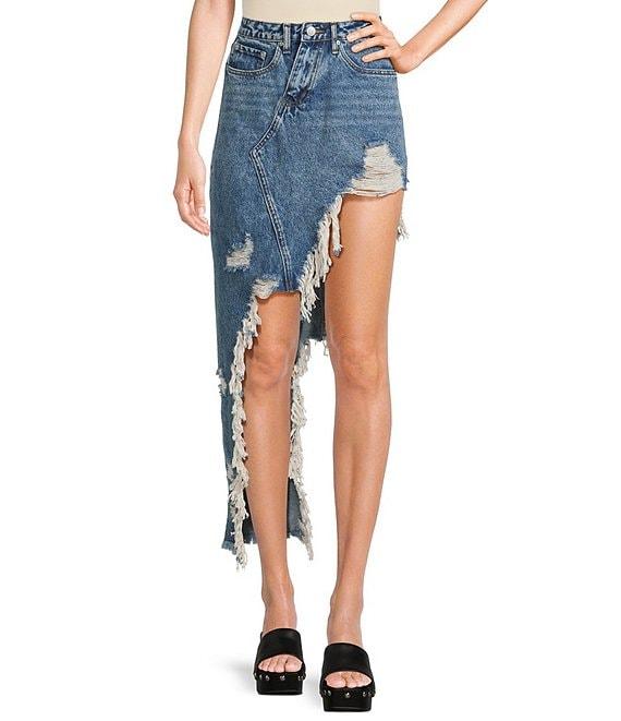 Signature 8 High-Low Fringed Distressed Denim Skirt