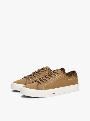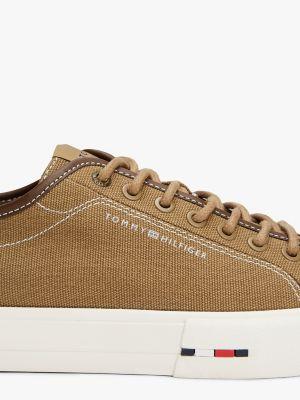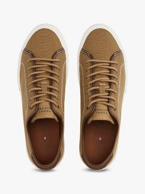 Tommy Hilfiger men's sneaker. These low-top sneakers are made from cotton canvas for summer-ready appeal with a flexible, vulcanized rubber sole.