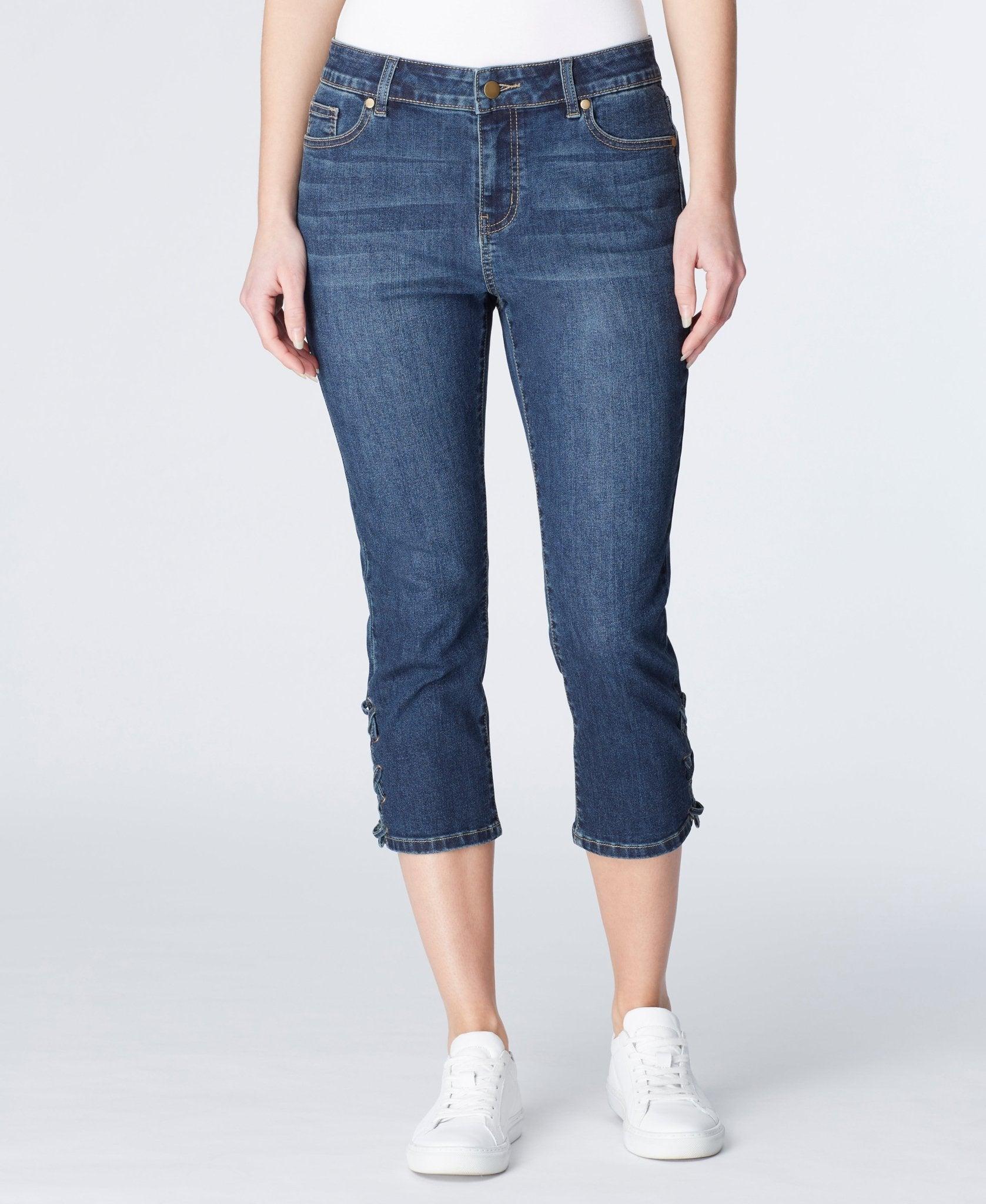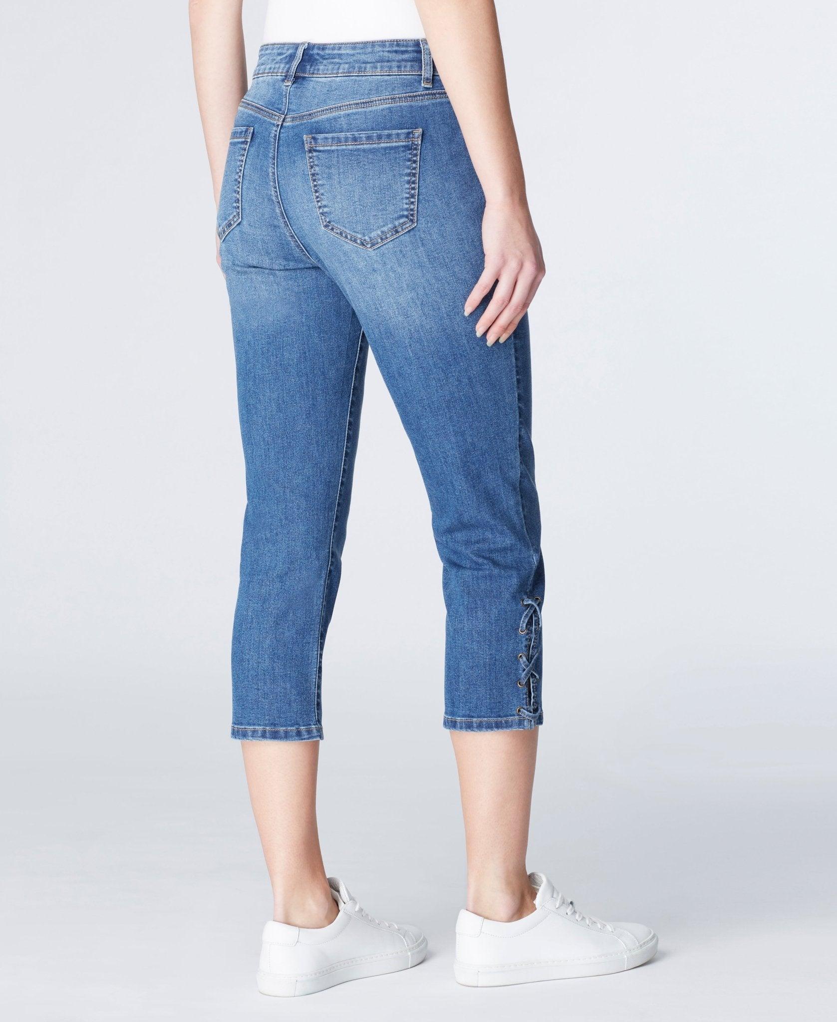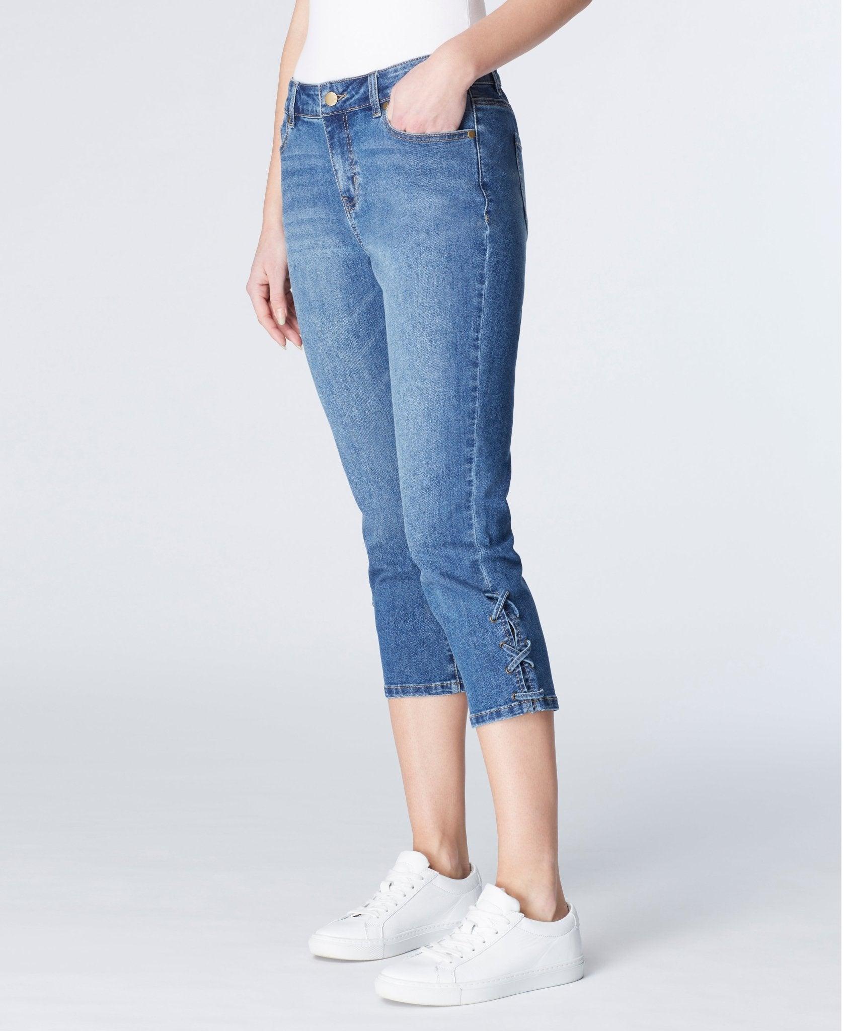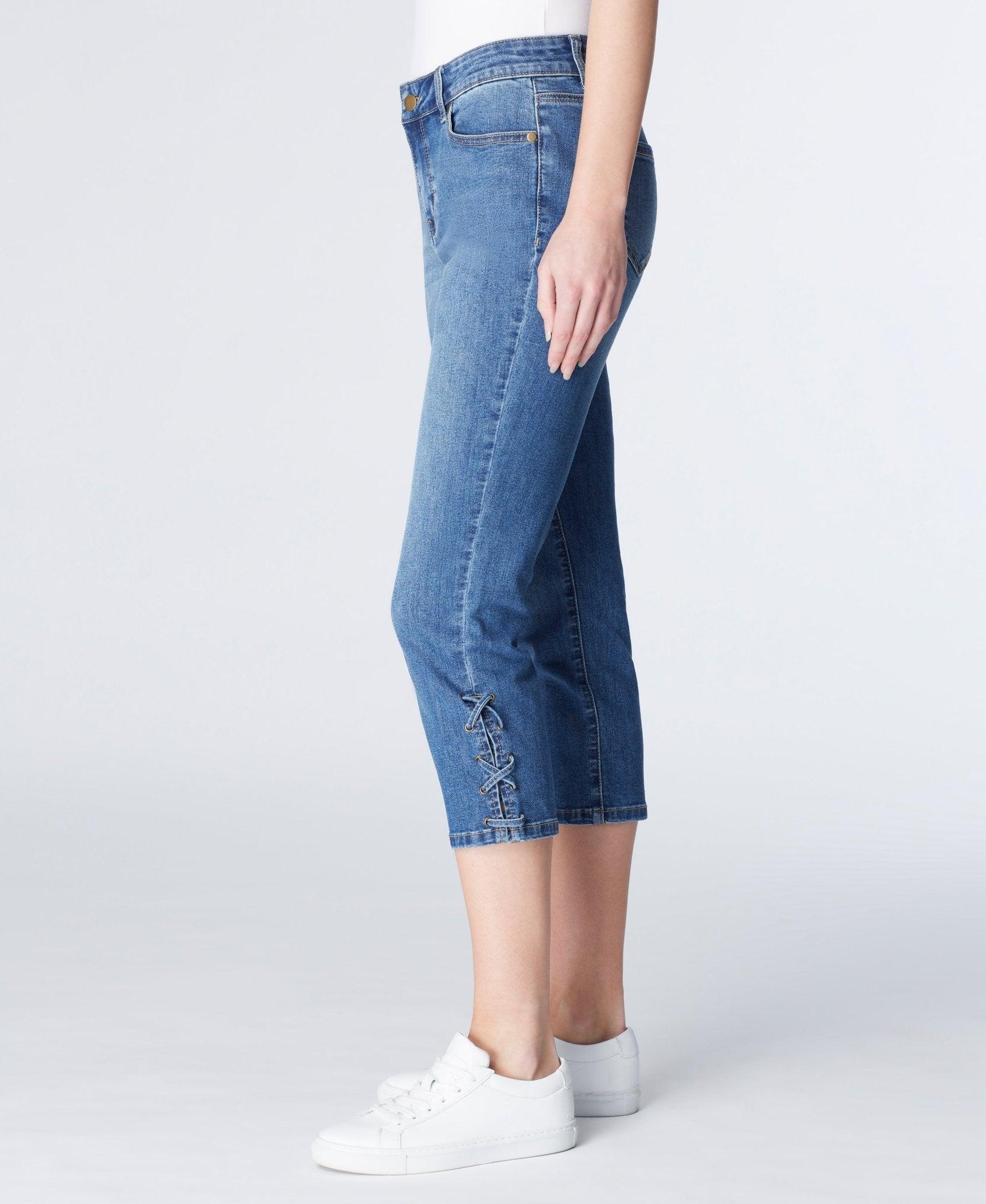 Capri with side slit and lace throughout grommet holes. Lycra gives great stretch for a comfortable and flexible fit jean. Product Details: Capri with Side Slit Lace Throughout Grommet Holes Mid Rise Pant Inseam: 23" Leg Opening: 13 3/4" Made in China Fabric Content: 72% Cotton 24% Polyester 1% Spandex 3% Fabric