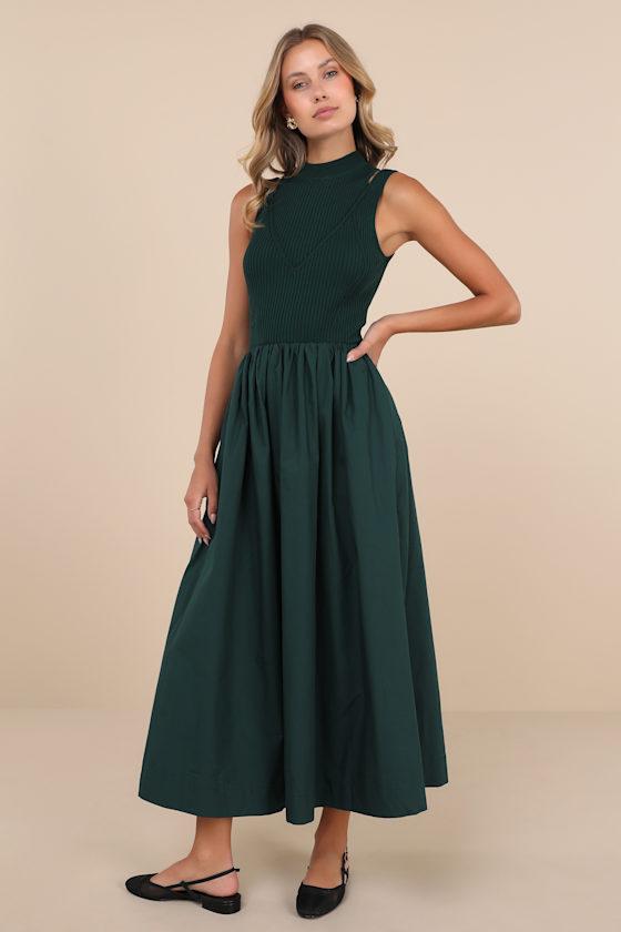 Sophisticated style is simple with a très chic look like the En Saison Sigrid Forest Green Ribbed Crew Neck Maxi Dress With Pockets! Stretchy ribbed knit shapes a sleeveless bodice with a stylish crew neckline and angular, cutout details at the shoulders. Seaming details throughout lend a modern touch, while a fitted waist tops a voluminous gathered skirt that has side seam pockets and ends at a maxi hem.