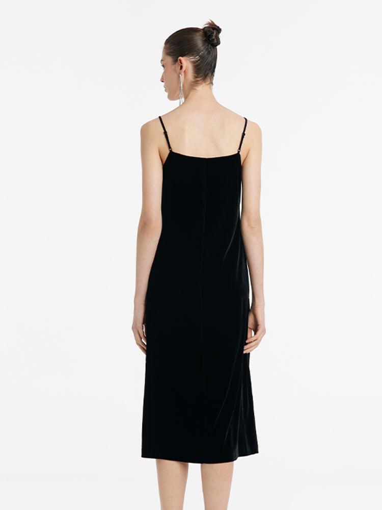 -V-neck -Soft and comfortable -Party wear The dress is crafted from a silk velvet blend, containing 13% mulberry silk, ensuring the fabric's high quality is palpable in its understated, soft sheen, and smooth, lightweight feel that gracefully drapes the body. The H-line fit allows for unencumbered movement, with a side