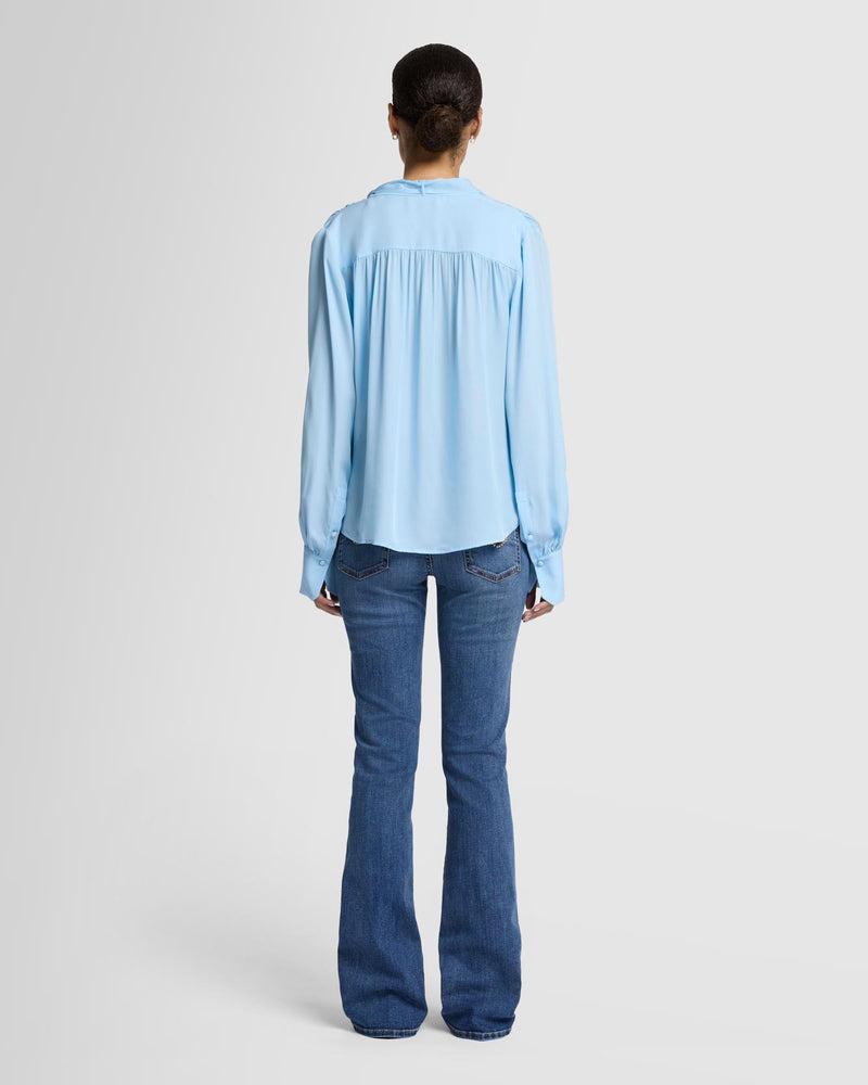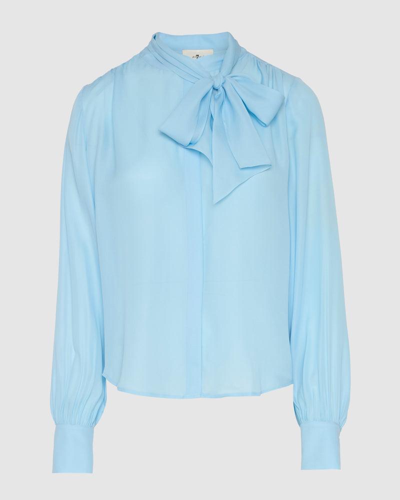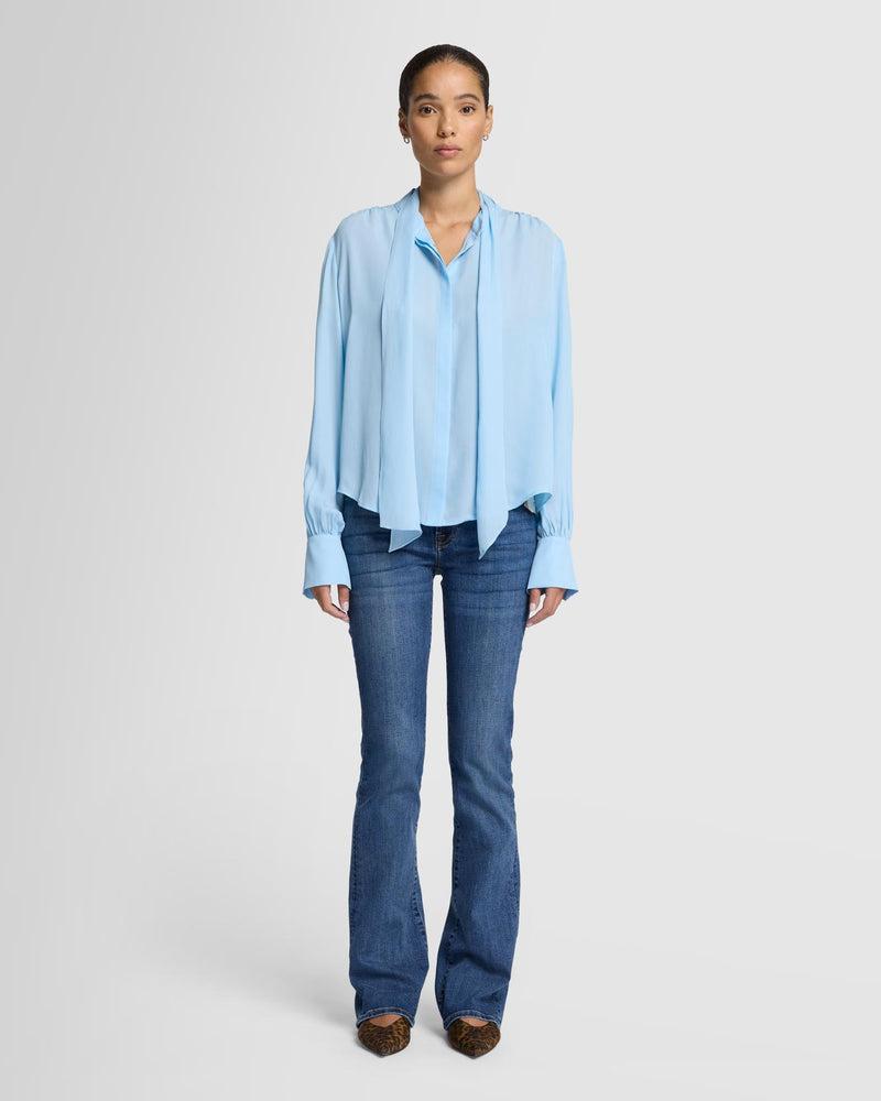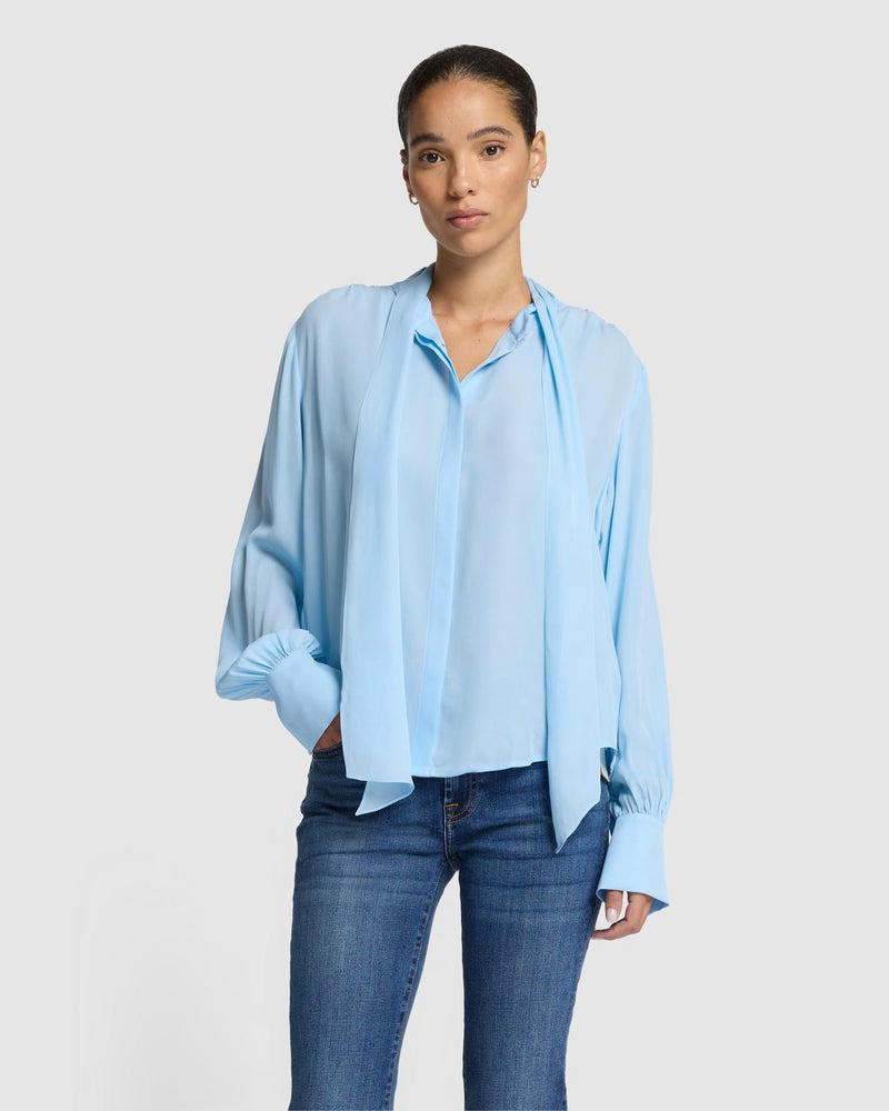 Fits like: Long-sleeve shirt with flowing sleeves, cinched cuffs and a detachable neck scarf. Relaxed fit through the body.Feels like: Soft and lightweight. The Details: 100% Silk Pale blue shade Collarless Slightly sheer Detachable neck scarf
