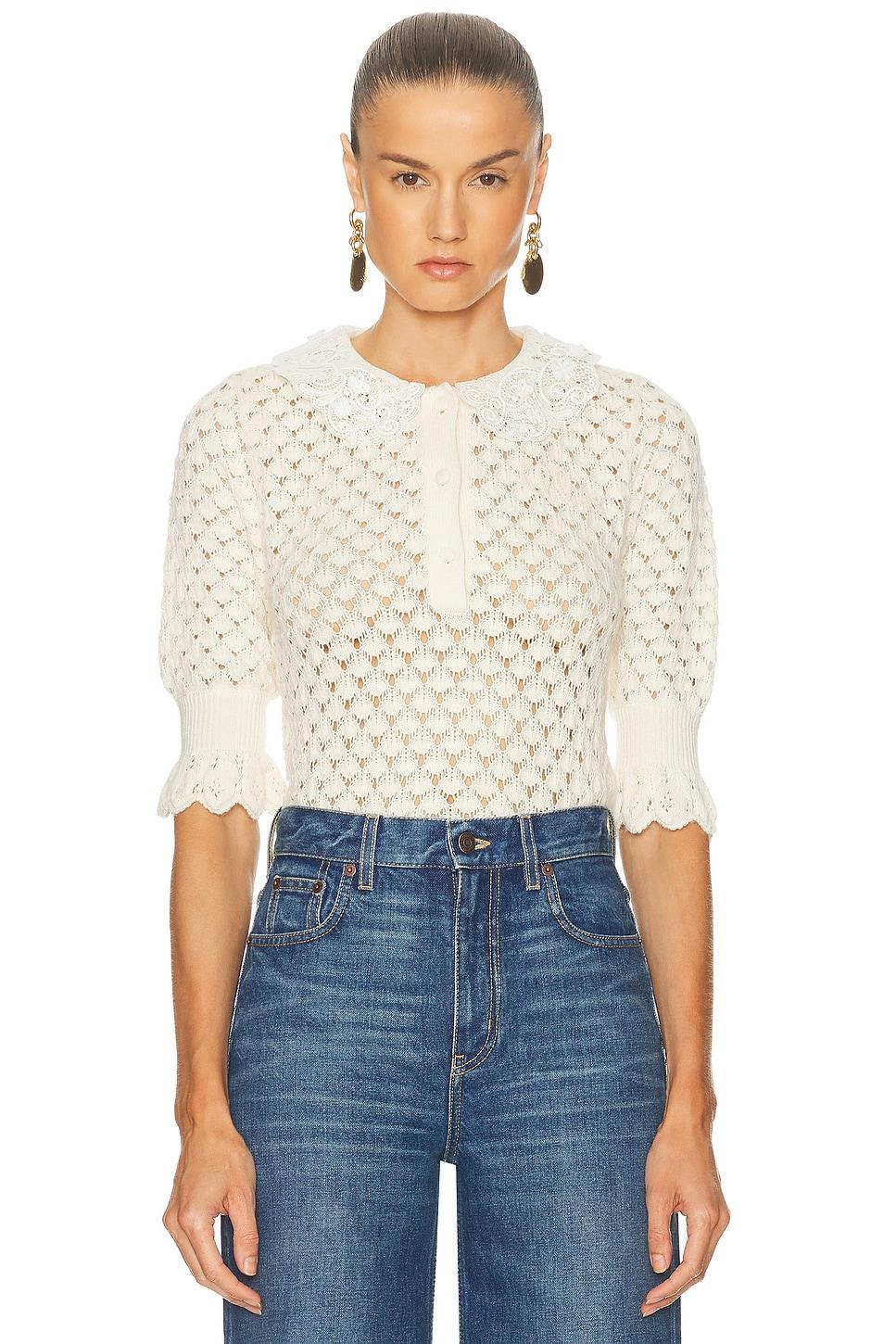 sweaterSelf: 72% cotton, 17% alpaca, 11% silkContrast Fabric: 68% cotton, 17% alpaca, 10% silk, 4% polyamide, 1% elastane / Dry clean only / Front partial button closure / Ribbed trim / Lace collar detailing / Cropped fit / Midweight knit fabric / Garment is made with a semi-sheer fabric, undergarments can show through / Made in Italy / Our Style No. CLOE-WK125 / Manufacturer Style No. 25AMP47590 / Model is wearing size S.