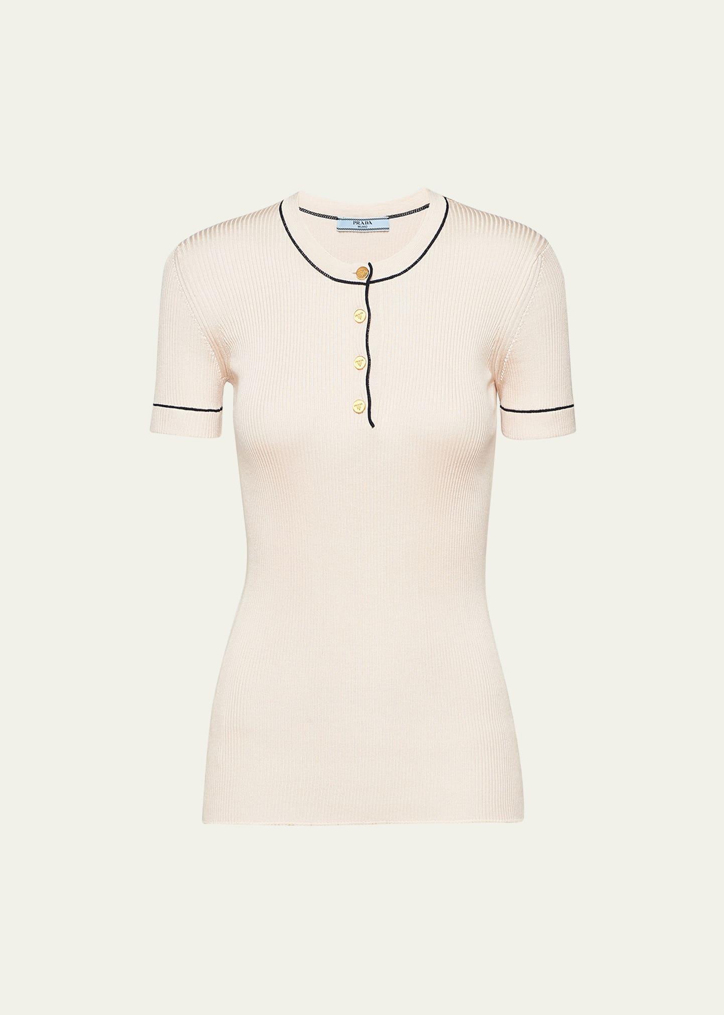 The sleek lines of this short-sleeved sweater are enhanced by the use of refined silk yarn. The slim-fit ribbed knit design is embellished with sophisticated details that emphasize its elegant, minimalist allure. Slim fit Short sleeves Regular shoulder Front 4-button closure Imported This product is not eligible for extended holiday returns SIZE 62.0H. Lsd Rtw - Prada Rtw > Prada > Saks Fifth Avenue > Barneys. Prada. Color: Beige Khaki. Size: 4.