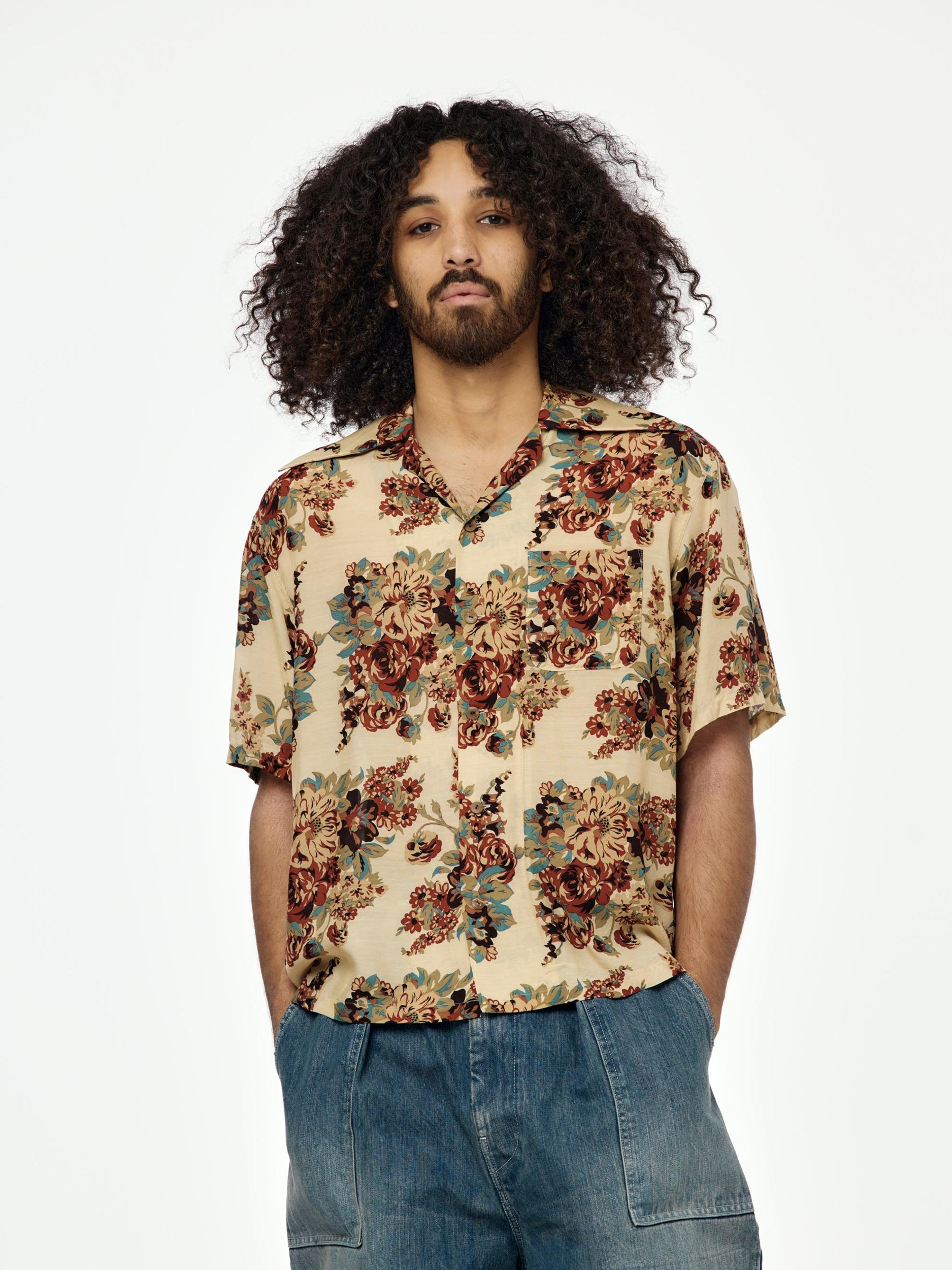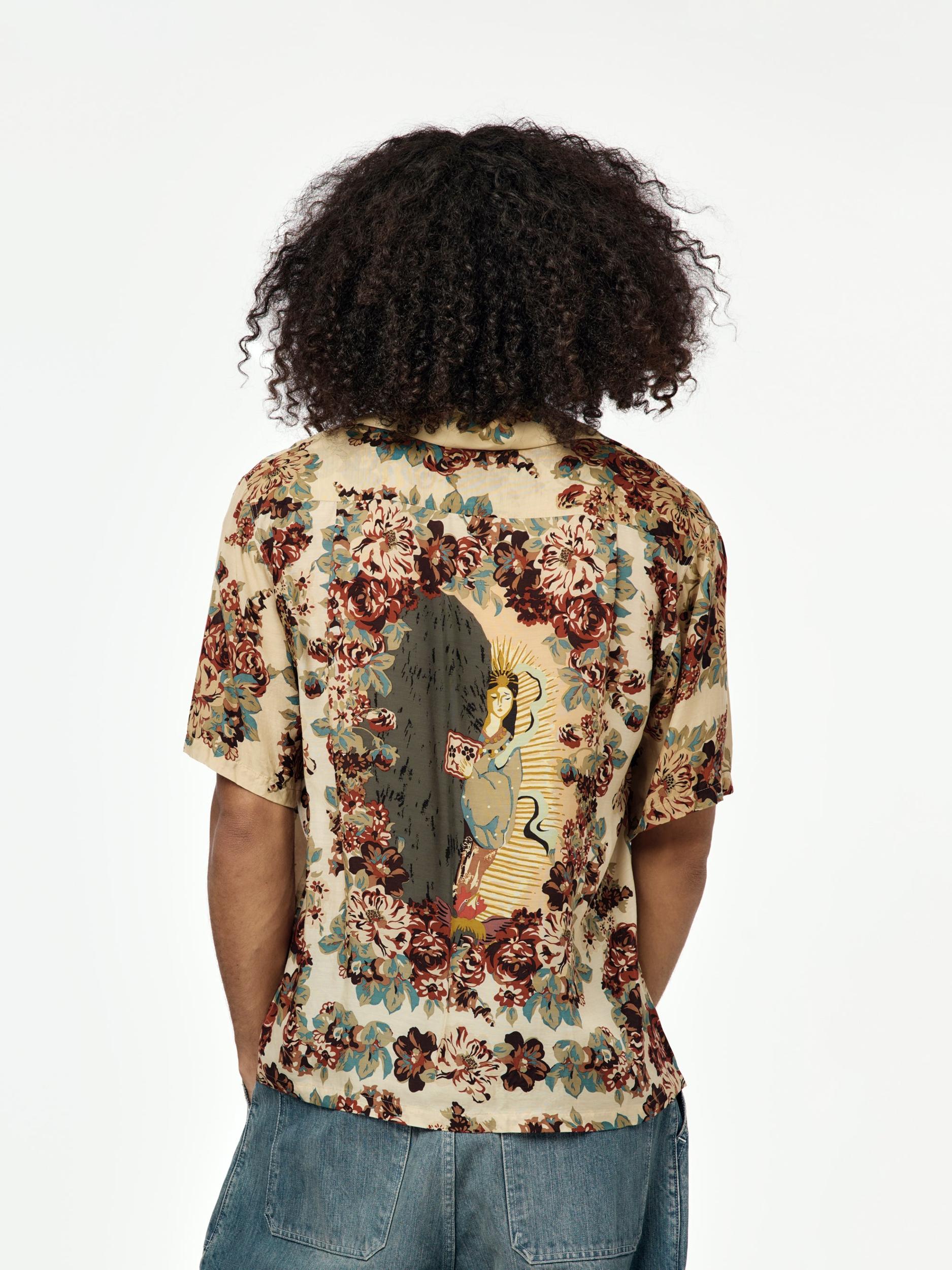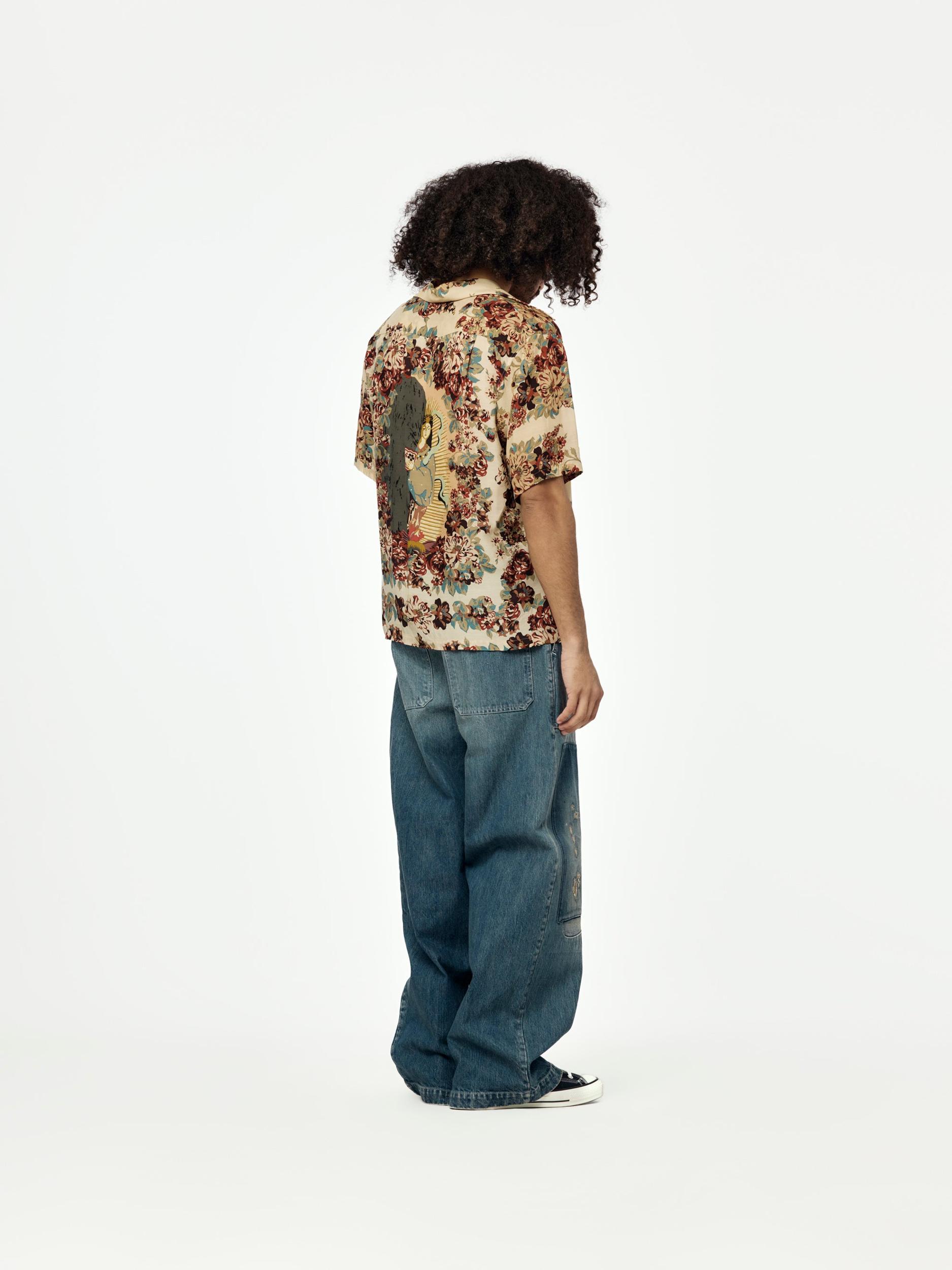 Kapital brings folklore to the fold with this silky aloha shirt, patterned in a floral champêtre print and finished with a back graphic of Amaterasu Omikami—sun goddess and one of the most revered figures in Japanese mythology. The illustration captures the mythic moment Amaterasu emerges from the Ama-no-Iwato cave, bringing light back into the world. Cut from lightweight cupra with a luxe drape, and styled with an oversized pointed collar for a dramatic finish. Each shirt is cut from all-over patterned fabric—no two are exactly alike. Made in Japan. SKU: K2505SS206