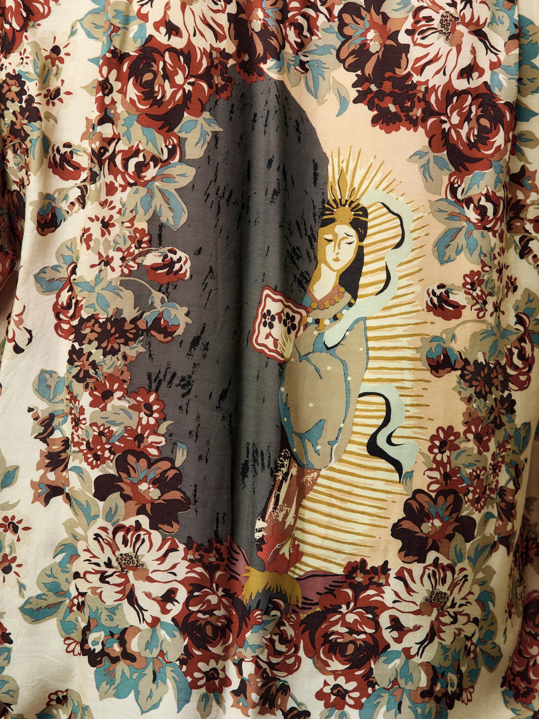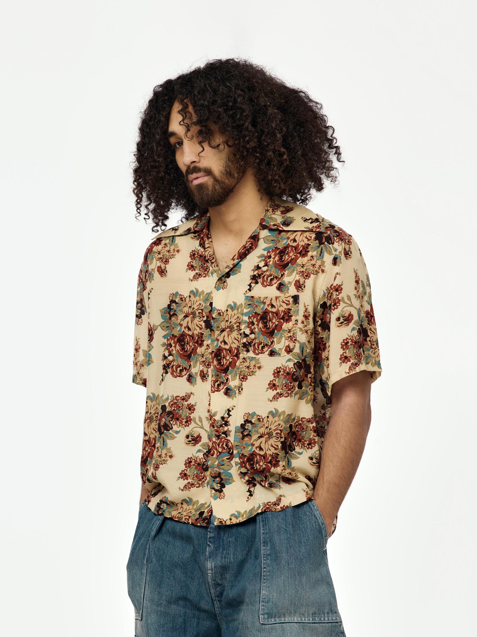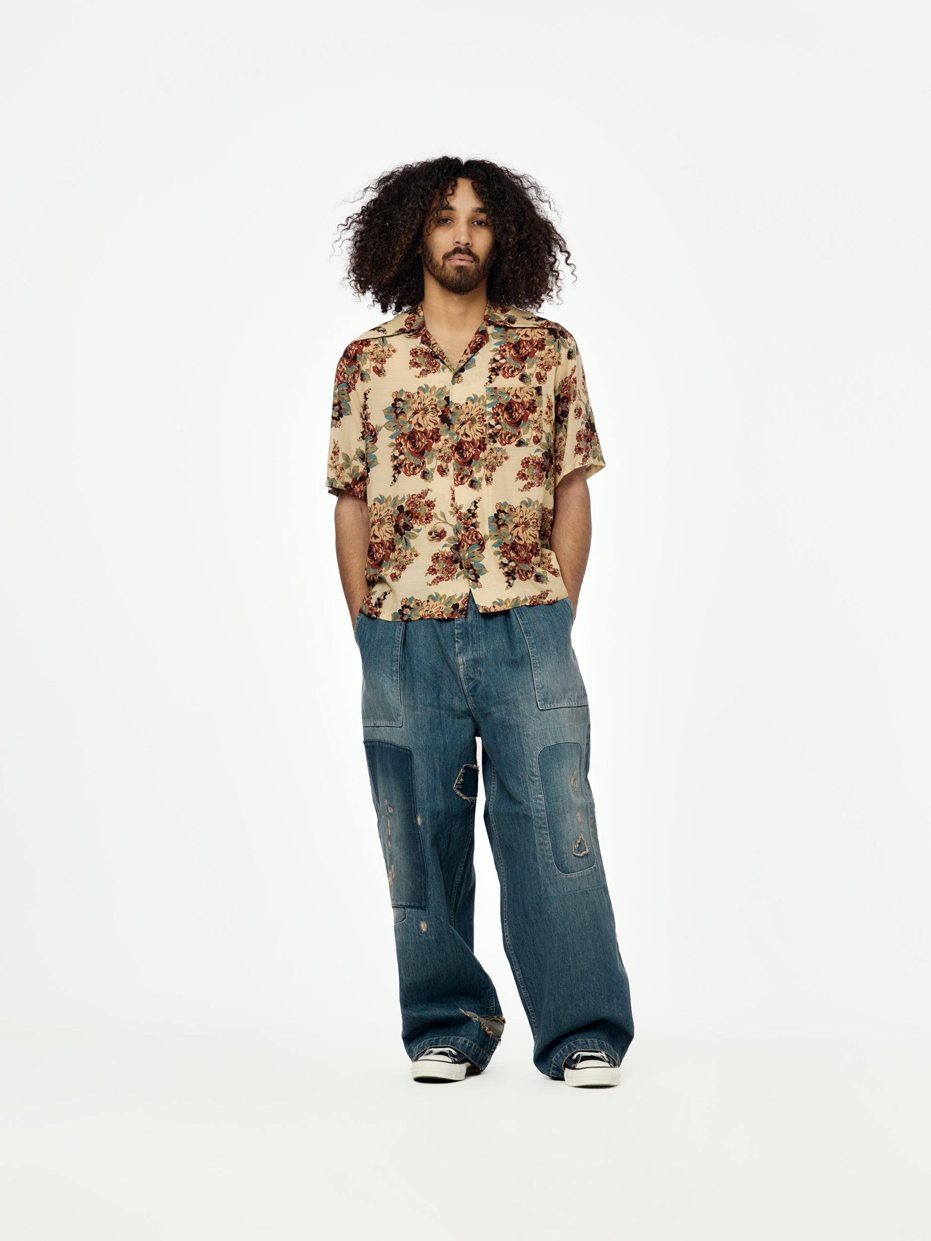 Kapital brings folklore to the fold with this silky aloha shirt, patterned in a floral champêtre print and finished with a back graphic of Amaterasu Omikami—sun goddess and one of the most revered figures in Japanese mythology. The illustration captures the mythic moment Amaterasu emerges from the Ama-no-Iwato cave, bringing light back into the world. Cut from lightweight cupra with a luxe drape, and styled with an oversized pointed collar for a dramatic finish. Each shirt is cut from all-over patterned fabric—no two are exactly alike. Made in Japan. SKU: K2505SS206