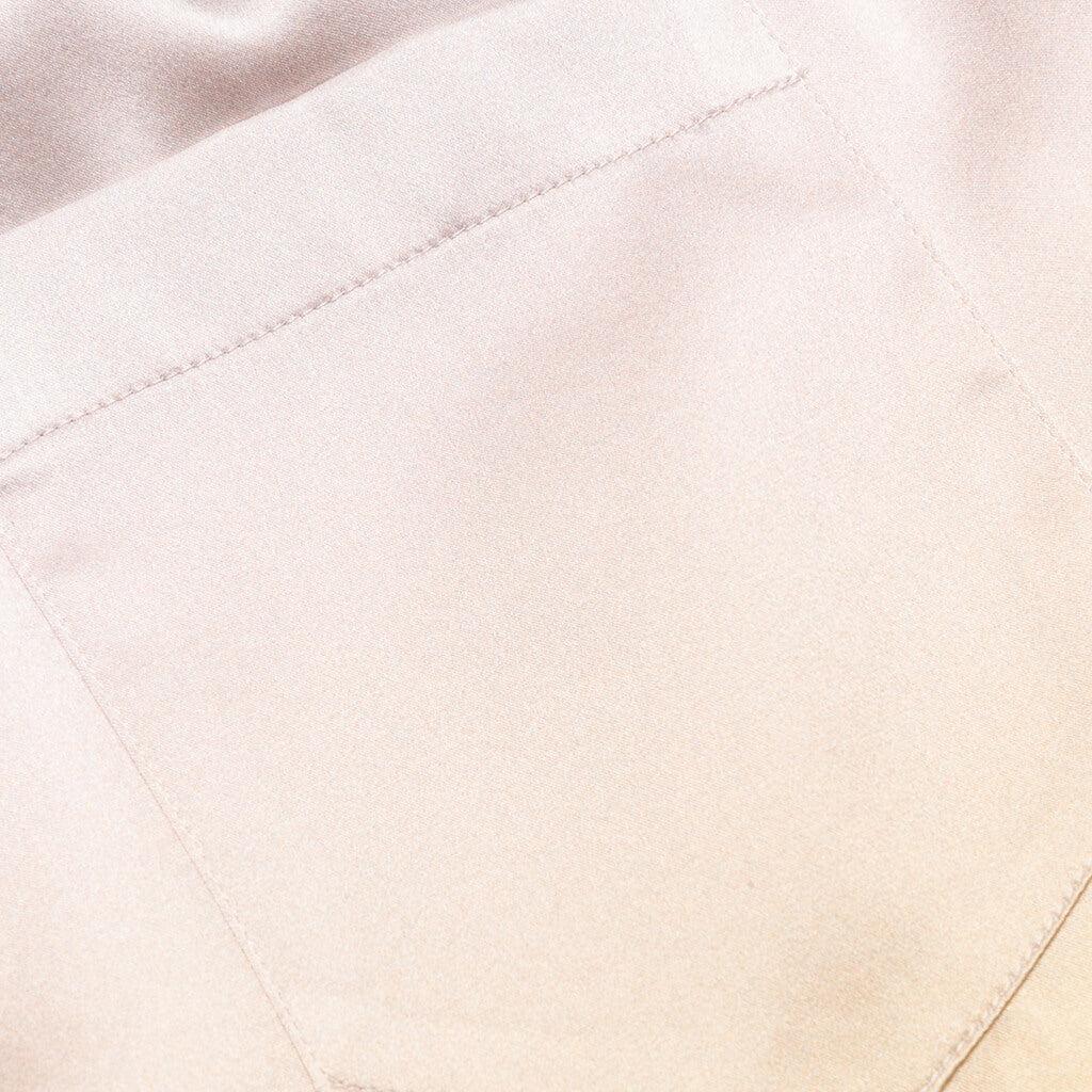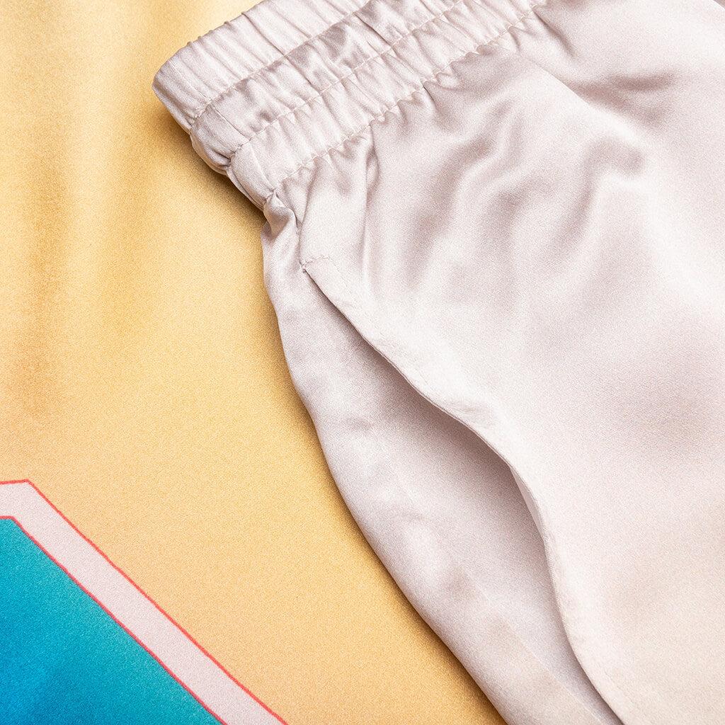 The L'arc Colore Satin from Casablanca are crafted from pure silk with a polyester lining for a smooth, comfortable fit. These pants feature side seam pockets, an elasticized waistband with a drawstring, and a concealed front button fastening for a tailored touch. A screen-printed design on the single back pocket adds a subtle yet refined detail, completing the look. 100% Silk Polyester lining Side seam pockets Drawstring Elasticized waistband Concealed front button fastening Screen printed design on back pocket Single back pocket Style No: MPF24-TR-012-01