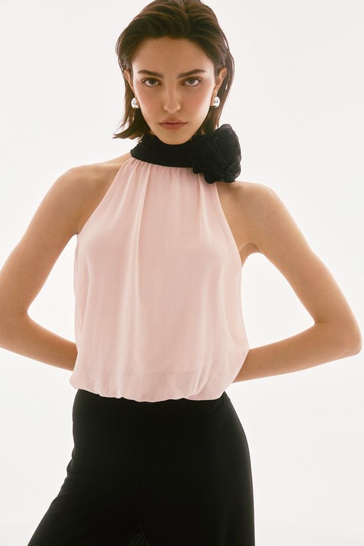 Look effortlessly chic in this wide leg jumpsuit, featuring a contrasting chiffon blouson top, a luxe knit bottom, and removable rosette detail. This relaxed fit one-piece offers a standout halter mock neckline with an adjustable open back bow tie. Perfect for any event!